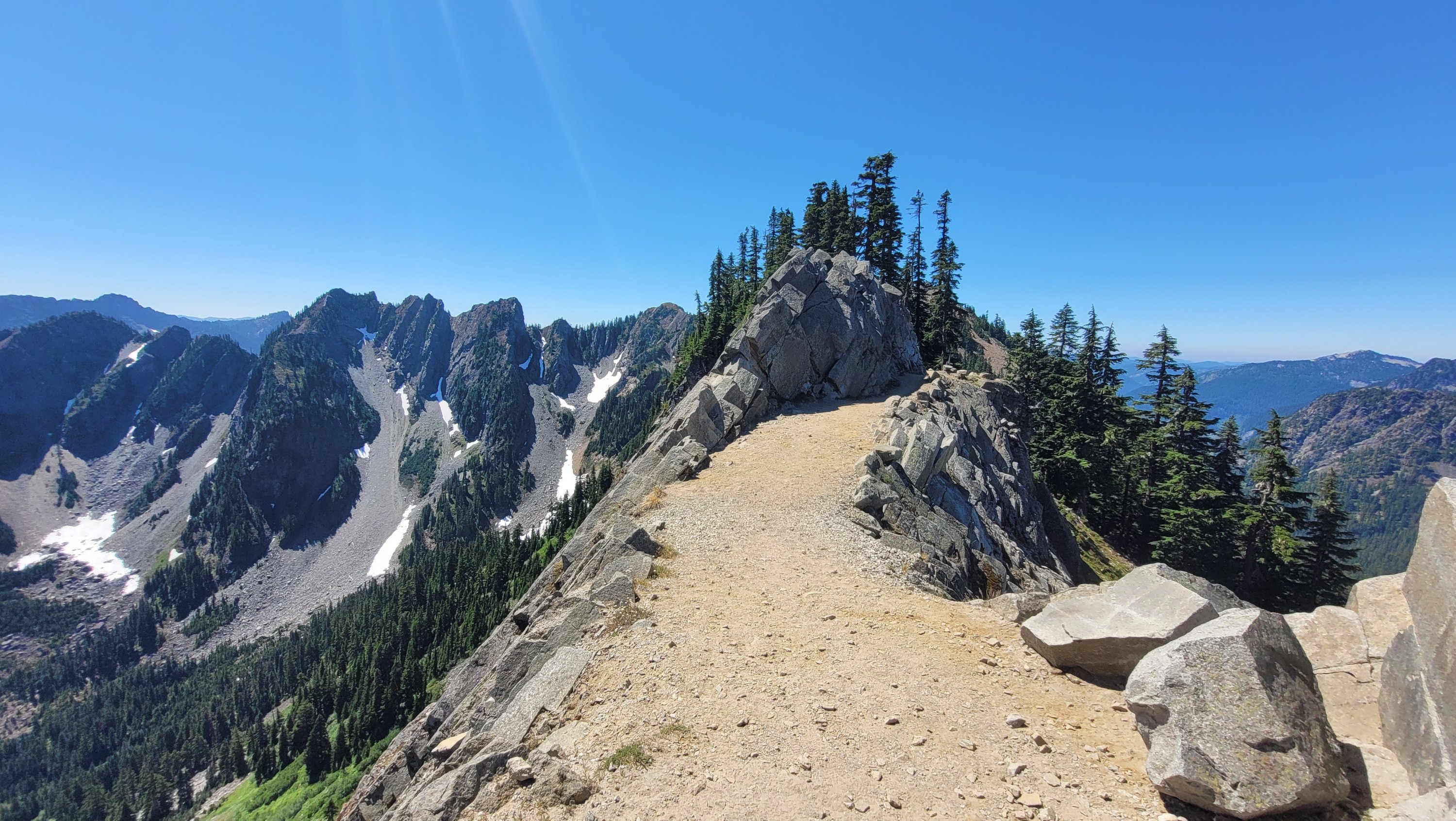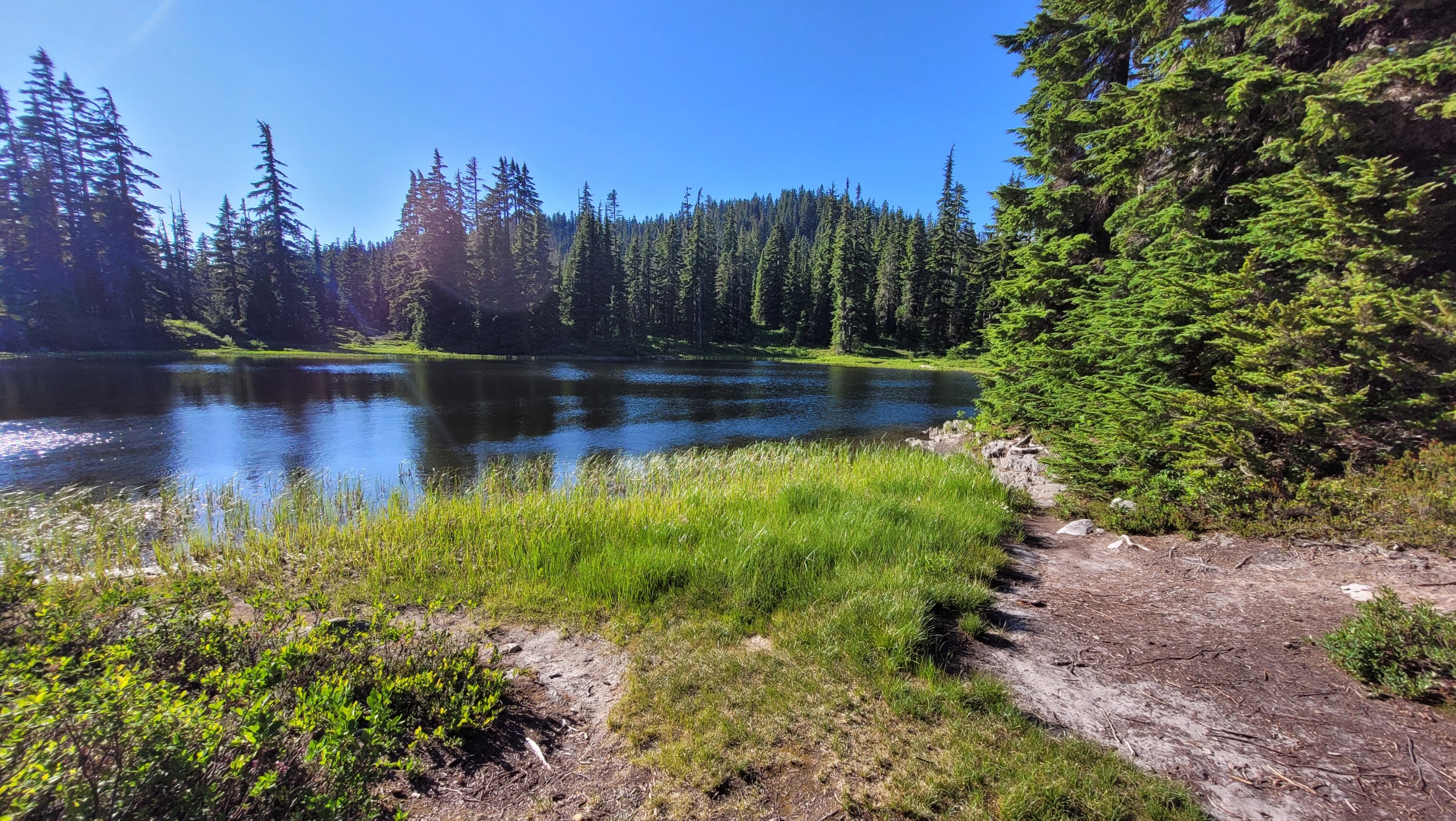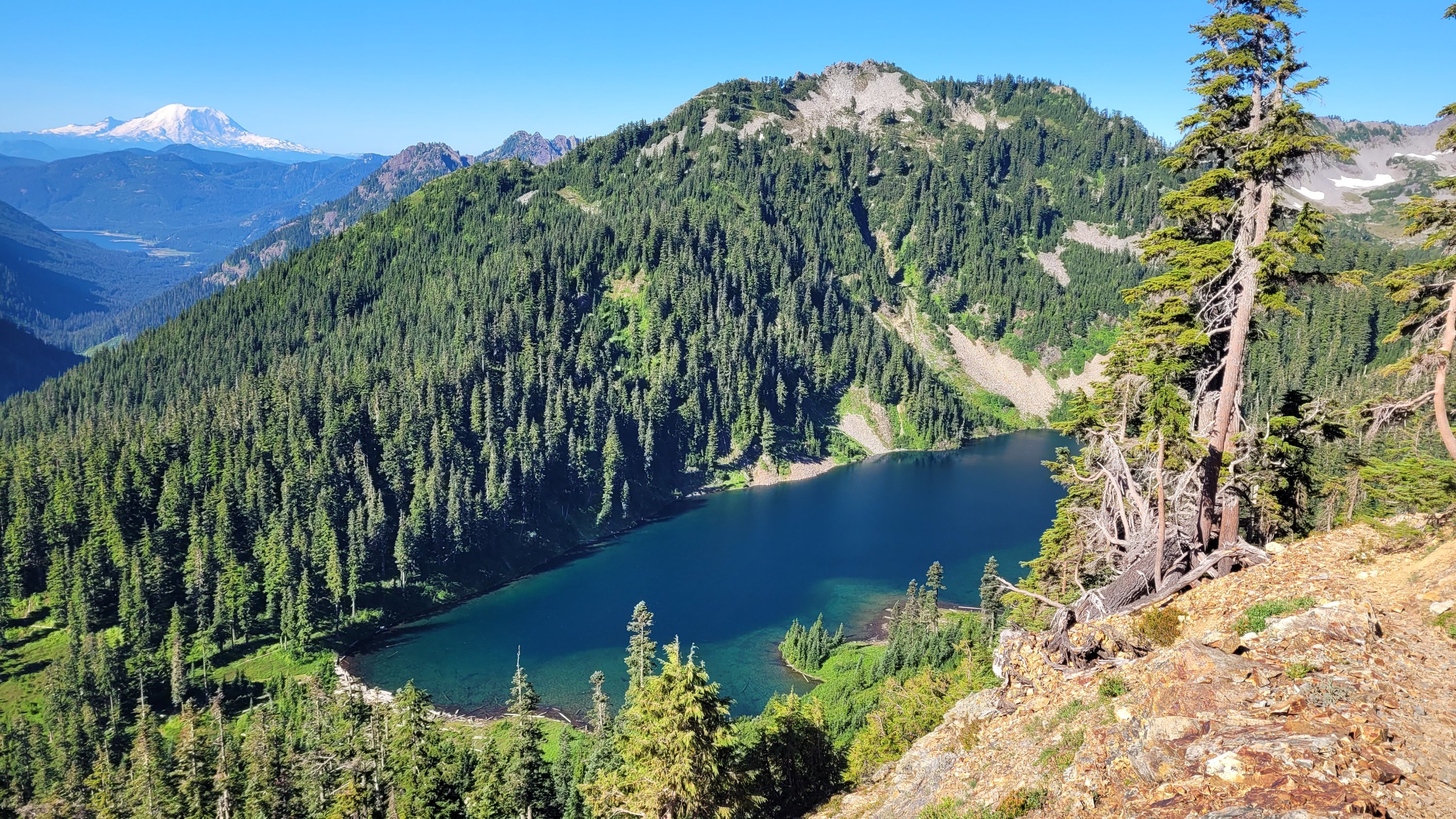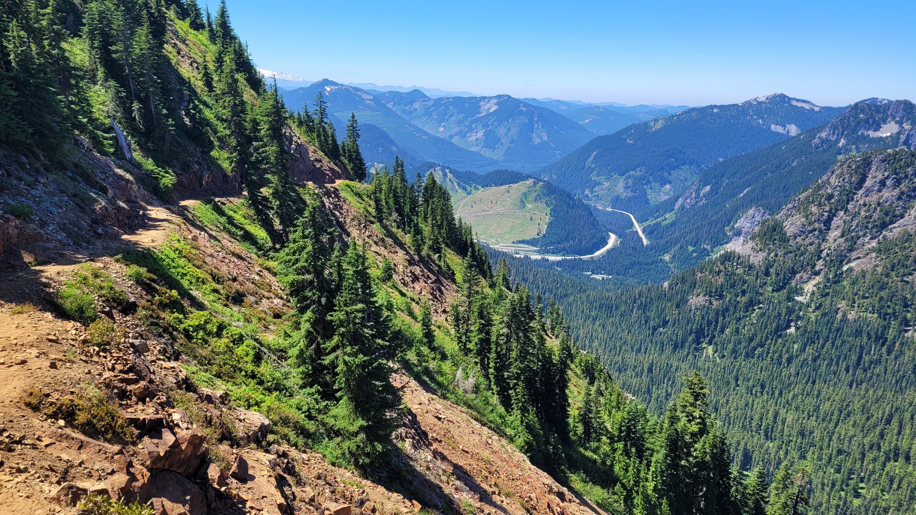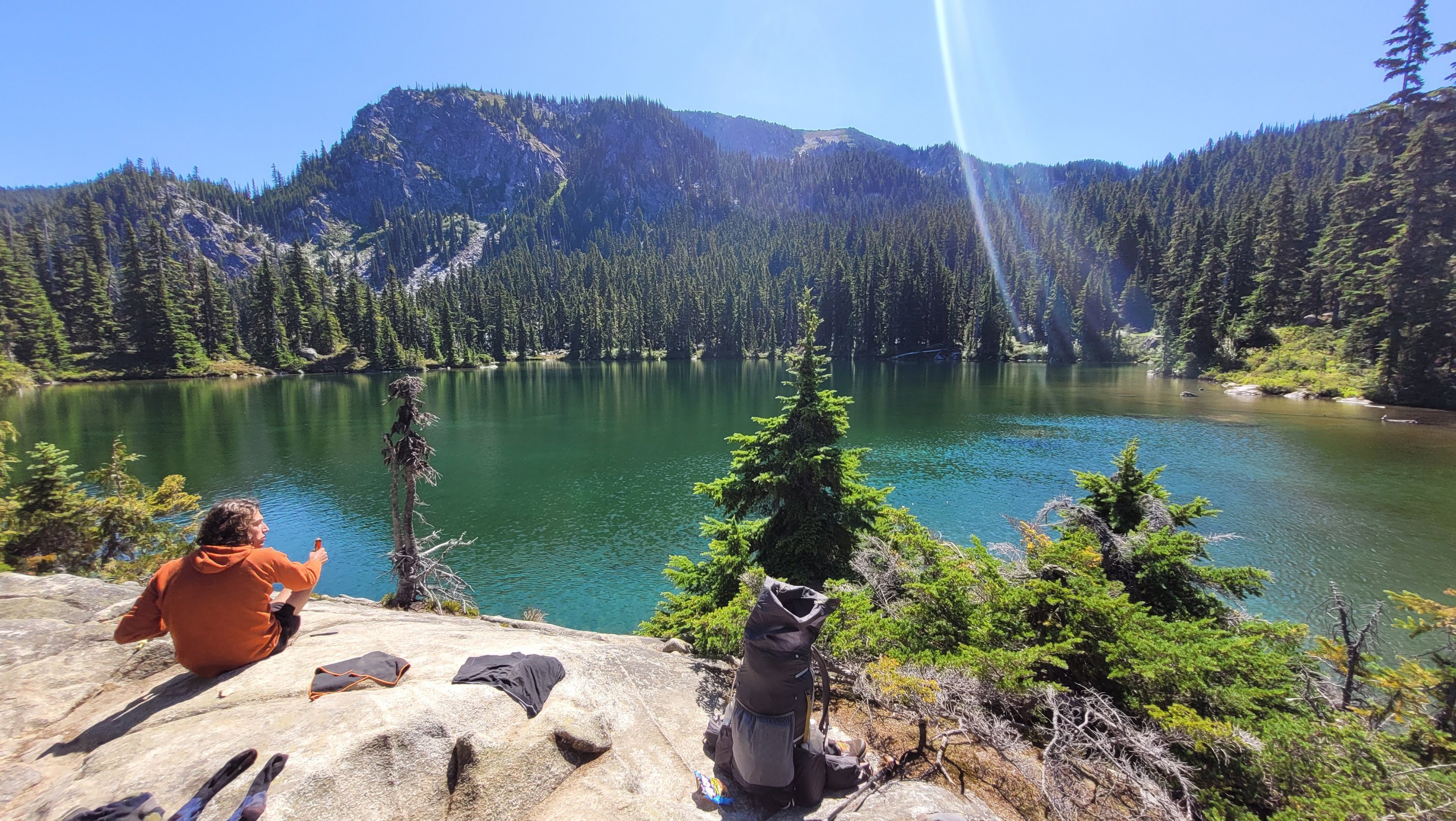 Das Ziel war näher an Snoqualmie zu kommen, so ist es immer noch ein recht langer Tag aber die Motivation Bacon Cheeseburger ist da. Nach einem kräftezertendem Aufstieg in der Sonne geht’s endlich in den Schatten. Der Weg ist steinig und steil aber macht unheimlich Spaß. Ich ziehe voll durch und laufe gute 6kmh. Gegen Mittag komme ich an einem See vorbei und springe kurz rein um mich zu erfrischen. Snoqualmie ist sehr beliebt und so kommen mir dutzende Tages Wanderer entgegen. Als ich dann von oben die Straße sehe sind es nur noch knapp 10km, ich renne fast. Nichts kann mich abhalten, doch dann ist dort plötzlich Trail magic. 2 Frauen haben Snacks und Getränke für pct hiker aufgebaut und ich beschließe hier ein paar Stunden zu entspannen und spare mir das Geld für die erste Mahlzeit. Ich stopfe alles rein was geht und trinke knapp 3L in Form von Cola und Bier. Das war absolut notwendig. Anstrengender Tag aber es geht gut vorwärts und der Körper scheint sich langsam daran zu gewöhnen das er laufen muss. Meine 2te Mahlzeit in Snoqualmie wurde anonym von jemandem bezahlt… Sowas passiert nur hier.