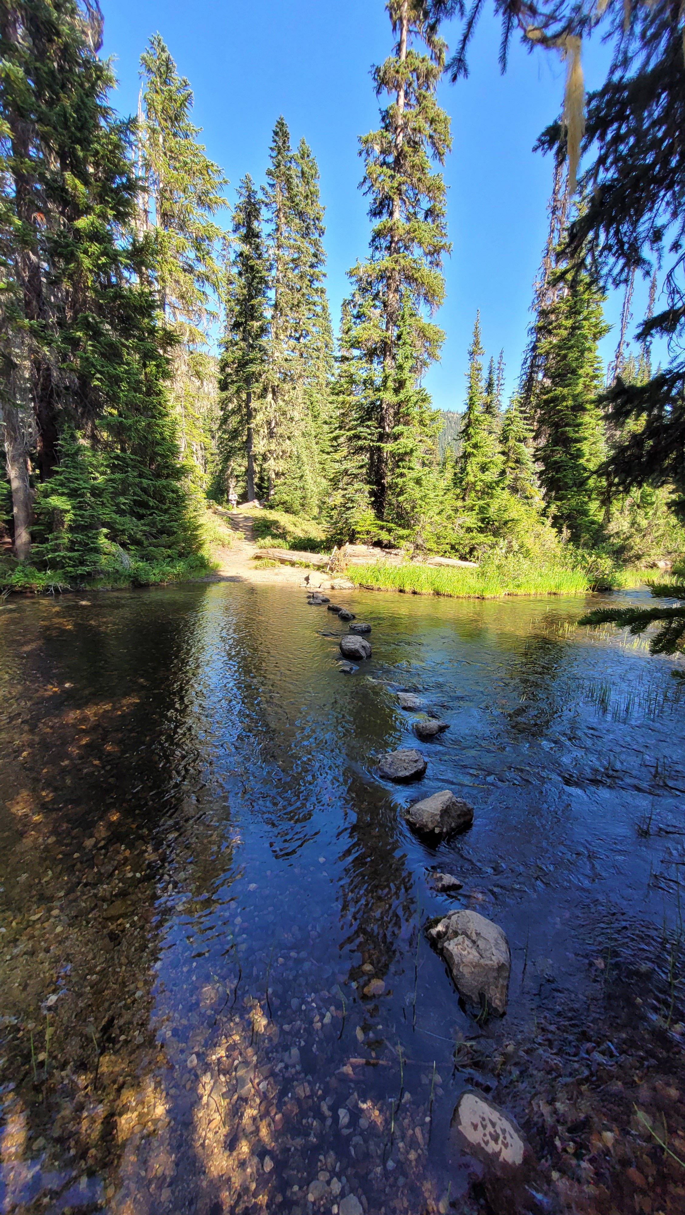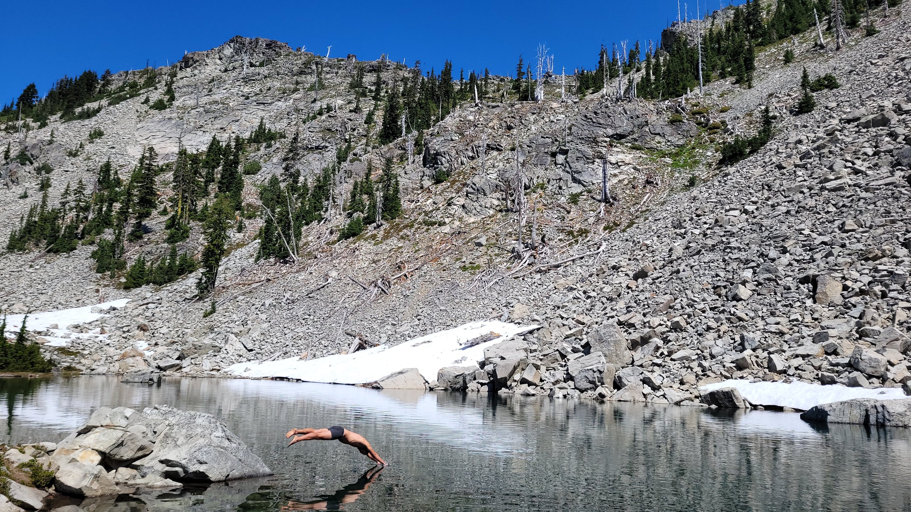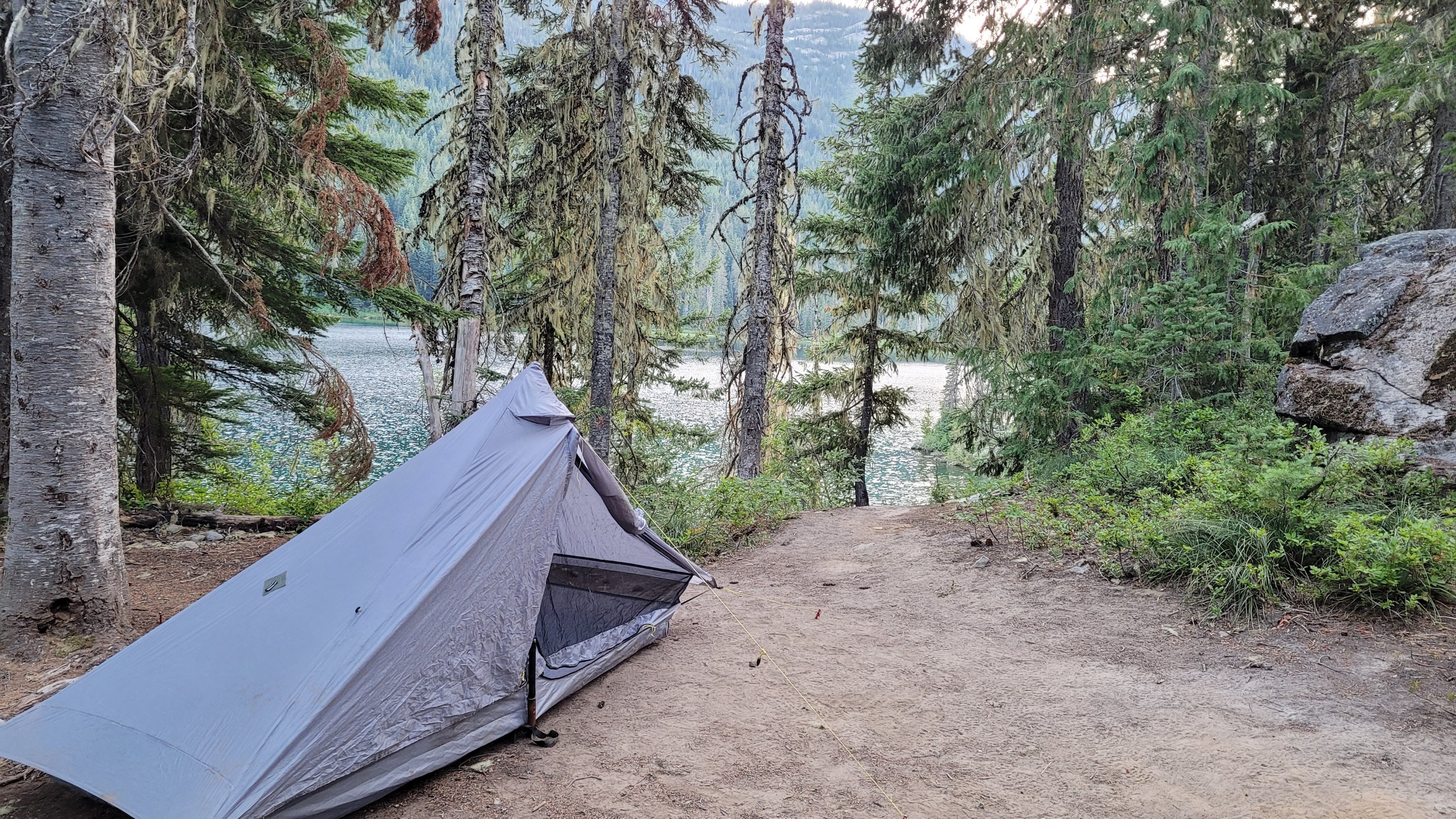 Früh ist mir aufgefallen das ich vor 3 Jahren genau an derselben Stelle gezeltet habe. Es ging dann wie immer Achterbahn mäßig hoch und runter, die Landschaft gleicht die Anstrengung aus. Die Hitze macht mir unheimlich zu schaffen, es sind teilweise über 30 Grad und Wolken findet man fast nie. Nach 10 Tagen auf Trail habe ich gefühlt mehr Sonne gesehen als in Jahren in Deutschland. Mittags kam dann ein wunderschöner See zum Baden. Die Mosquitos und Fliegen sind richtig nervig. Alles beißt und kratzt. Nach einem langen Tag mit vielen Blowdowns (umgestürzten Bäumen) am Ende hab ich einen entspannten Platz an einem See. Wieder leicht vor den anderen.
