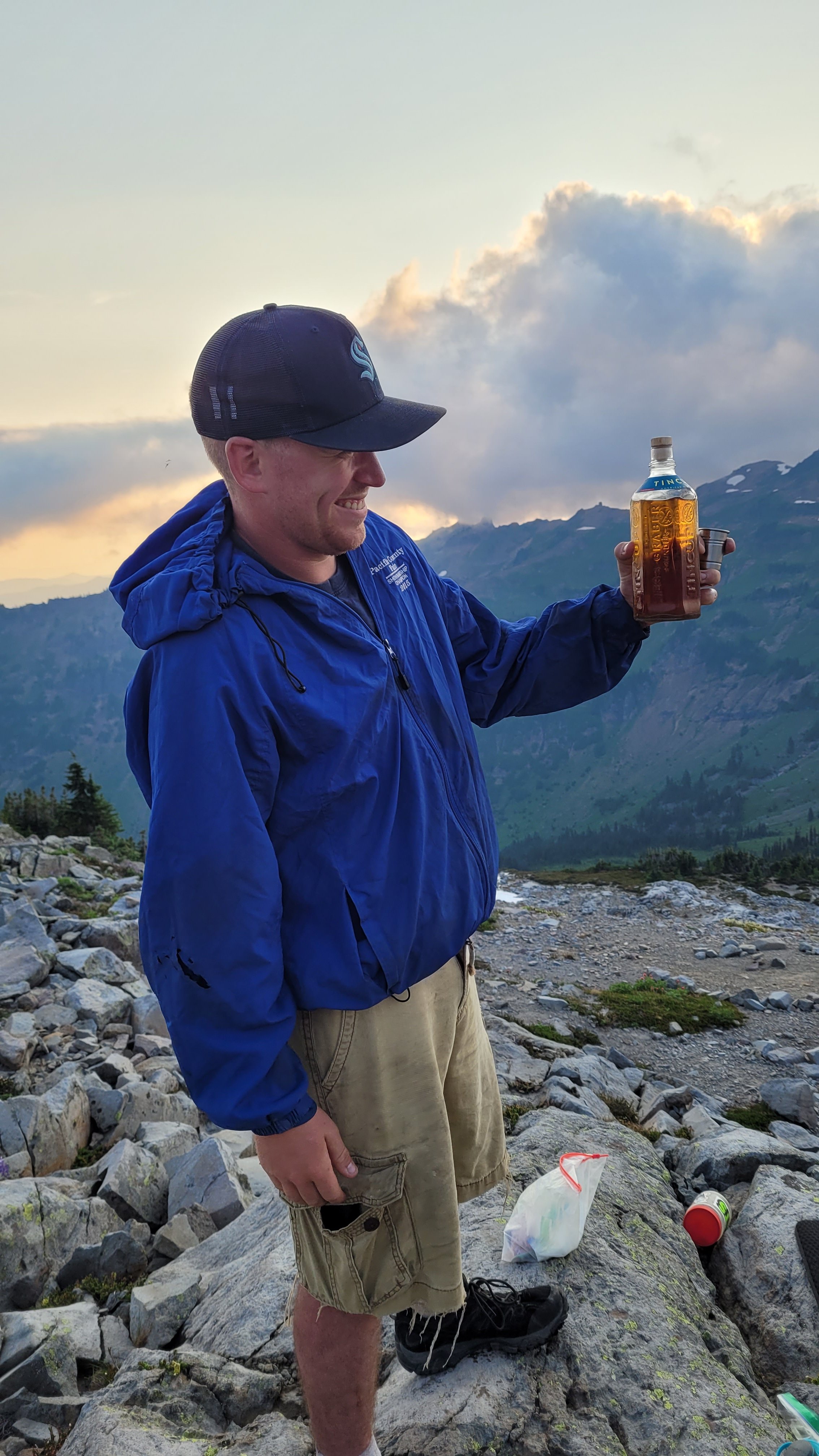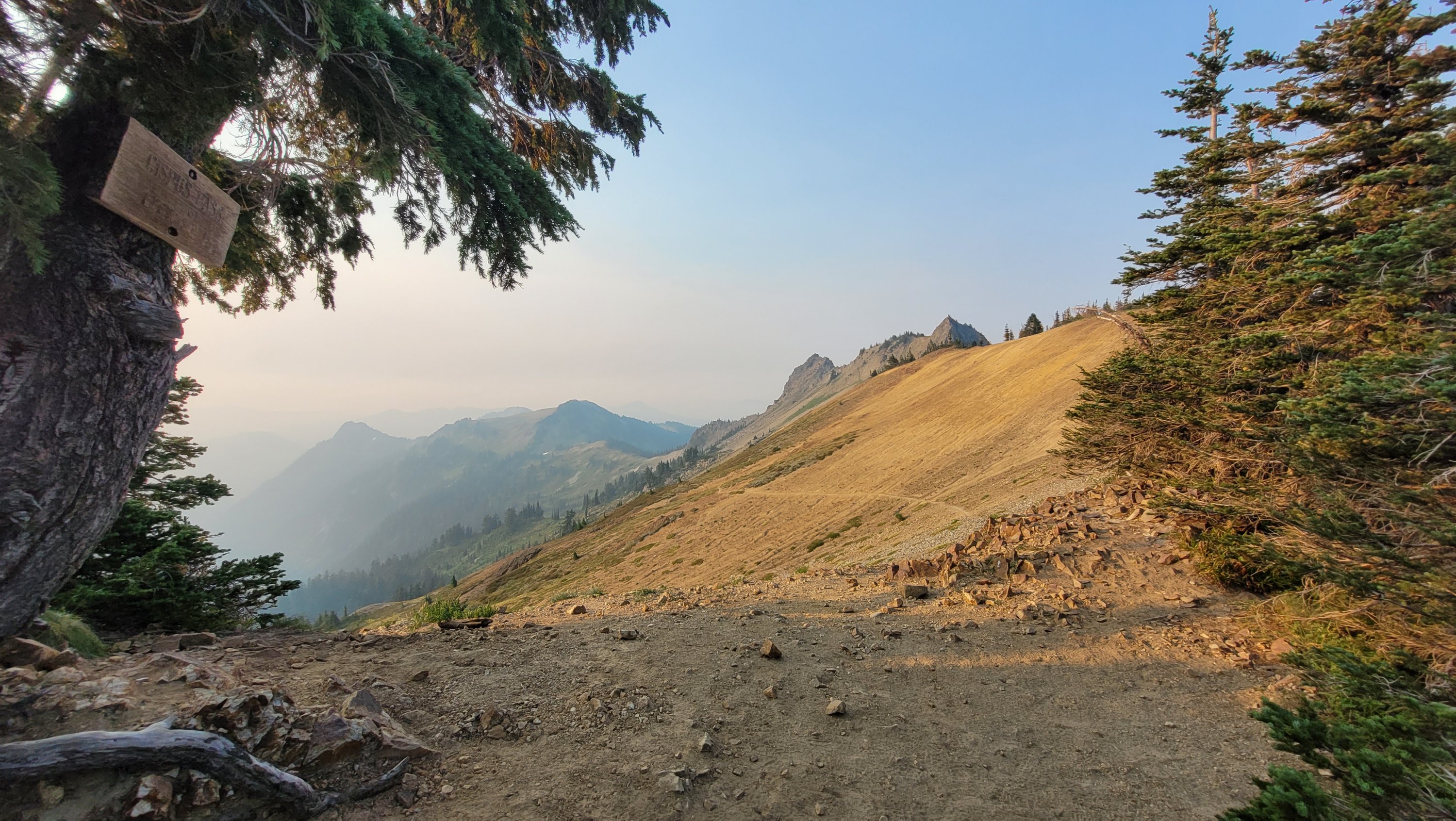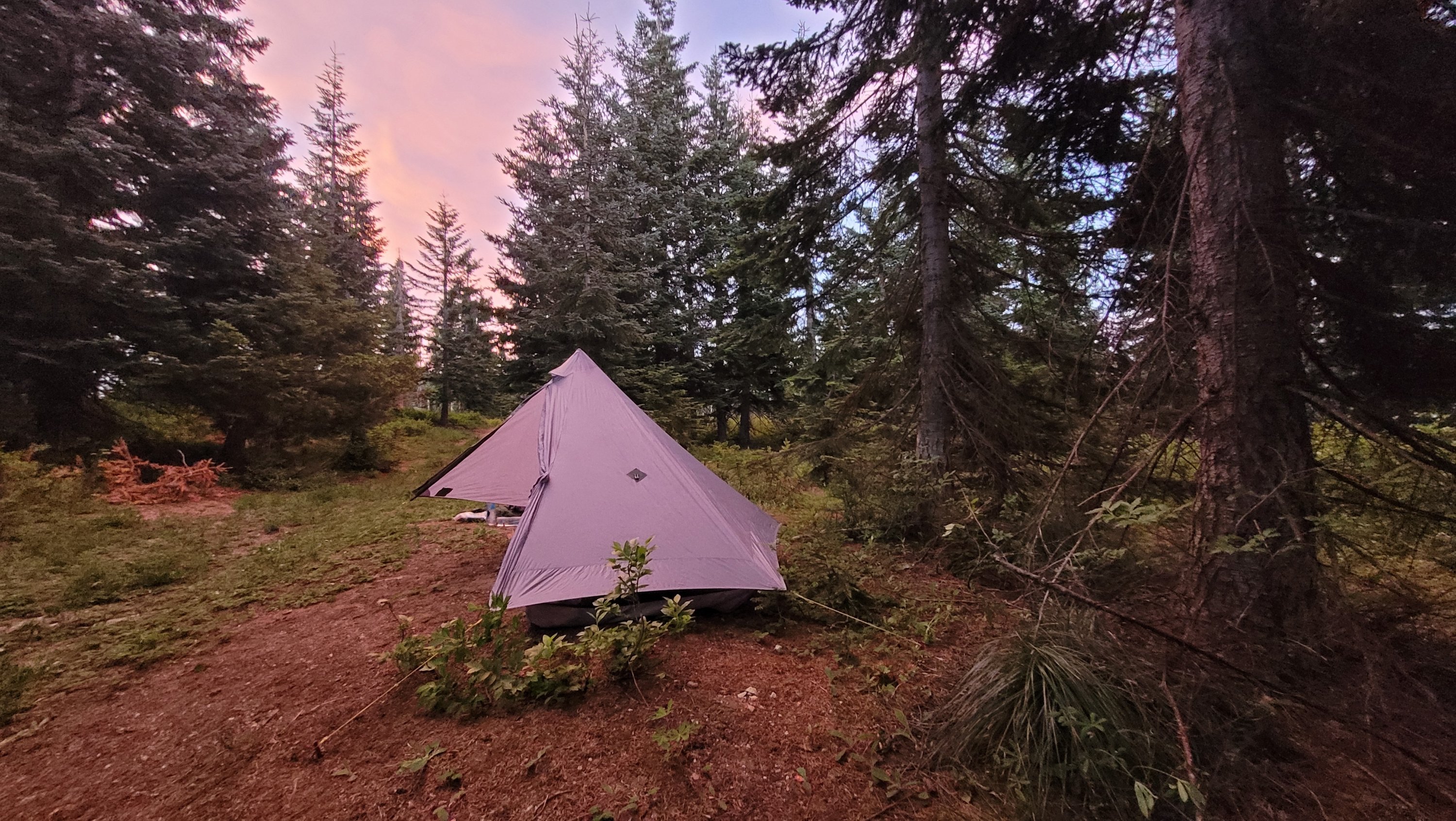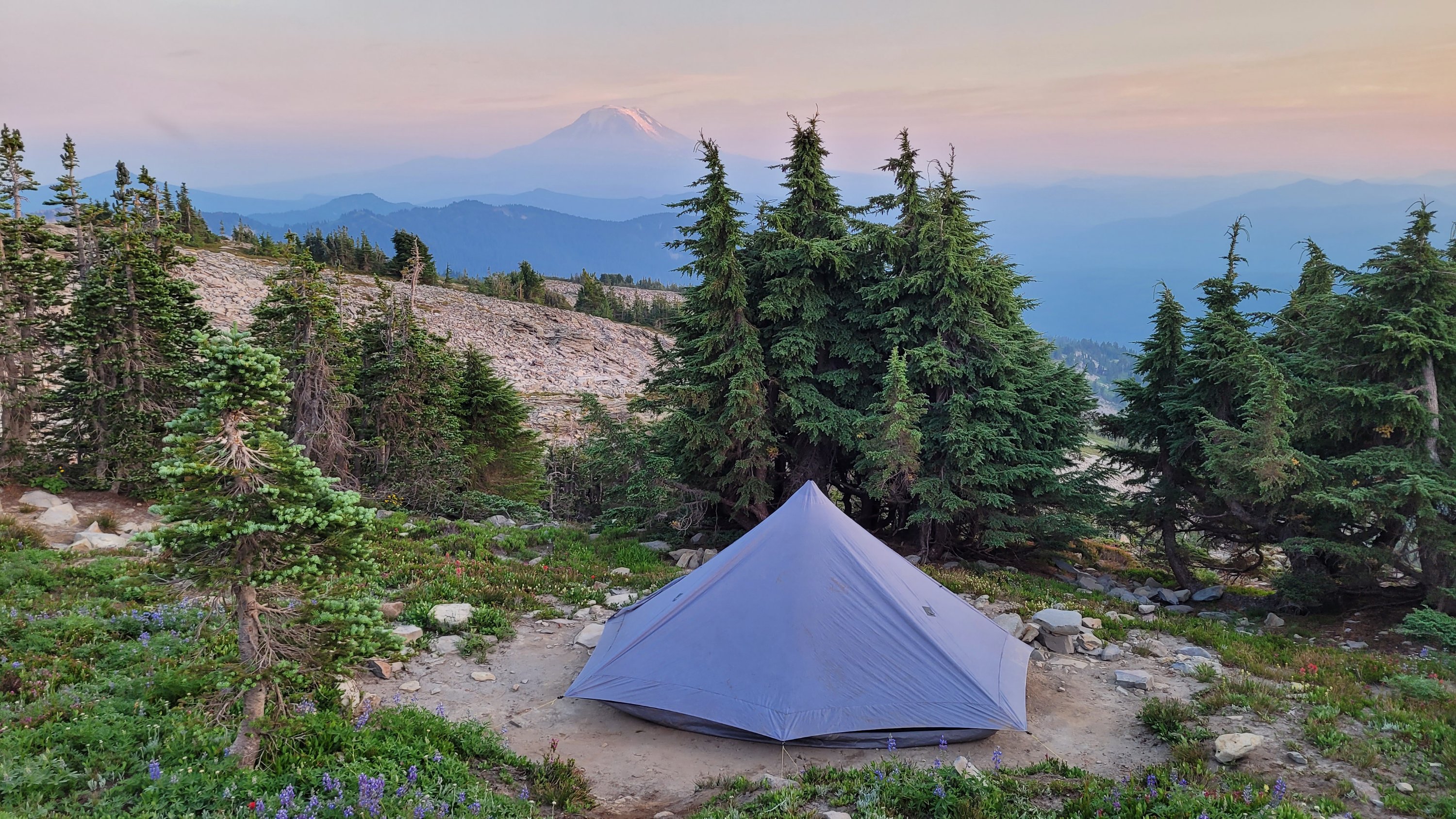 Heute ging es hinauf zu den bekannten Goat Rocks. Leider war die Sicht durch Rauch von umliegenden Feuern stark beeinflußt. Die Landschaft war ein absolutes Highlight von Washington und ich habe noch einen kleinen Umweg über den Old Snowy Mountain eingelegt. Vom Campingplatz hatte ich dann einen entspannten Sonnenuntergang und konnte etwas Whisky von den Wochenend Hikern schnorren. Vom Zelt aus sieht man Mt Adam’s, den nächsten Vulkan auf der Liste.