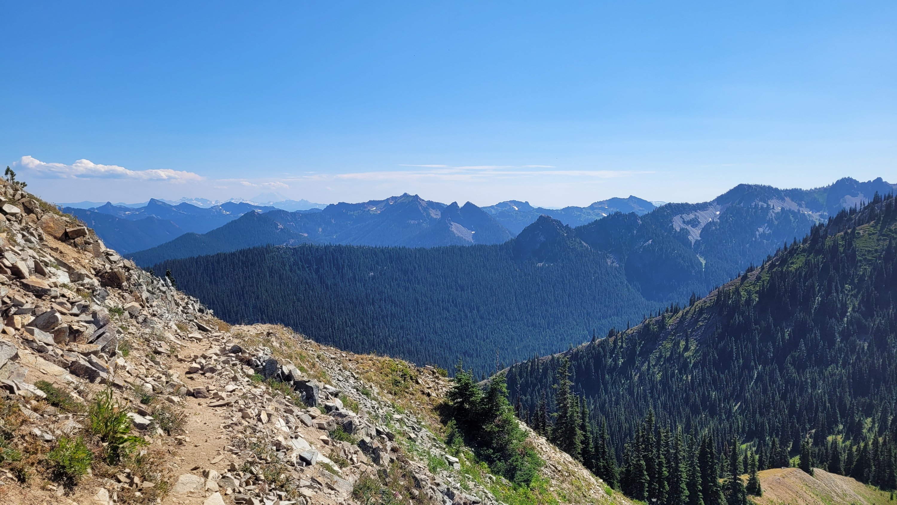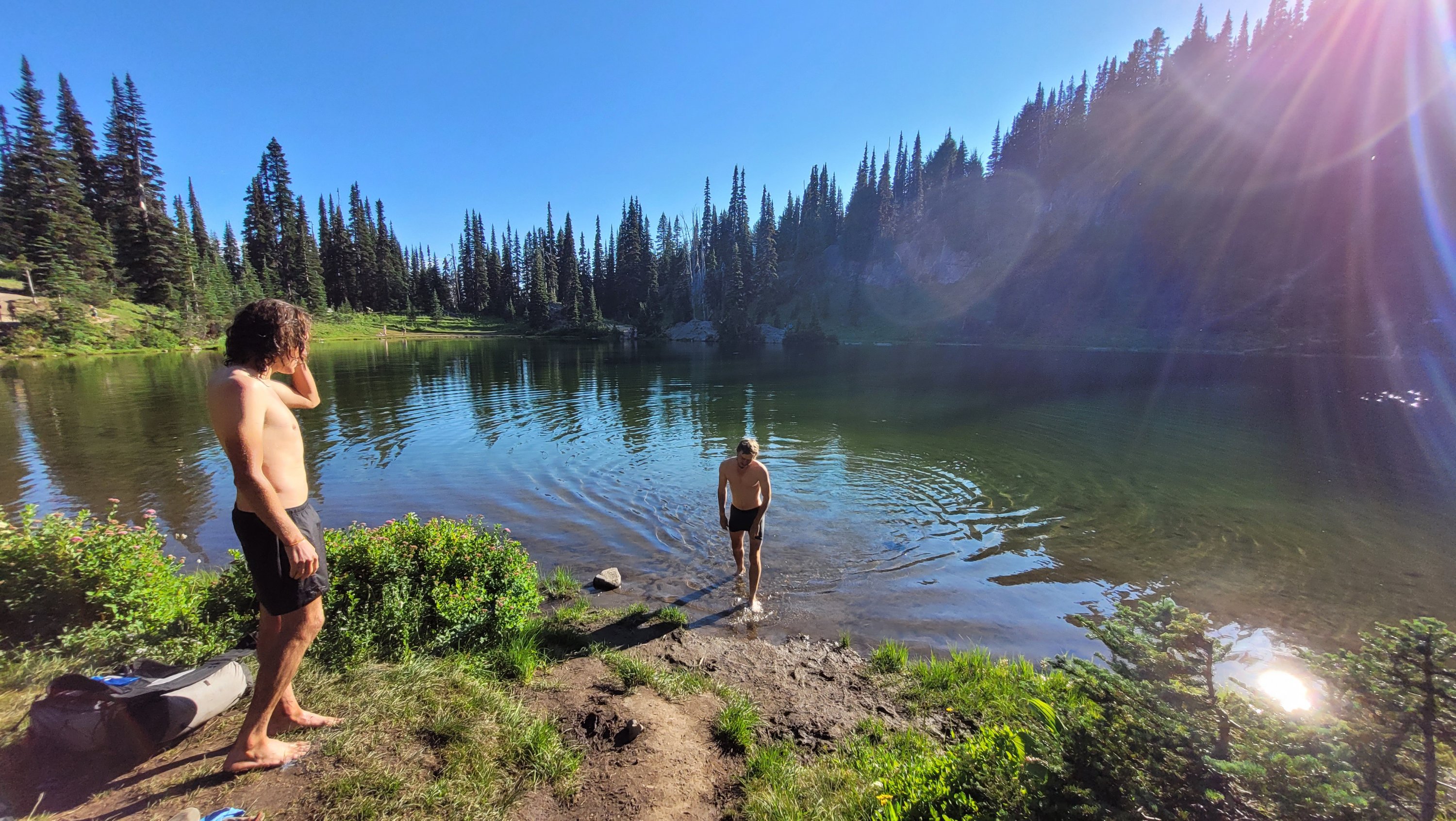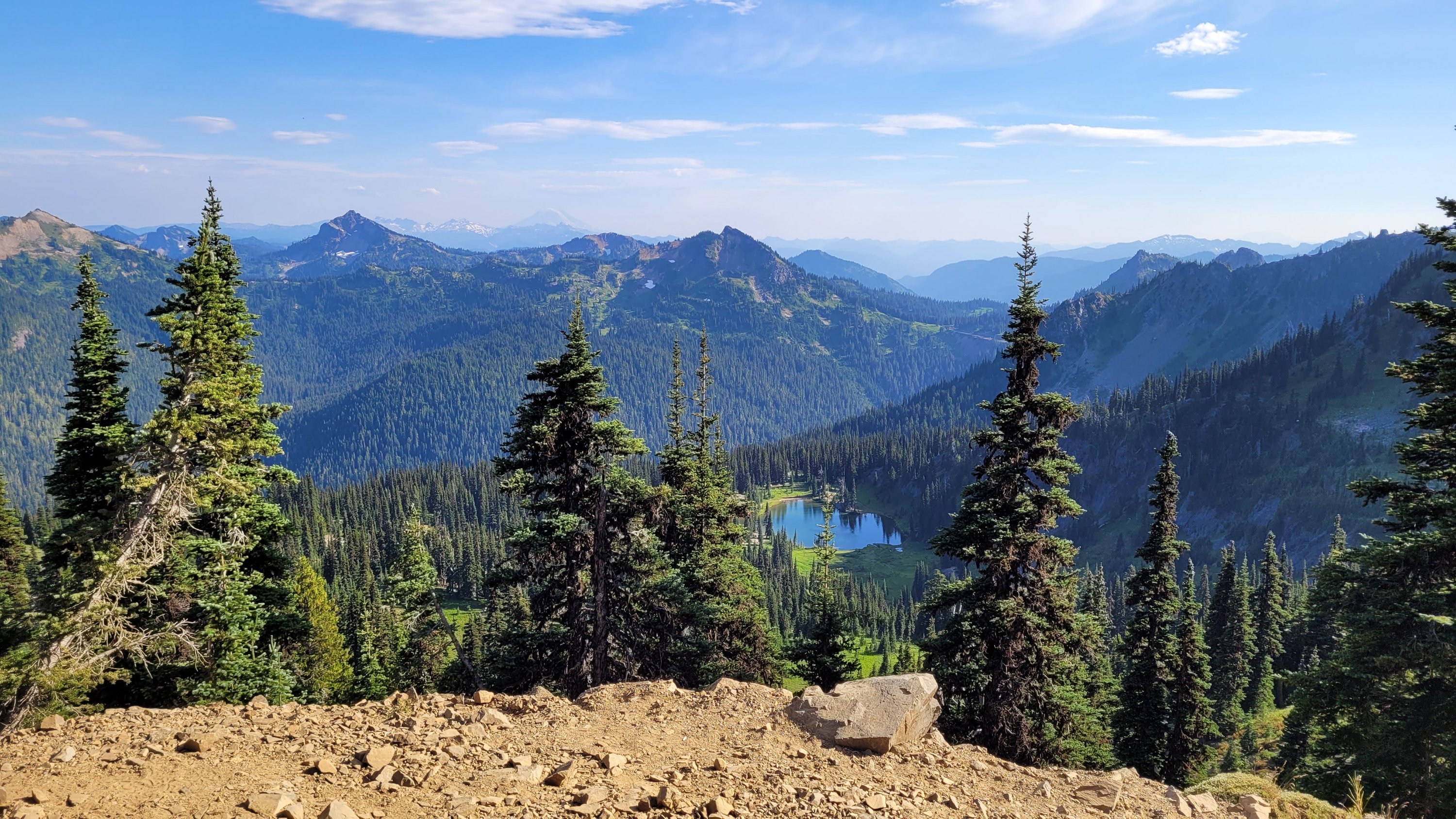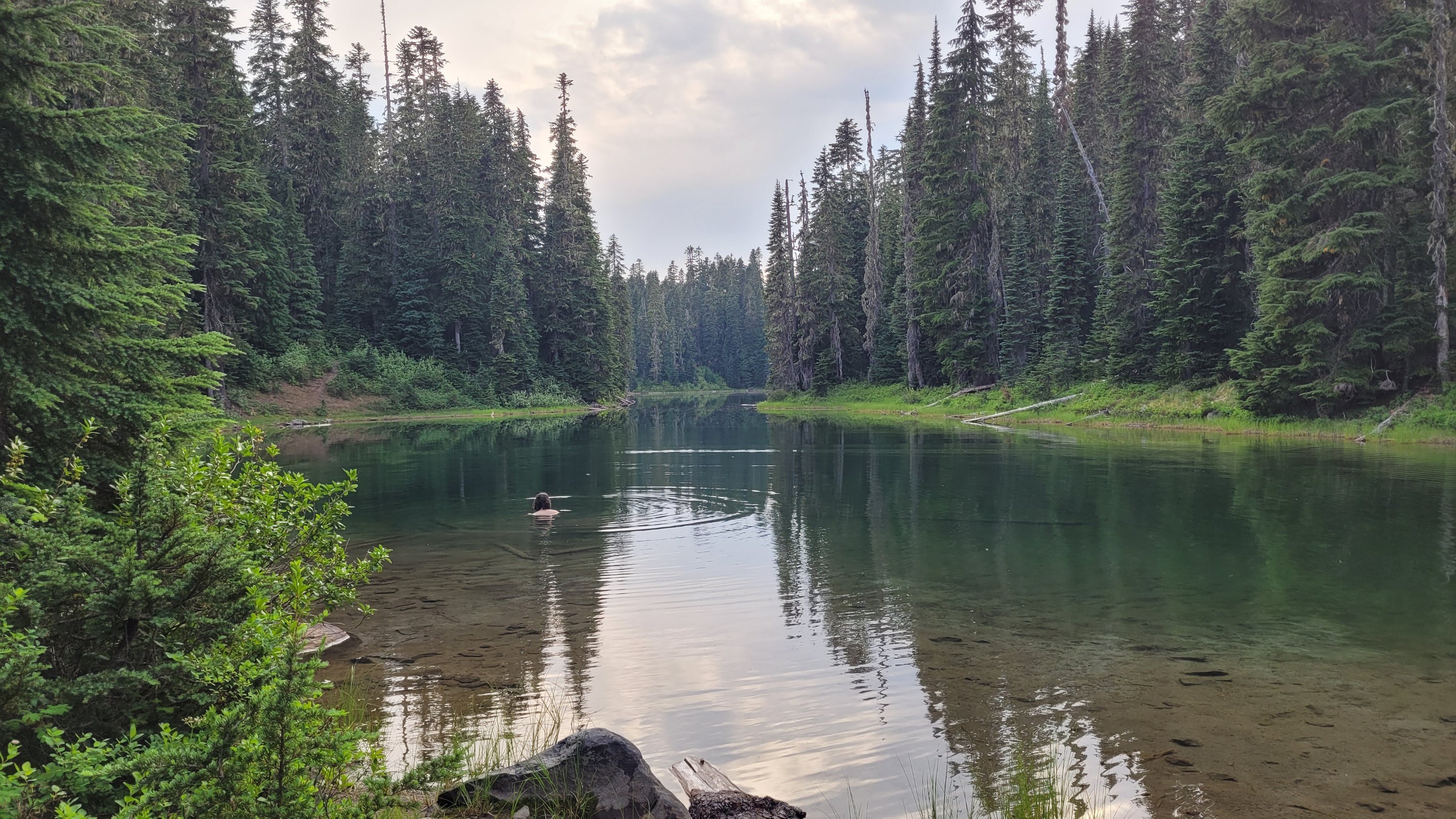 Es war so heiß, selbst nachts hab ich meinen Schlafsack nicht mal berührt. Früh nachdem man den Highway 27 überquert hat kam noch genau ein See in den ich fix springen konnte, danach ging das Unheil los. Mücken die einfach nicht enden, dazu Hitze und feuchtes Klima. Man hatte ein paar nette Aussichten auf Mt Rainier, den höchsten Berg von Washington. Nach endlosen Meilen durch eintönige Landschaft und Mücken musste ich sogar in meinem Zelt essen.