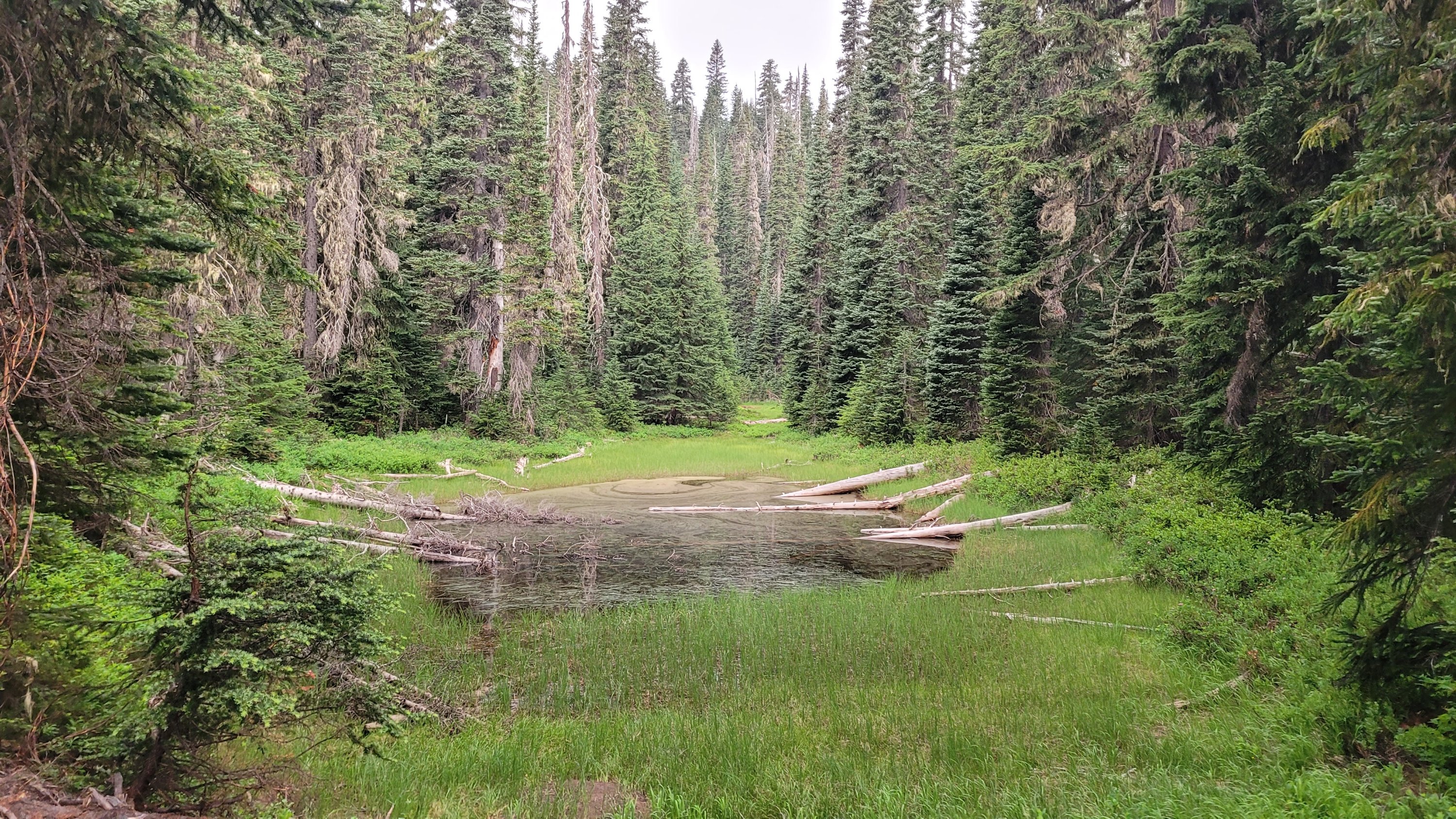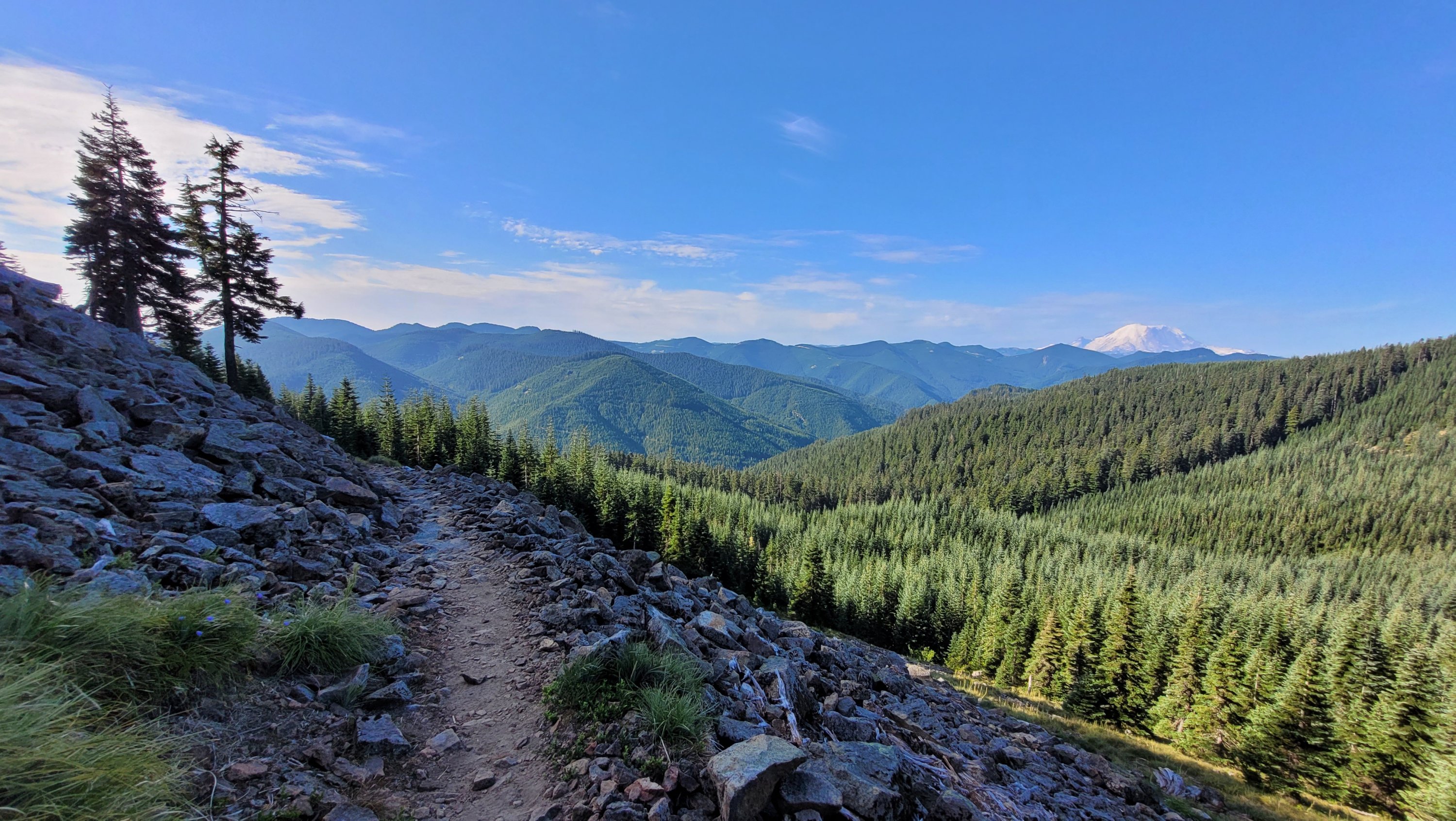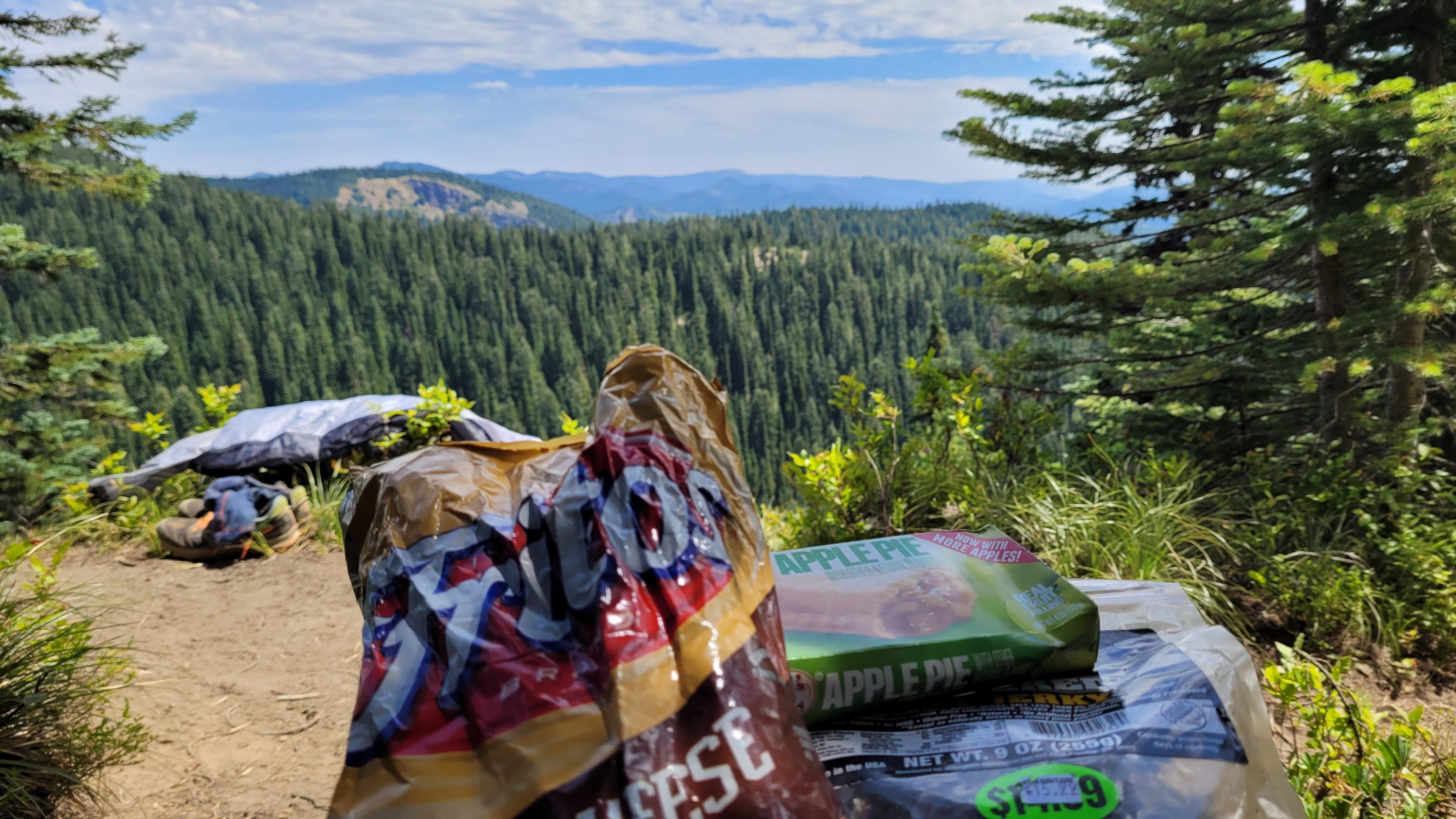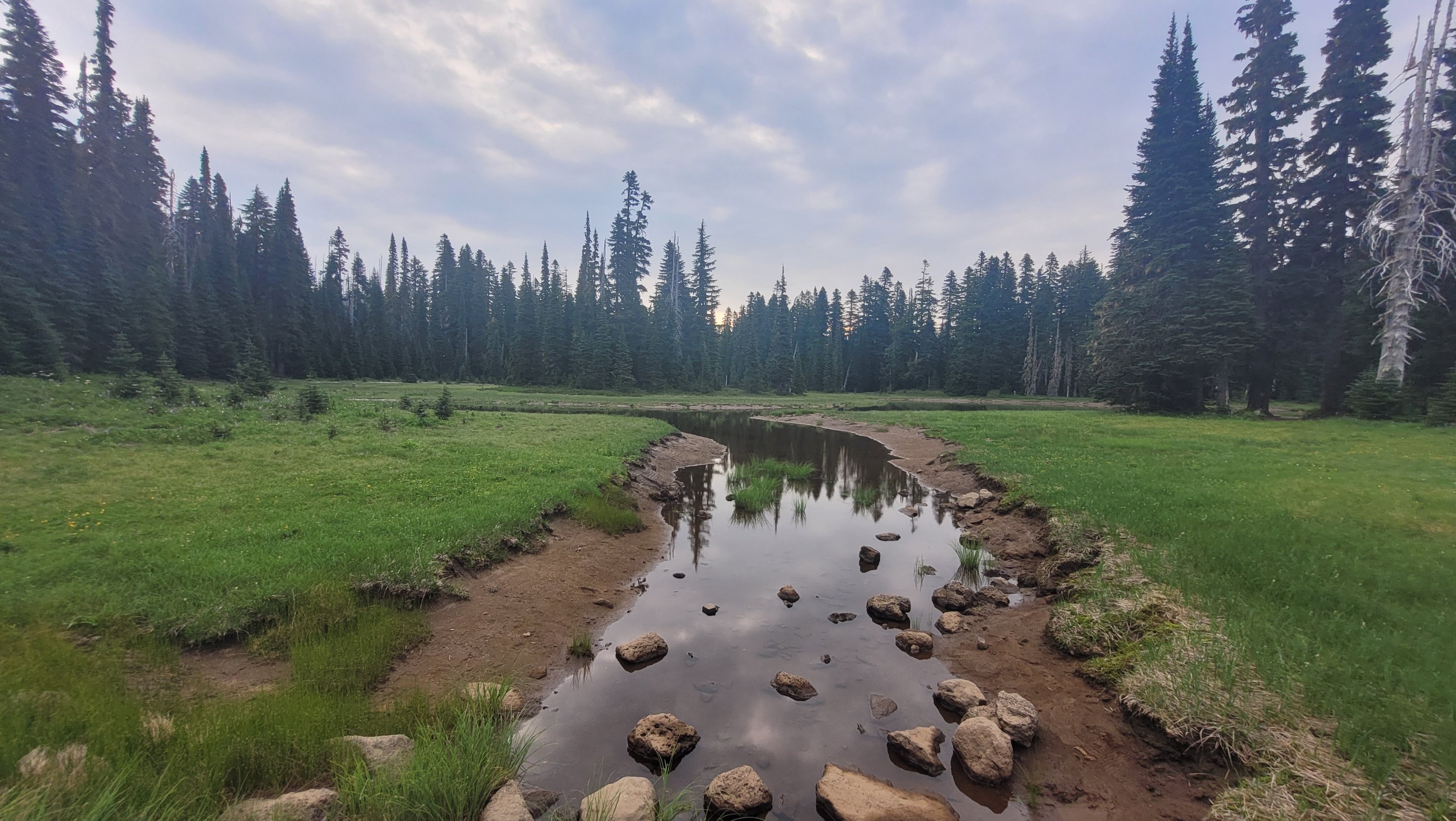 Es war so heiß, selbst nachts hab ich meinen Schlafsack nicht mal berührt. Früh nachdem man den Highway 27 überquert hat kam noch genau ein See in den ich fix springen konnte, danach ging das Unheil los. Mücken die einfach nicht enden, dazu Hitze und feuchtes Klima. Man hatte ein paar nette Aussichten auf Mt Rainier, den höchsten Berg von Washington. Nach endlosen Meilen durch eintönige Landschaft und Mücken musste ich sogar in meinem Zelt essen.