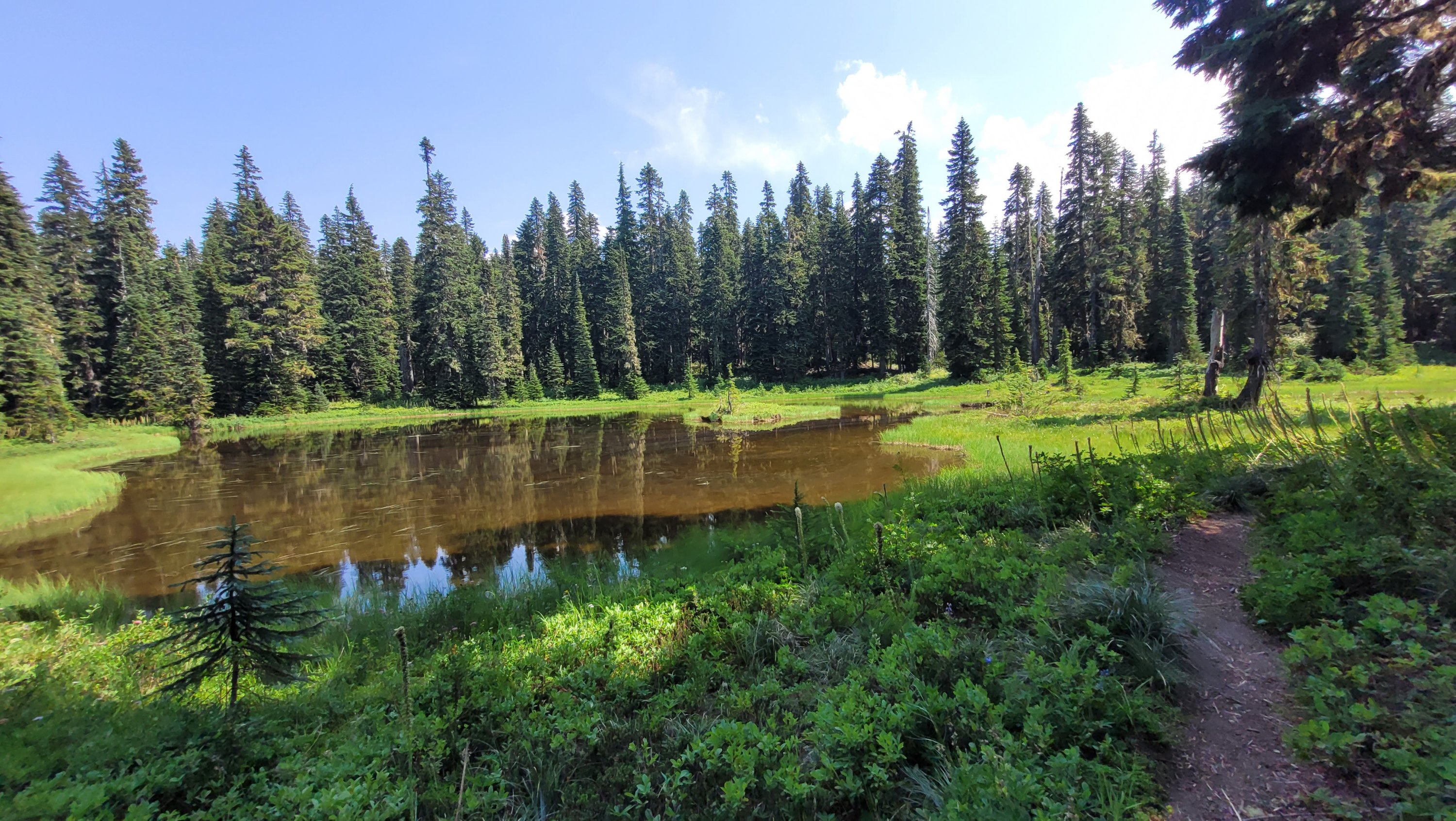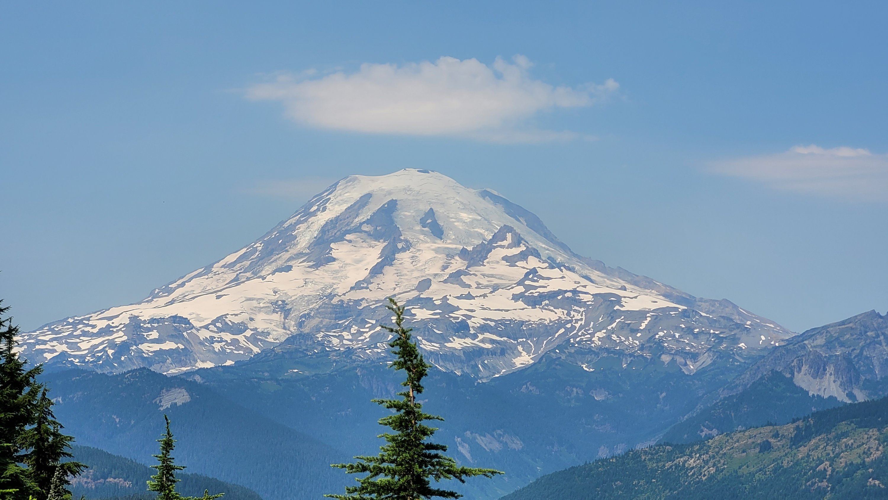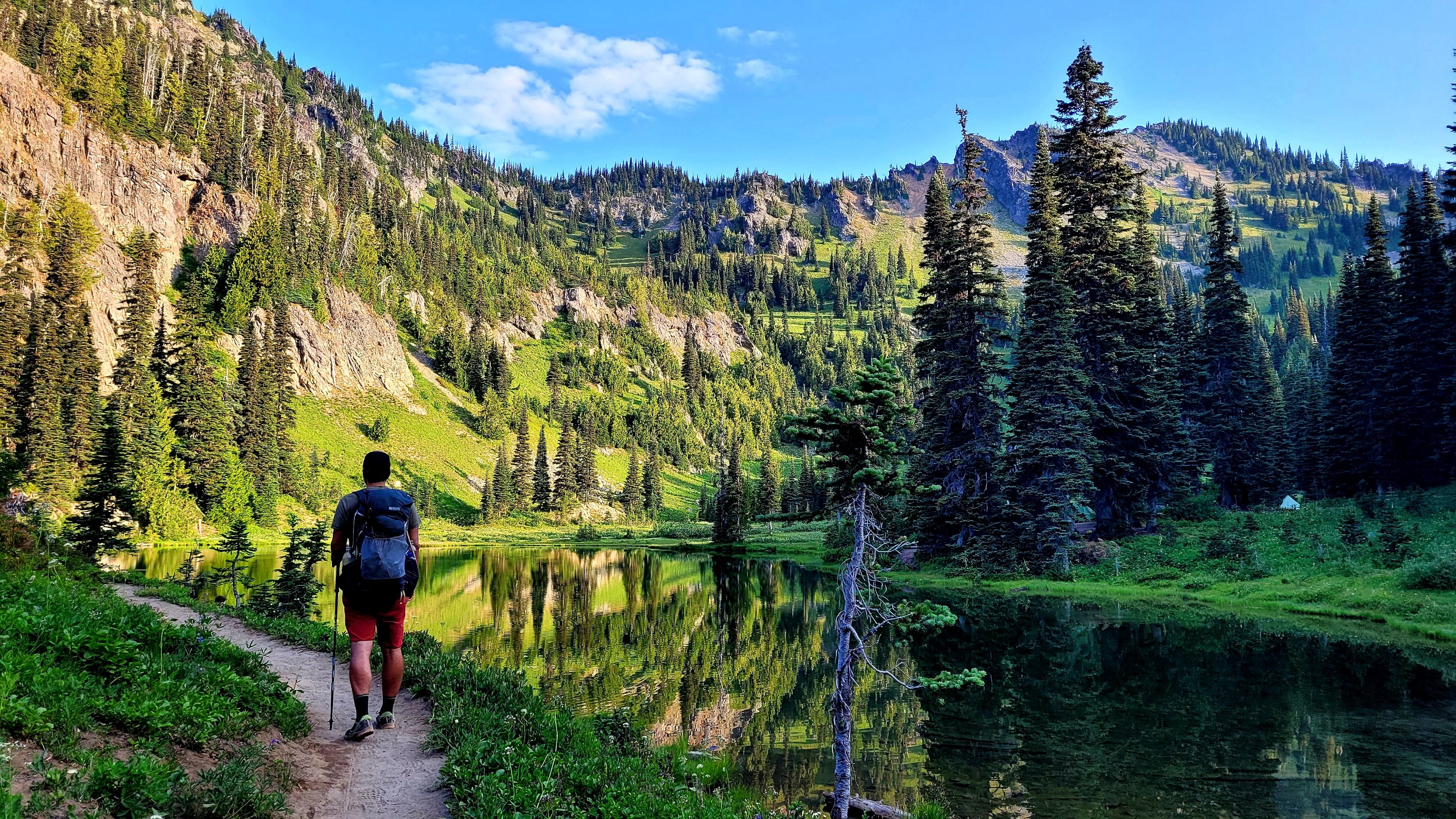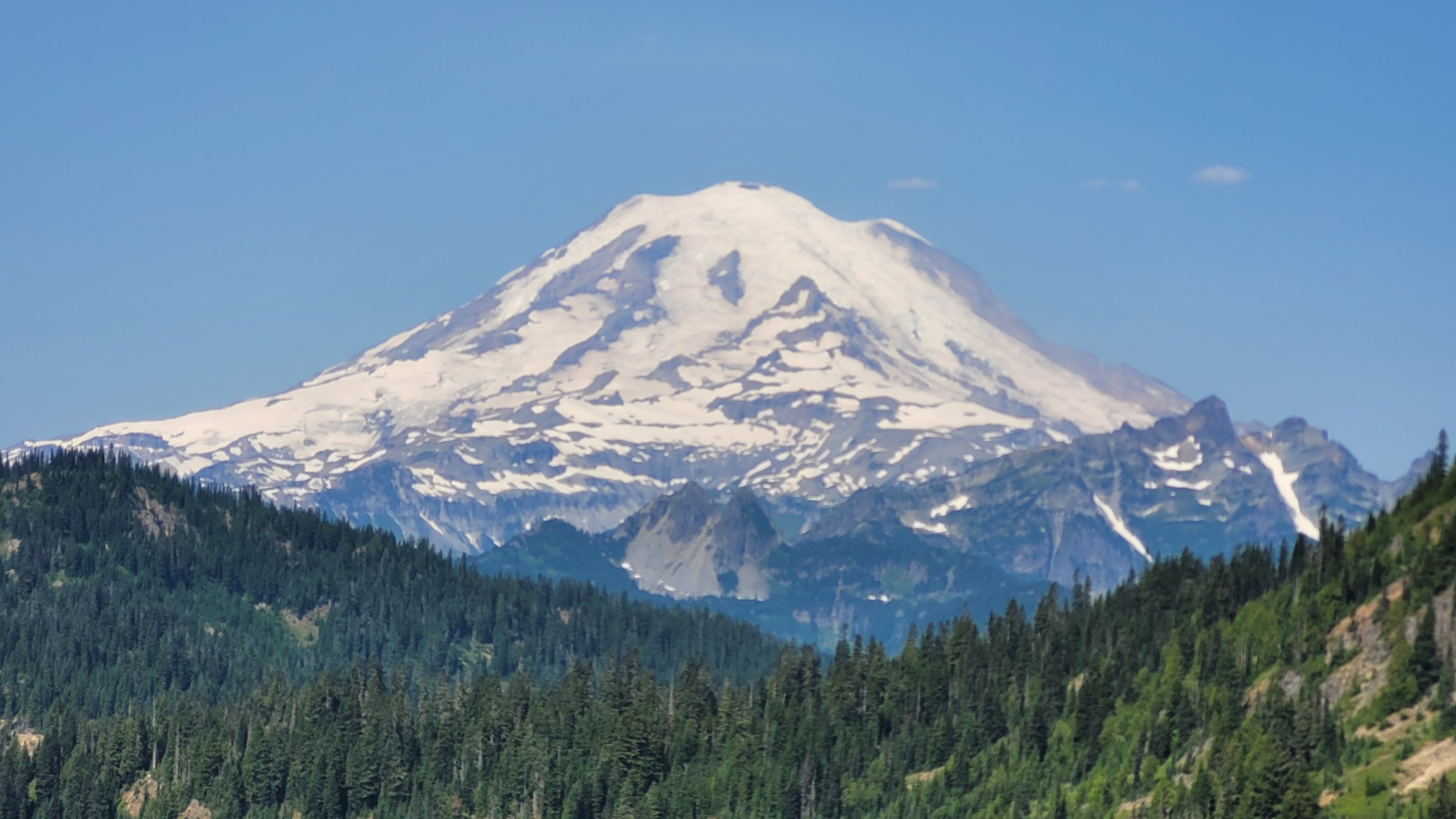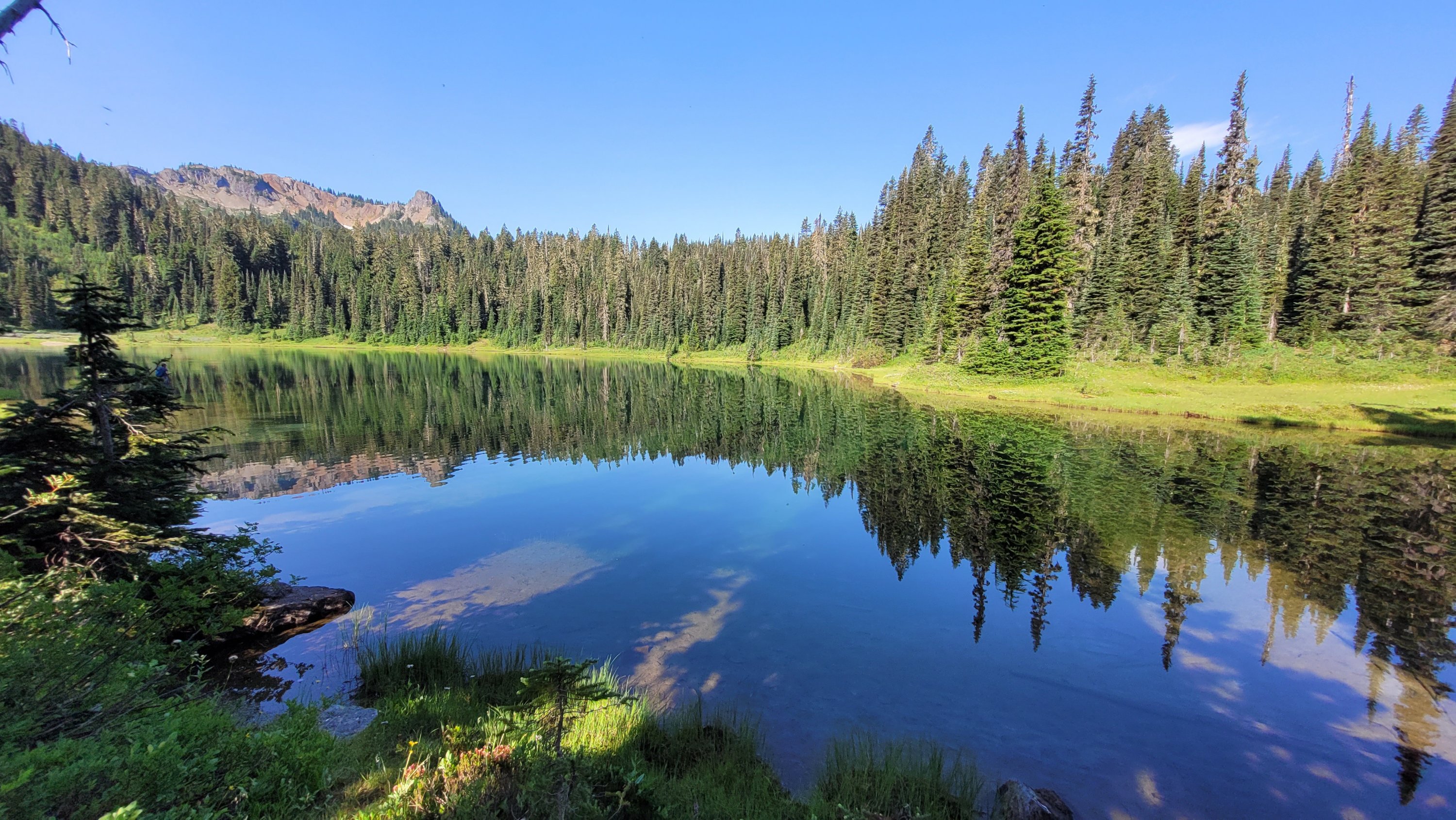 Es war so heiß, selbst nachts hab ich meinen Schlafsack nicht mal berührt. Früh nachdem man den Highway 27 überquert hat kam noch genau ein See in den ich fix springen konnte, danach ging das Unheil los. Mücken die einfach nicht enden, dazu Hitze und feuchtes Klima. Man hatte ein paar nette Aussichten auf Mt Rainier, den höchsten Berg von Washington. Nach endlosen Meilen durch eintönige Landschaft und Mücken musste ich sogar in meinem Zelt essen.