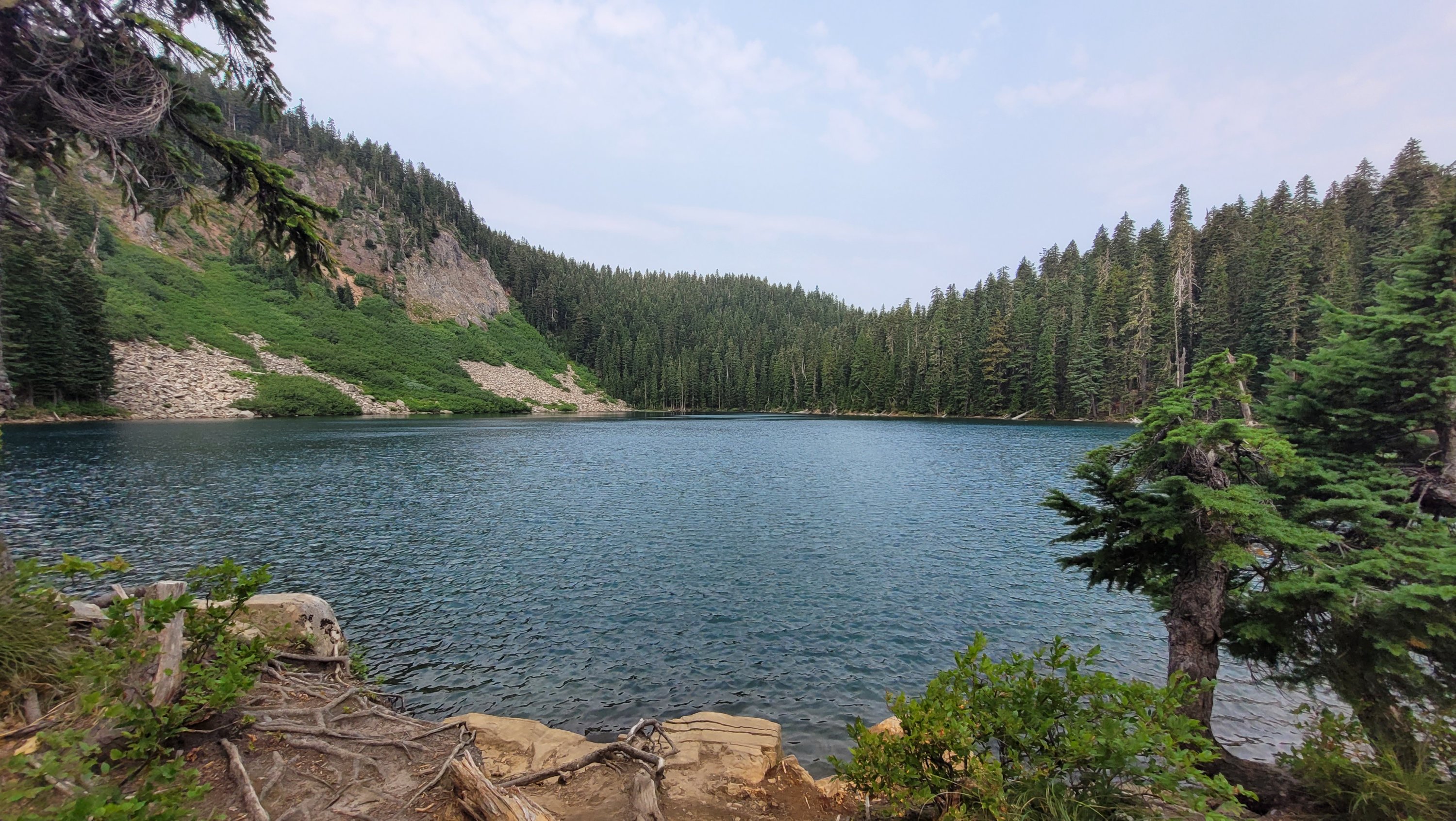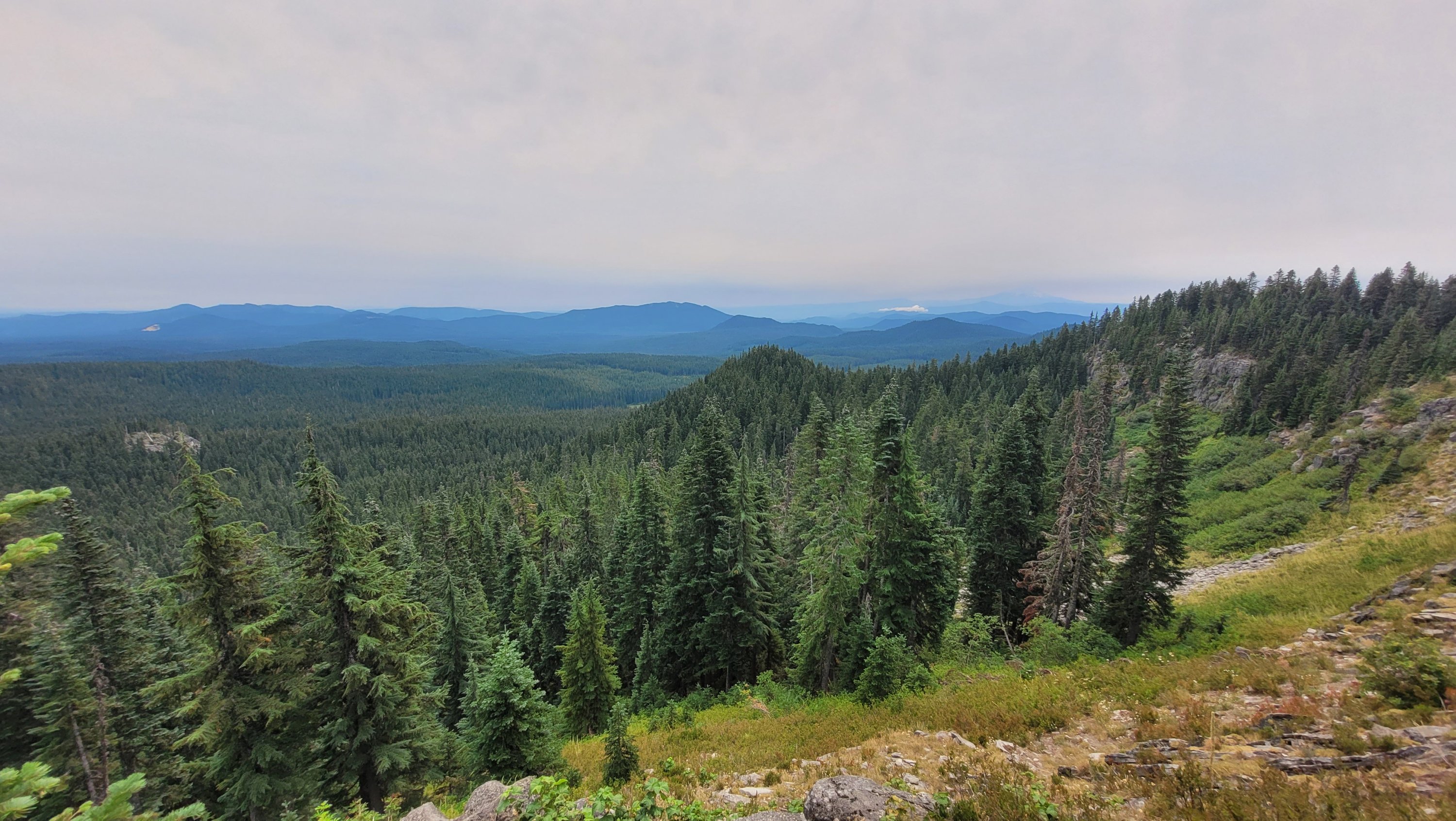 Ich schlafe lange, die Sonne ist durch den Rauch blutrot. Irgendwie hat es was, so düster. Nach gut 10 Meilen komme ich an einem See vorbei und springe kurz rein um die empfindlichen Stellen zu reinigen. Der ursprüngliche Plan heute 30 Meilen zu laufen ist sehr unwahrscheinlich da jeder Schritt wie Feuer brennt. Es hat sich zum Glück deutlich abgekühlt und es weht kalter Wind. Der Tag besteht darin alle 2 Stunden Vaseline aufzutragen und eine halbwegs bequeme Position beim Laufen zu finden was schwierig ist. Entweder der Rücken, der Schritt, die Schultern oder alles tut weh. Die Sonne kommt den ganzen Tag nicht durch aber die Landschaft in Süd Washington ist ohnehin eher durchschnittlich.