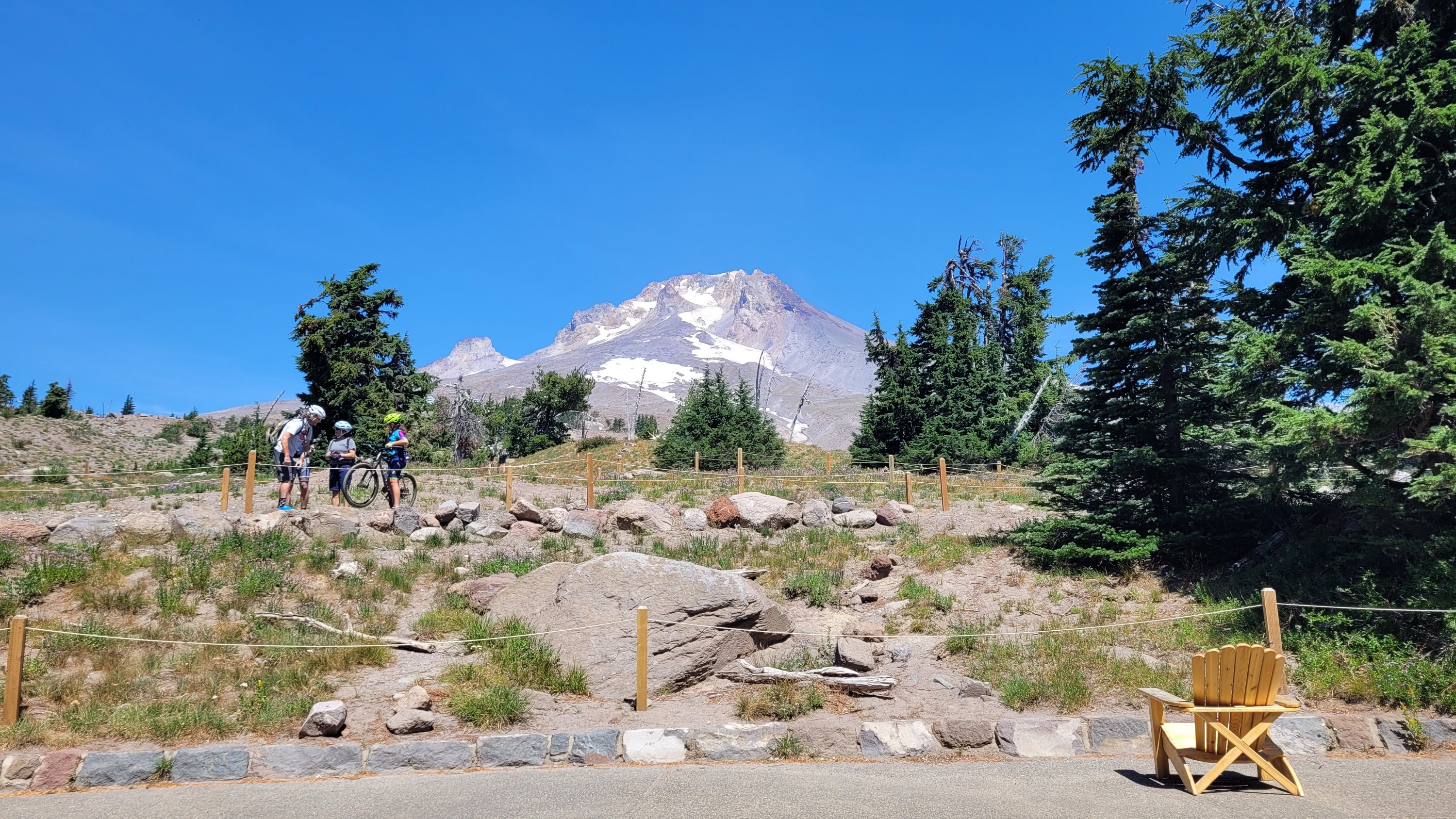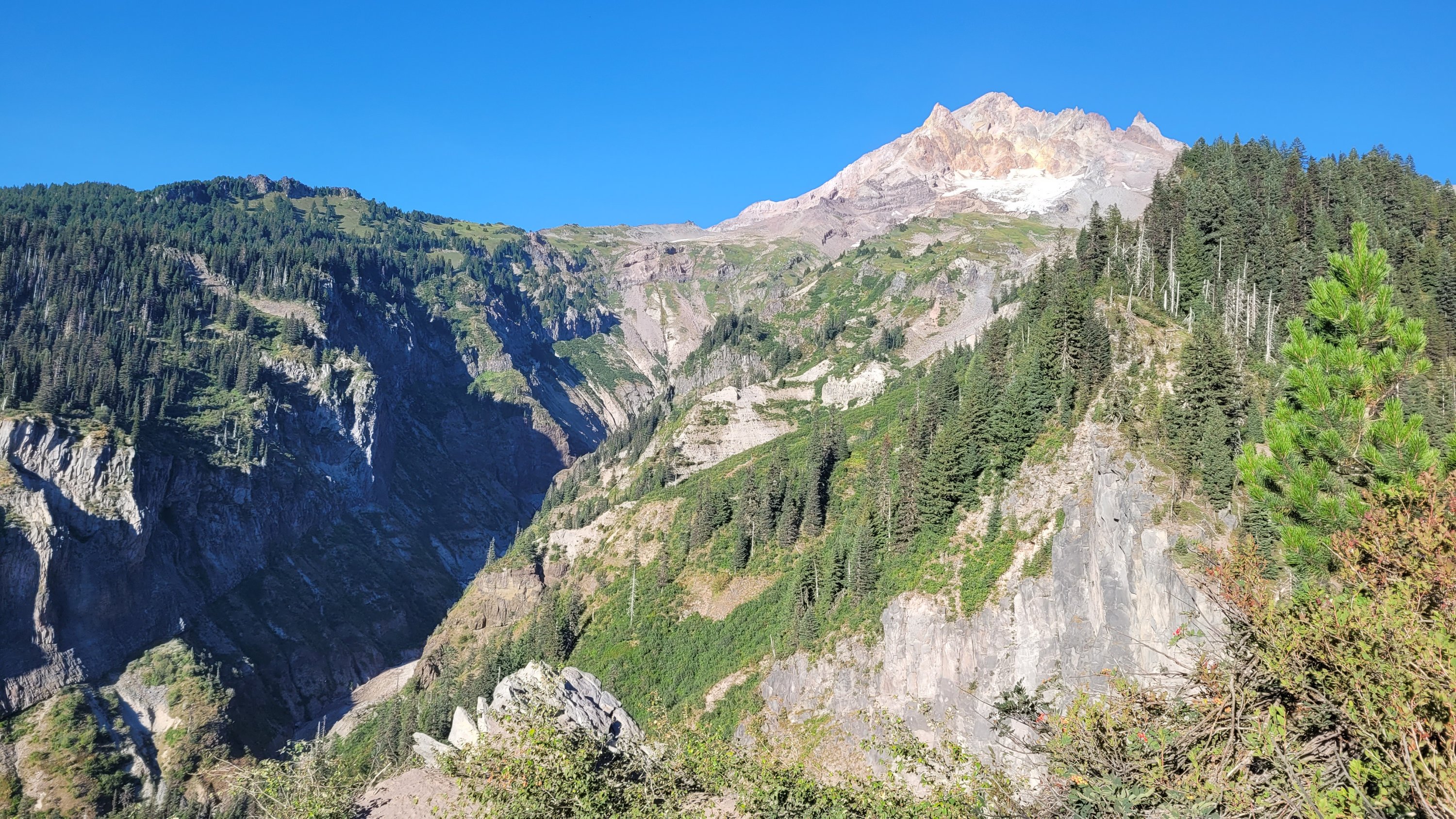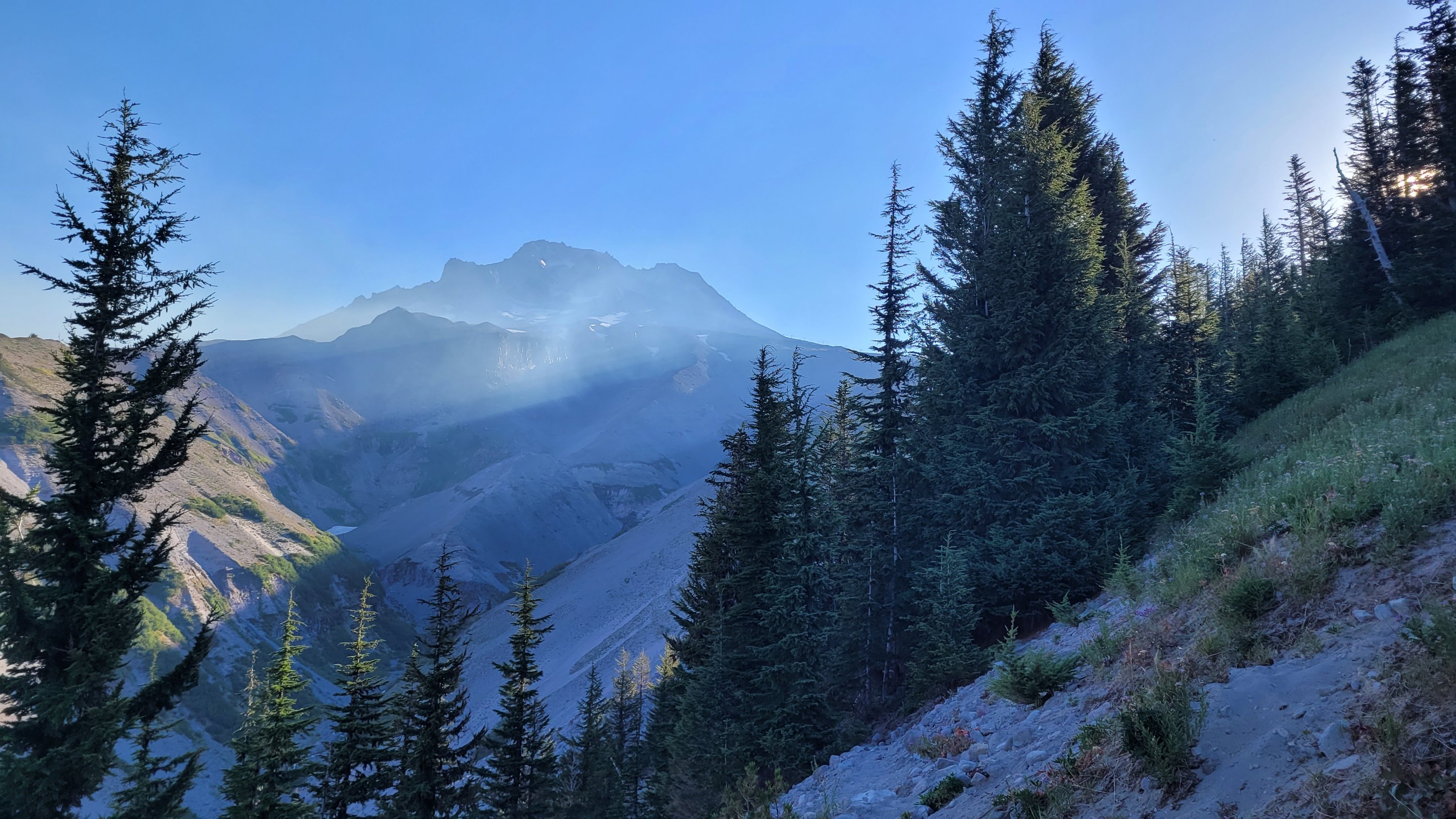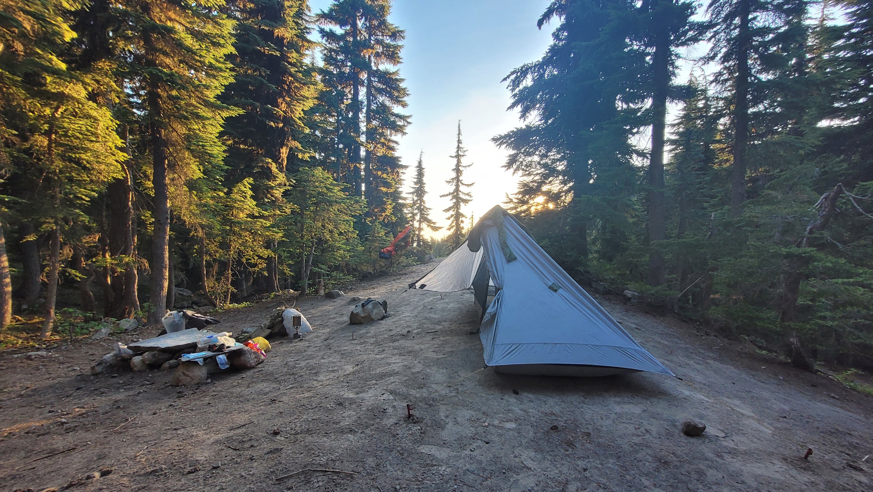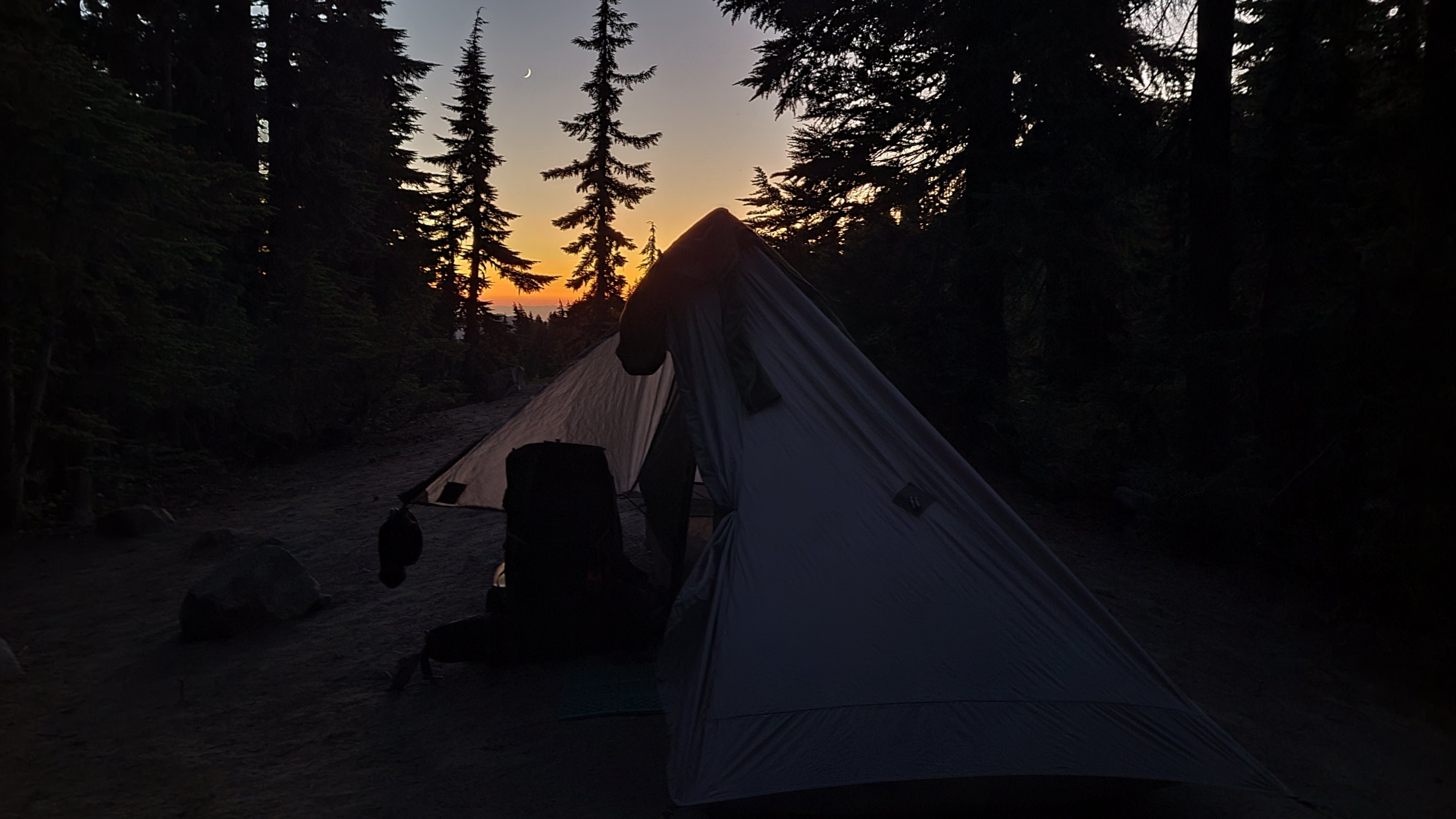 Ziel heute ist so nah an Timberline lodge wie möglich zu kommen für das Frühstücks Buffet morgen. Es war heiß und es waren mehrere 500-700m Höhenunterschiede zu bewältigen. Der Tag hat sich ewig gezogen. Immerhin hatte ich eine erfrischende Pause bei einem Wasserfall. Ganz am Ende des, Tages ging es nochmal 2 Std steil bergauf, ich musste mich erstmal 30 min ausruhen bevor ich überhaupt Abendessen zubereiten konnte. Dafür hatte ich einen top Zeltplatz mit Sonnenuntergang und nicht weit zum Buffet.