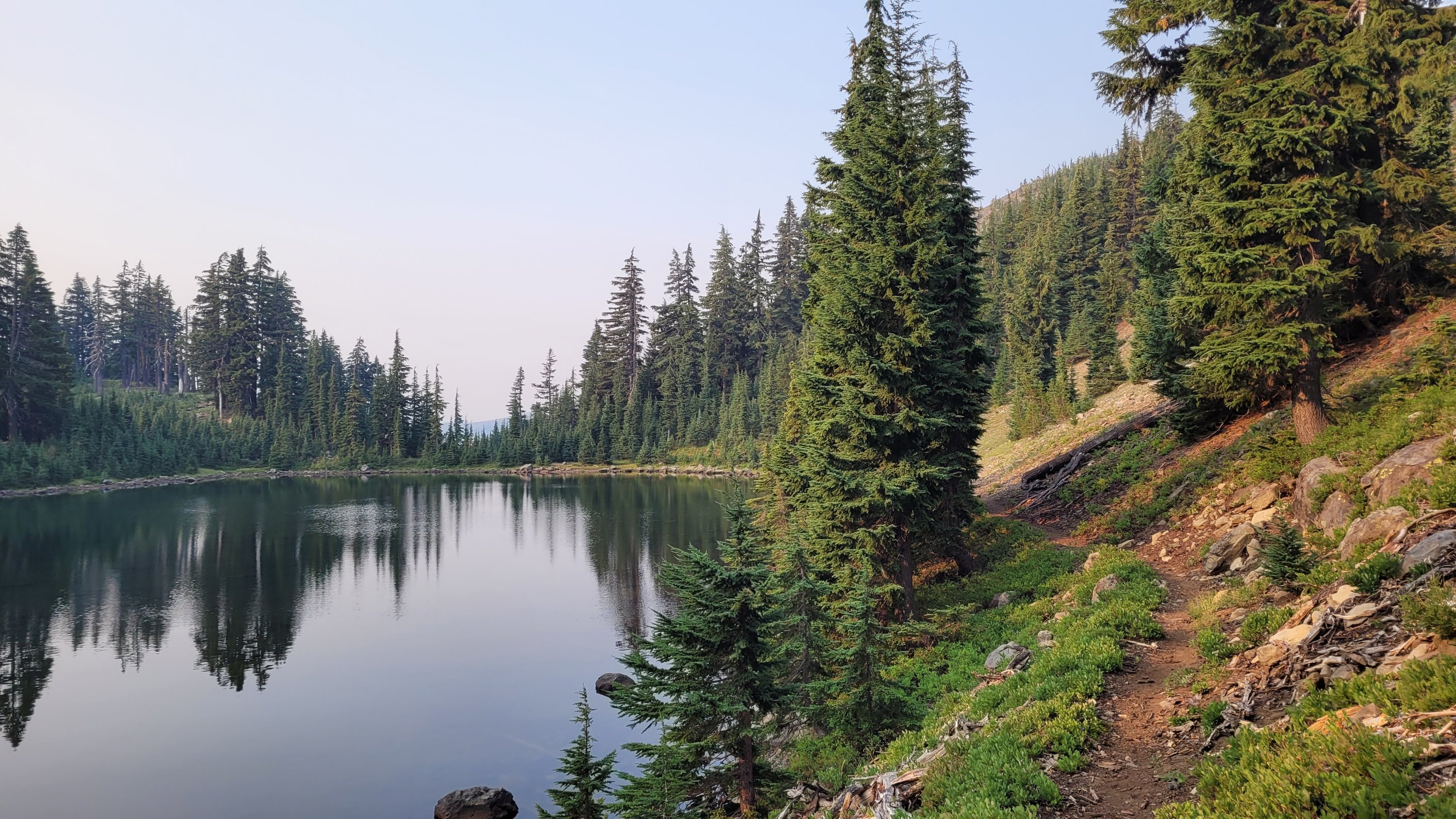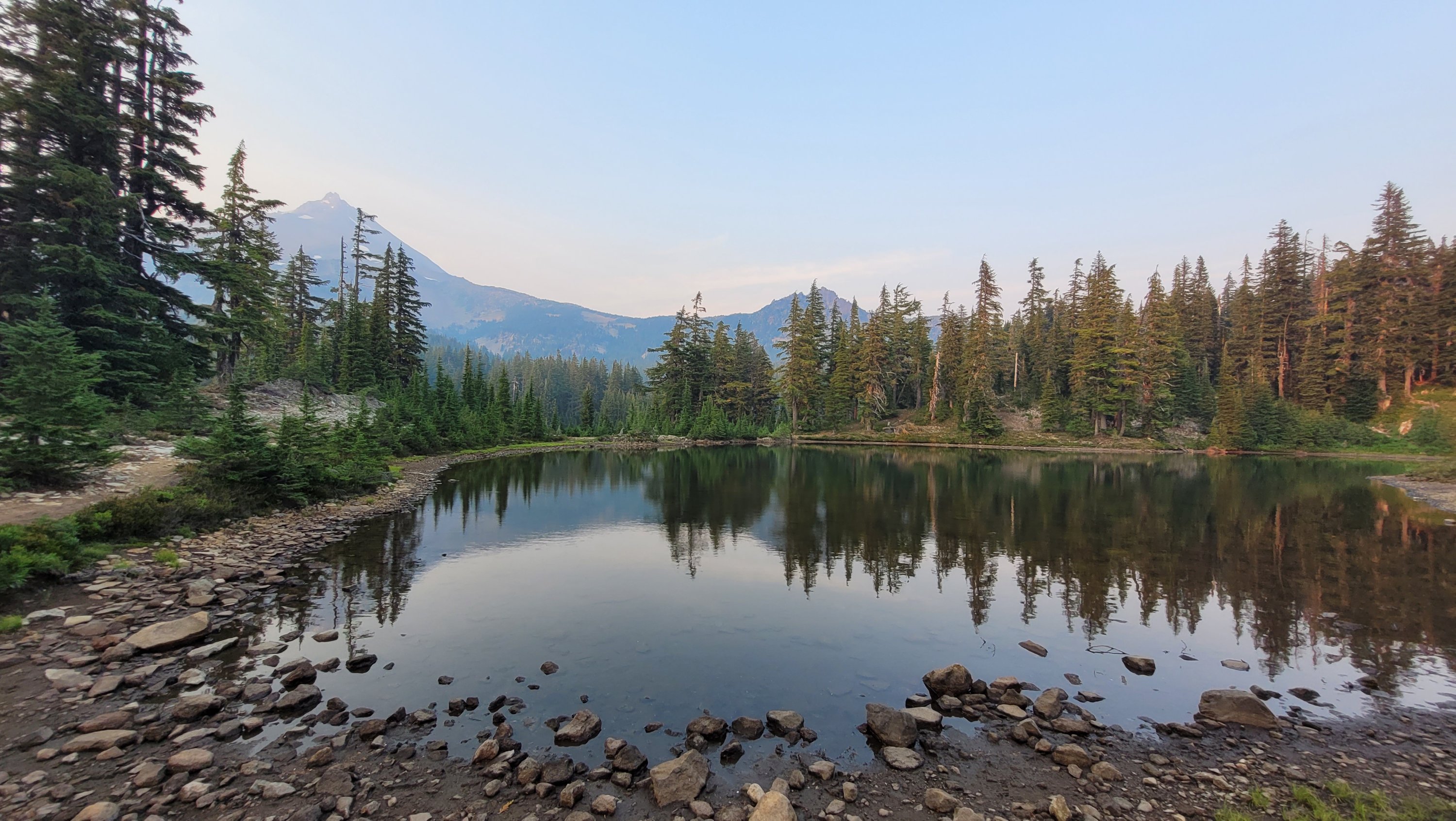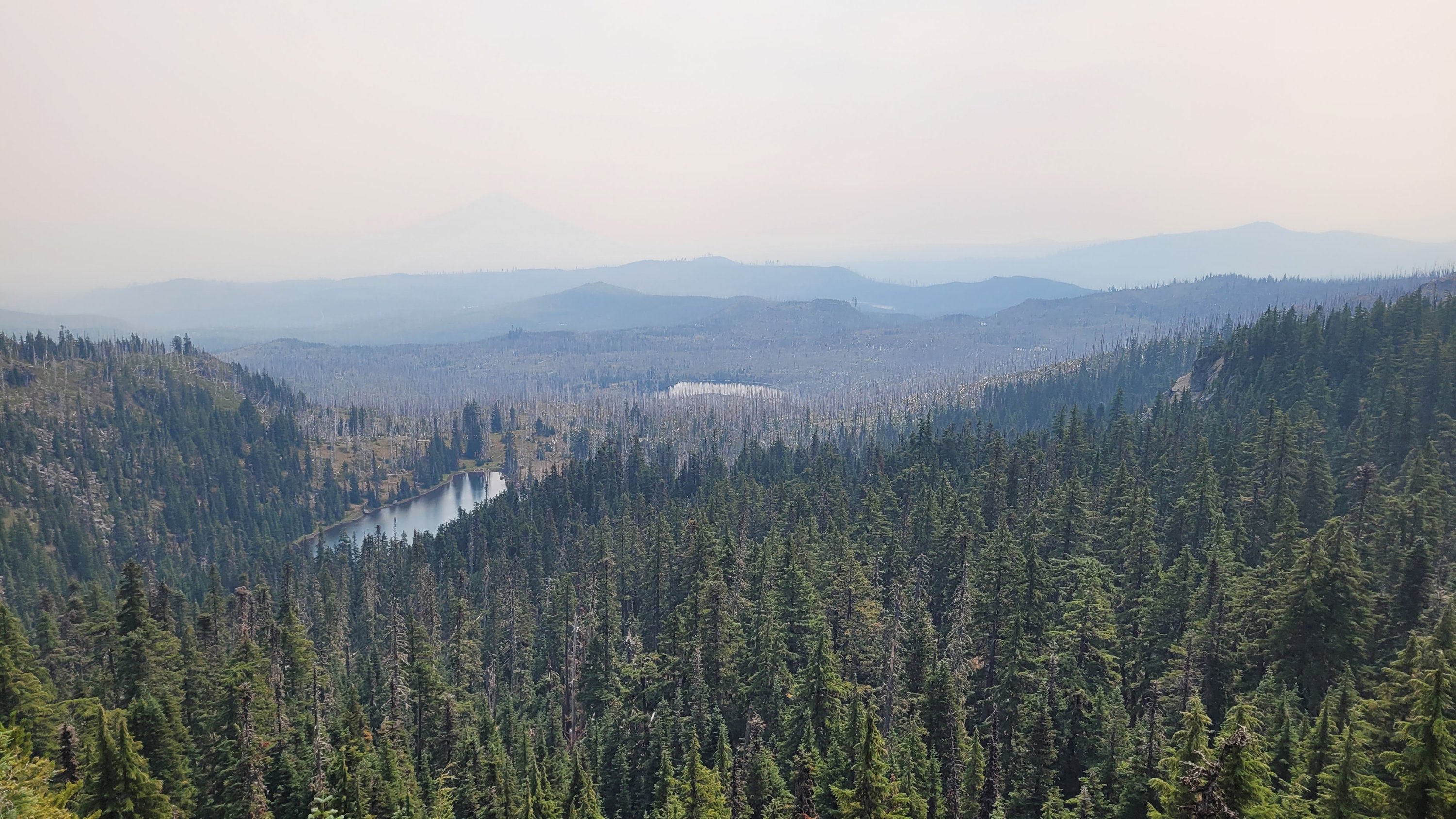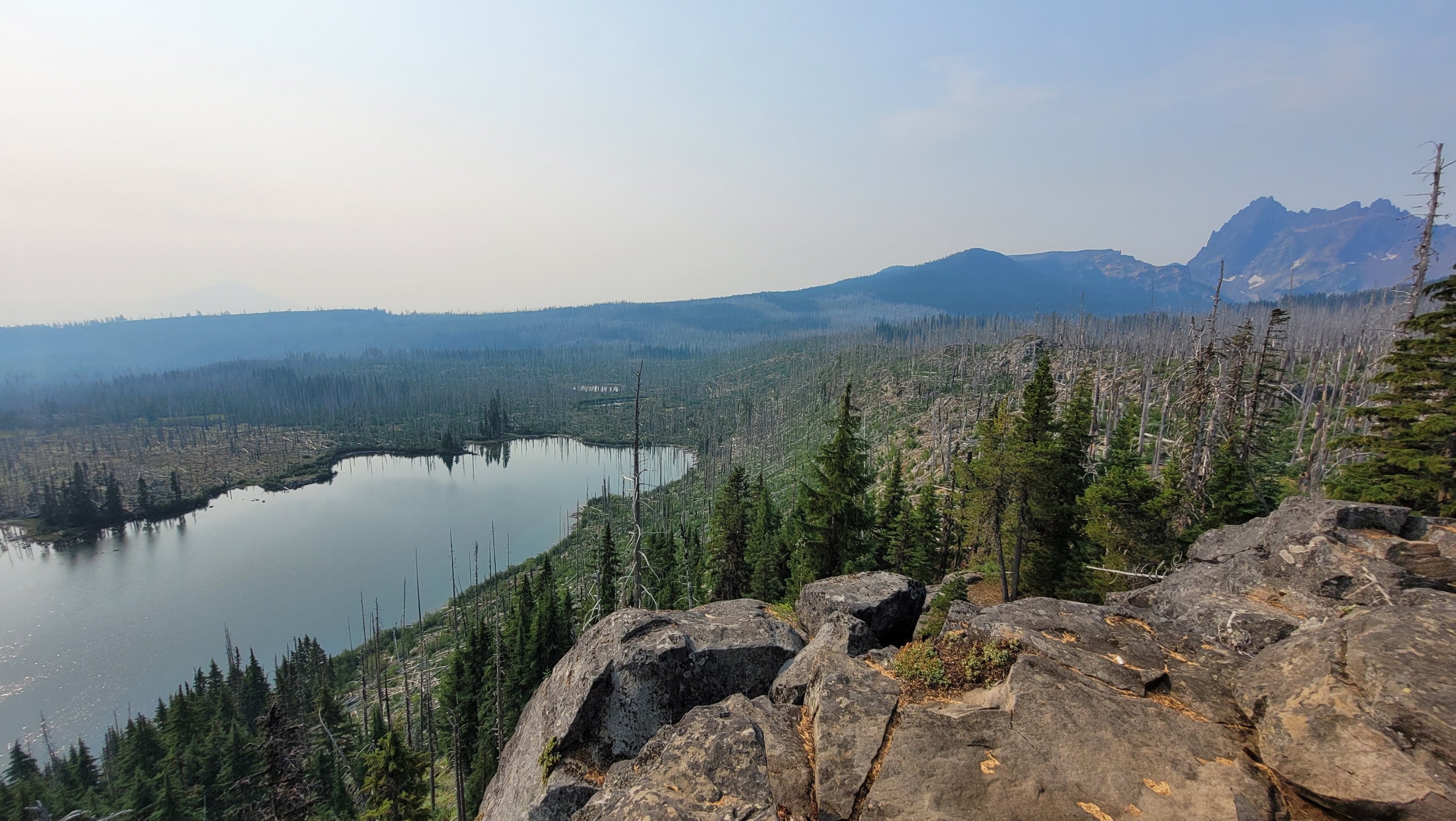 Nachdem ich kurzfristig noch umdisponiert habe Essen für reichlich 4 Tage zu nehmen und den umständlichen aber längeren Weg über Pamelia lake zurück zu nehmen ging es los. Per Anhalter dauert keine 5 min und ich sitze in einem Truck. Immer noch weit über 30 Grad und durch Feuer sehr rauchig . Durch die anhaltende Dürre sind die Seen auch deutlich kleiner, schlammiger und das Wasser warm und nicht ideal zum trinken. Nach einem langen Weg hoch bin ich am südlichen Ende des wegen Feuer gesperrten Gebiets, von hier an ist die Landschaft deutlich besser. Im Hintergrund sieht man Mt Jefferson.