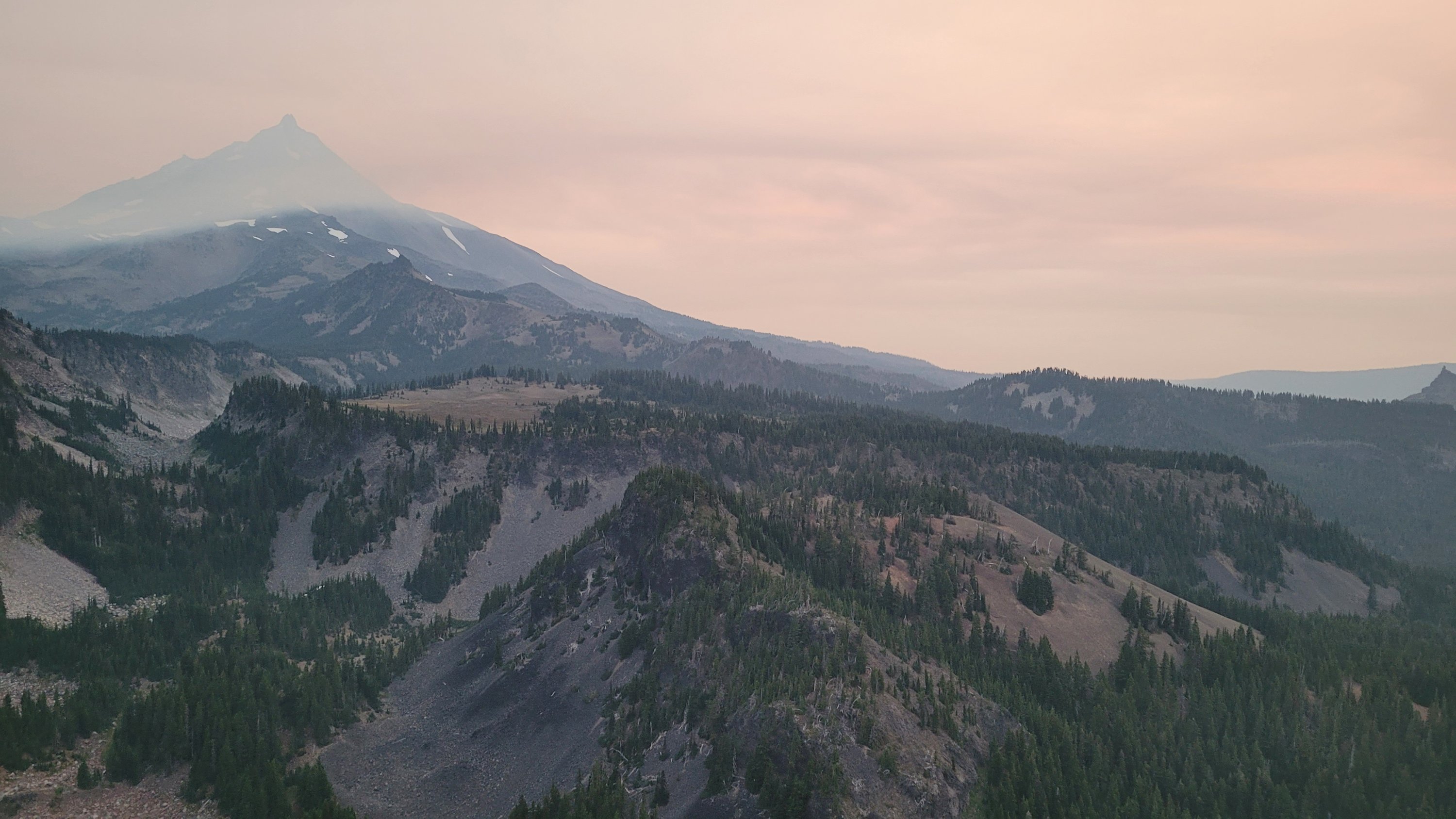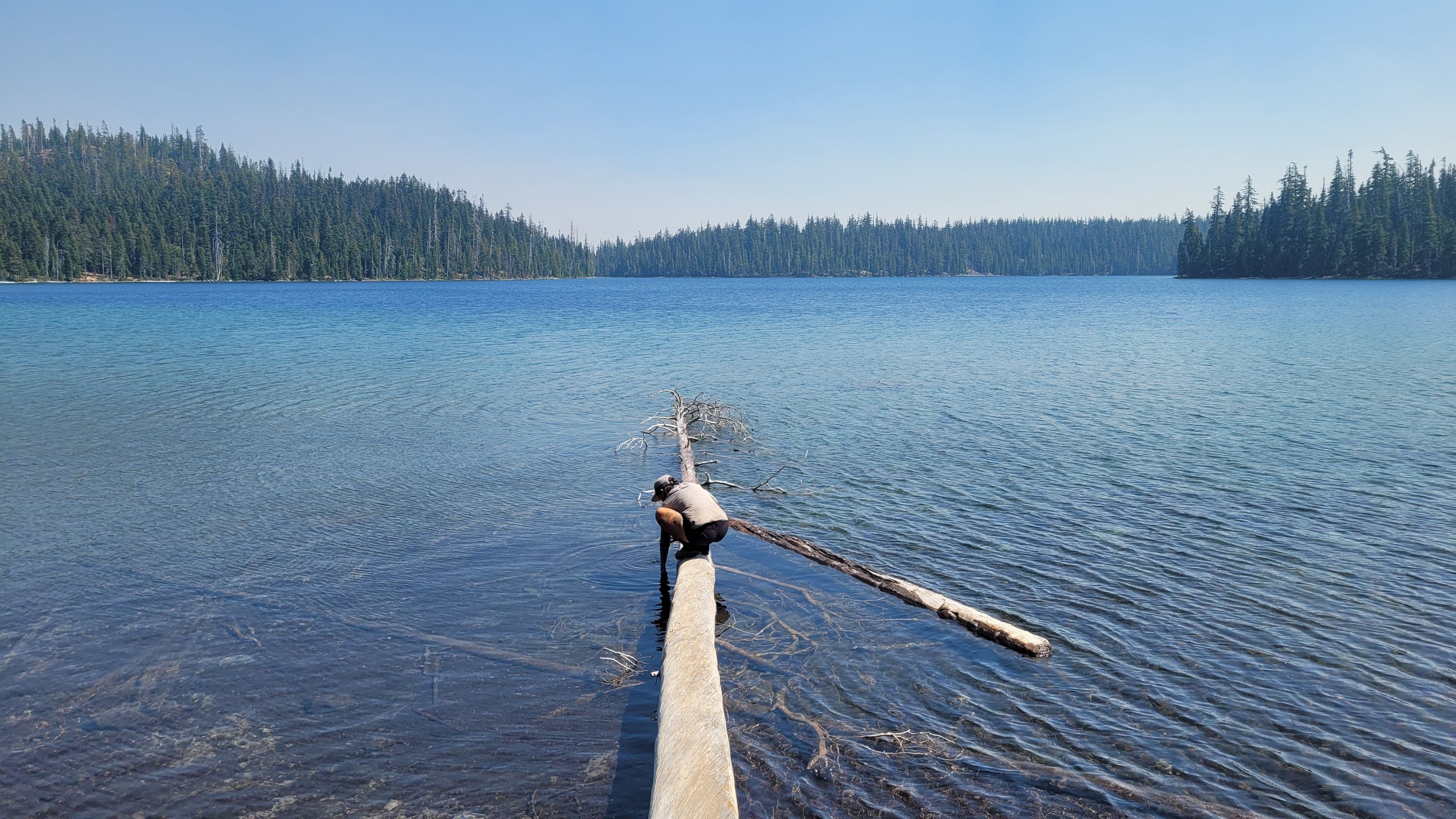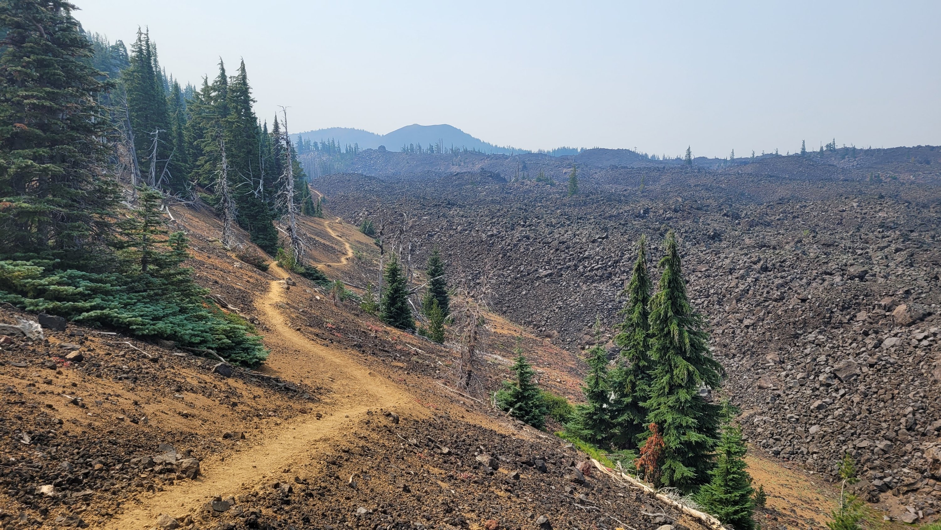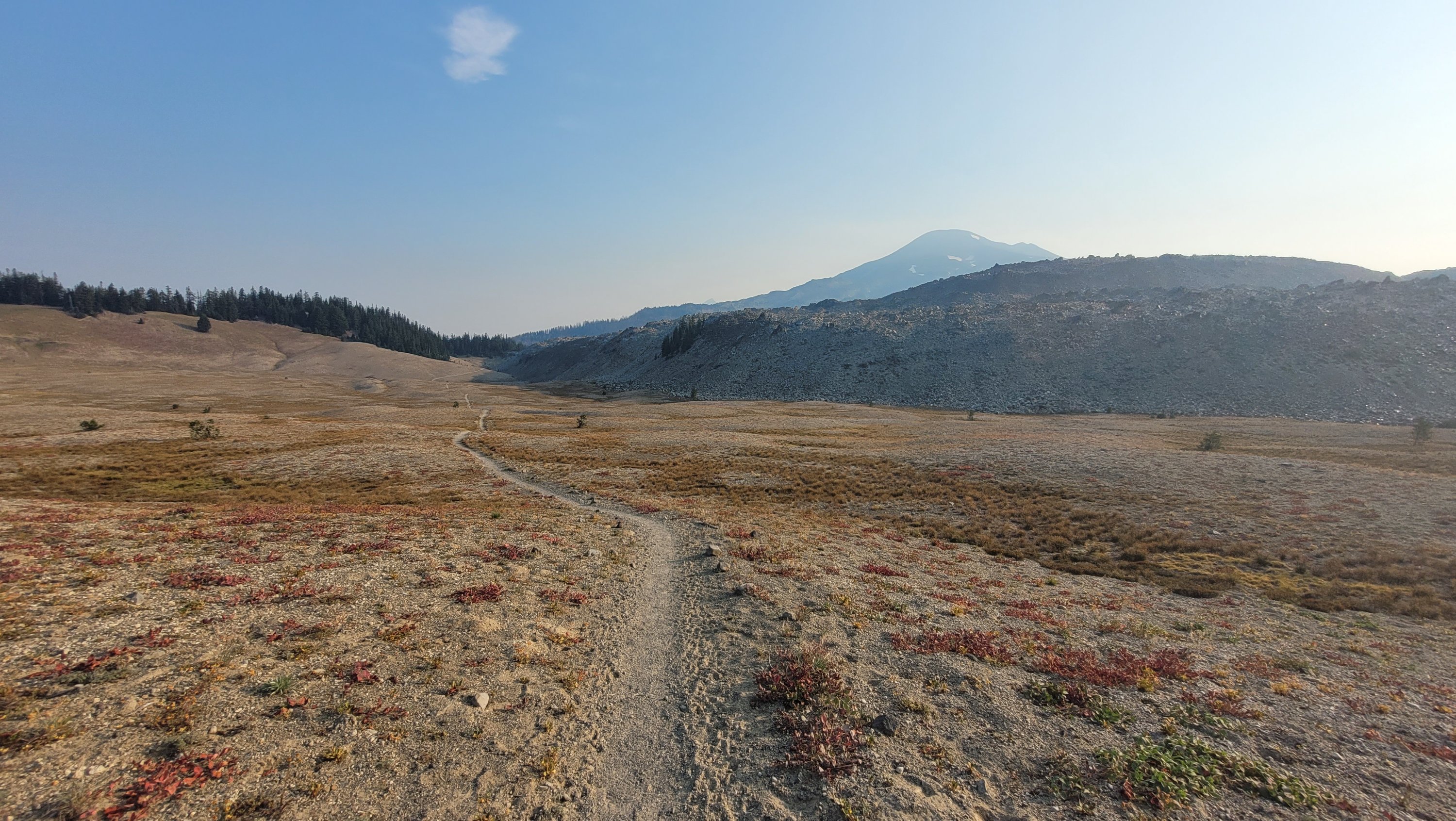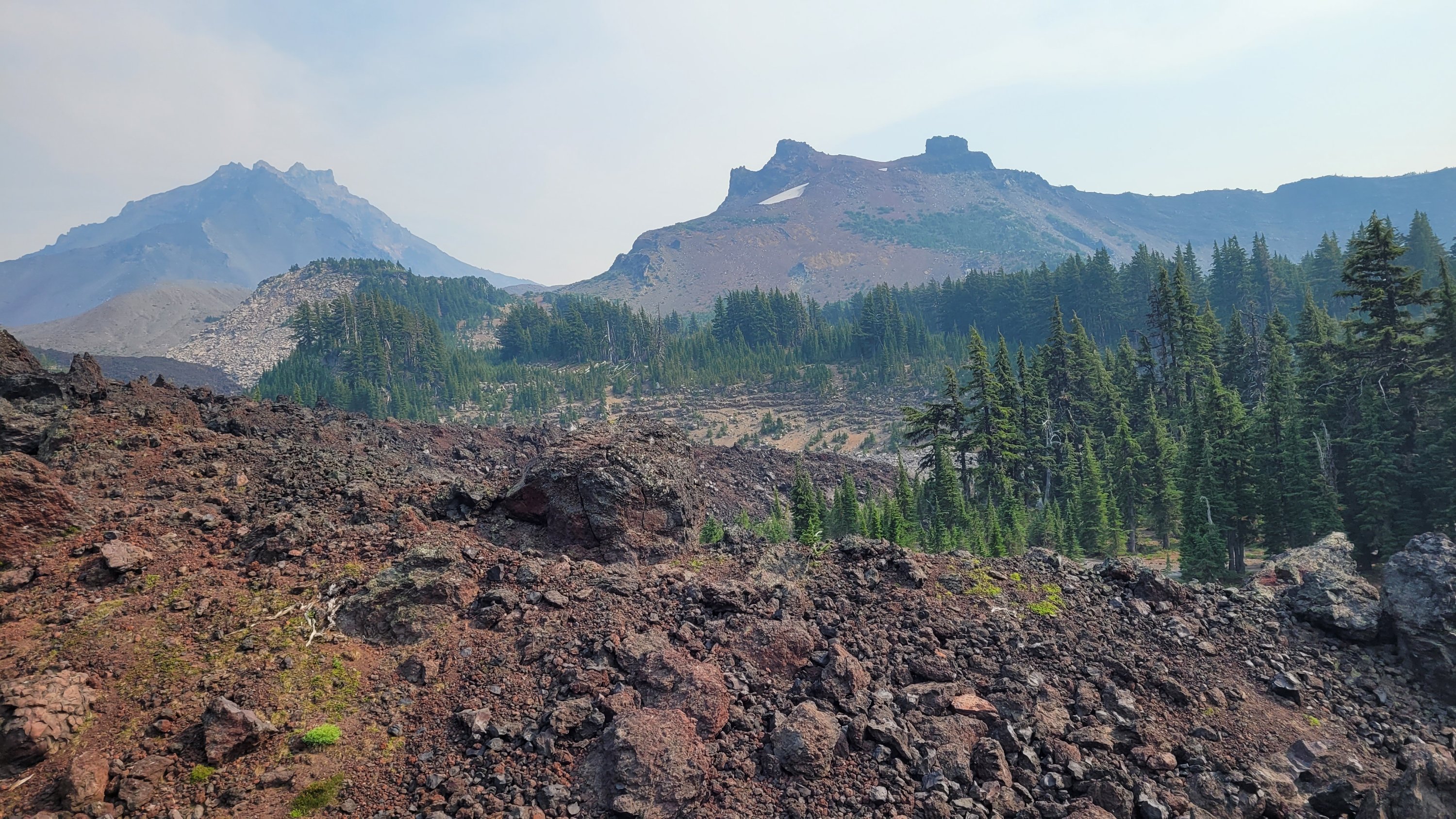 Nachdem ich kurzfristig noch umdisponiert habe Essen für reichlich 4 Tage zu nehmen und den umständlichen aber längeren Weg über Pamelia lake zurück zu nehmen ging es los. Per Anhalter dauert keine 5 min und ich sitze in einem Truck. Immer noch weit über 30 Grad und durch Feuer sehr rauchig . Durch die anhaltende Dürre sind die Seen auch deutlich kleiner, schlammiger und das Wasser warm und nicht ideal zum trinken. Nach einem langen Weg hoch bin ich am südlichen Ende des wegen Feuer gesperrten Gebiets, von hier an ist die Landschaft deutlich besser. Im Hintergrund sieht man Mt Jefferson.