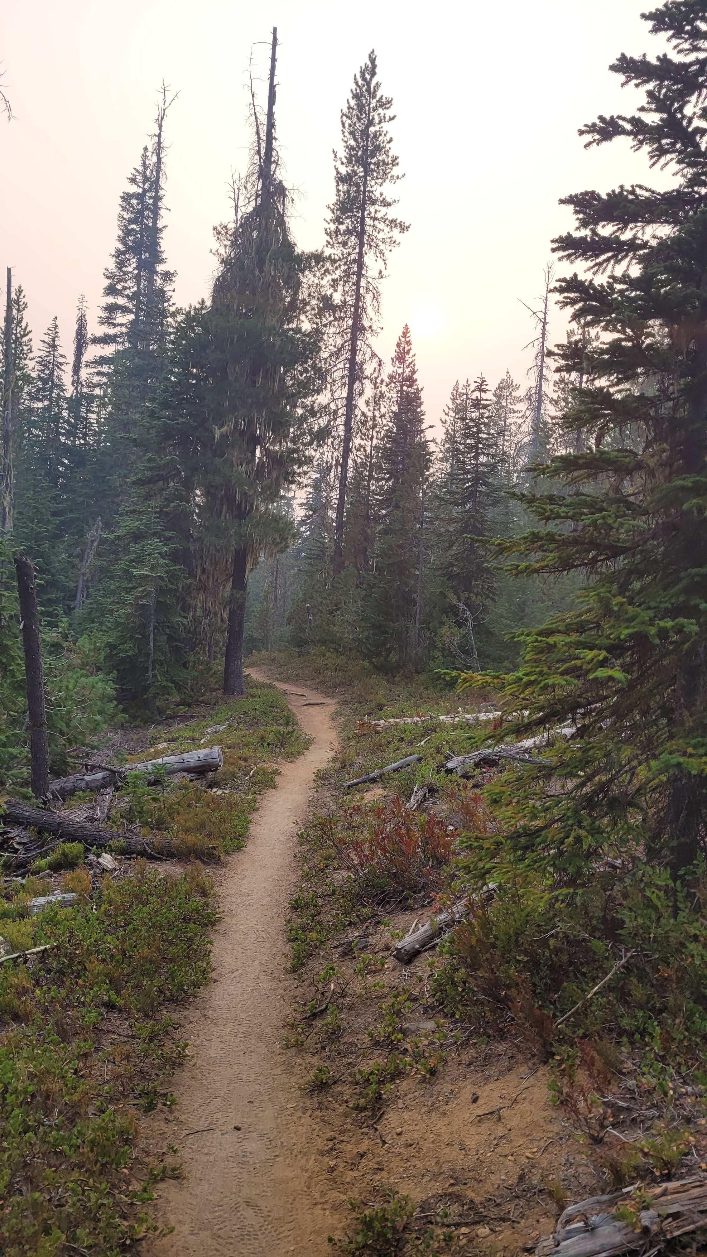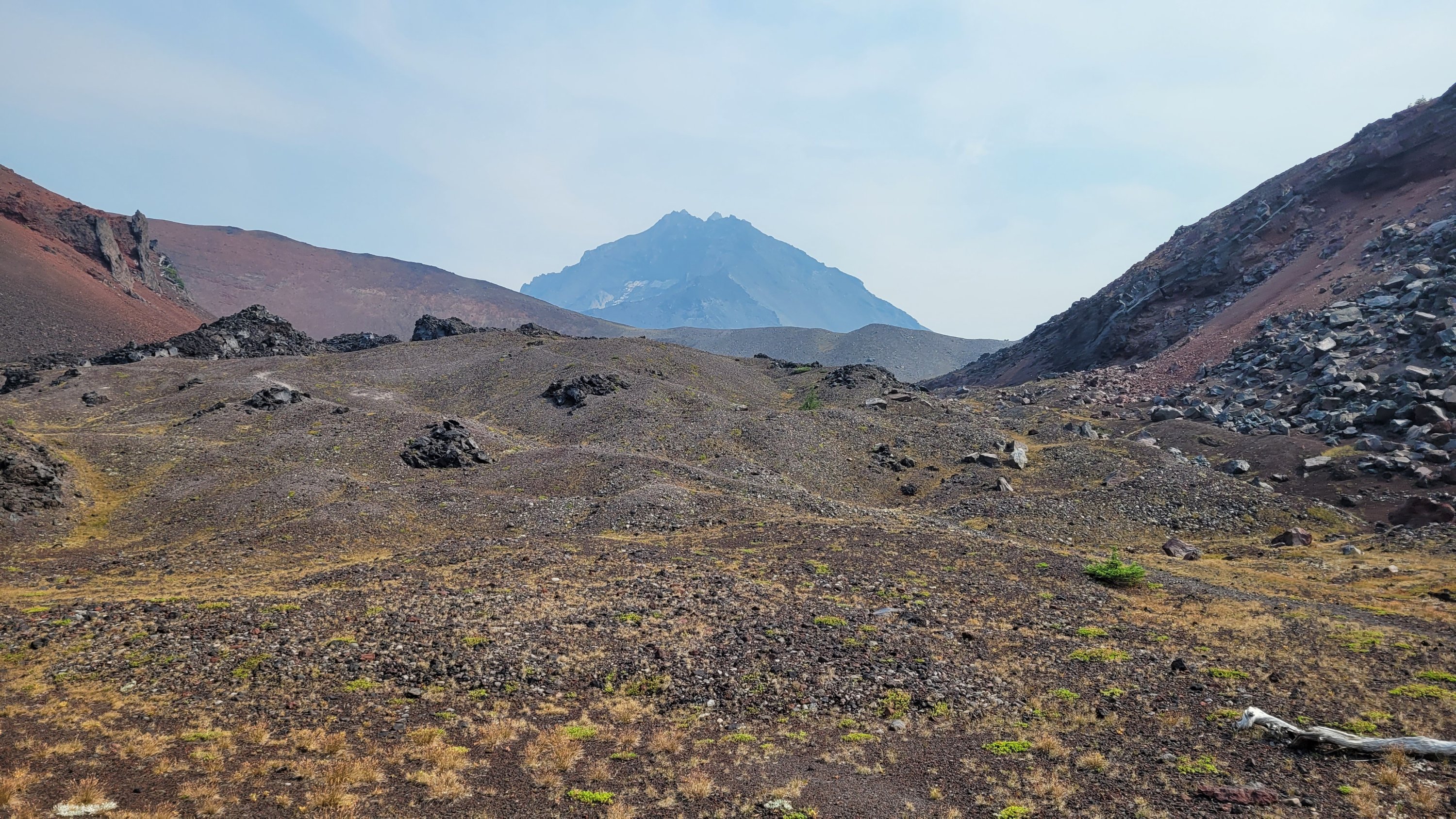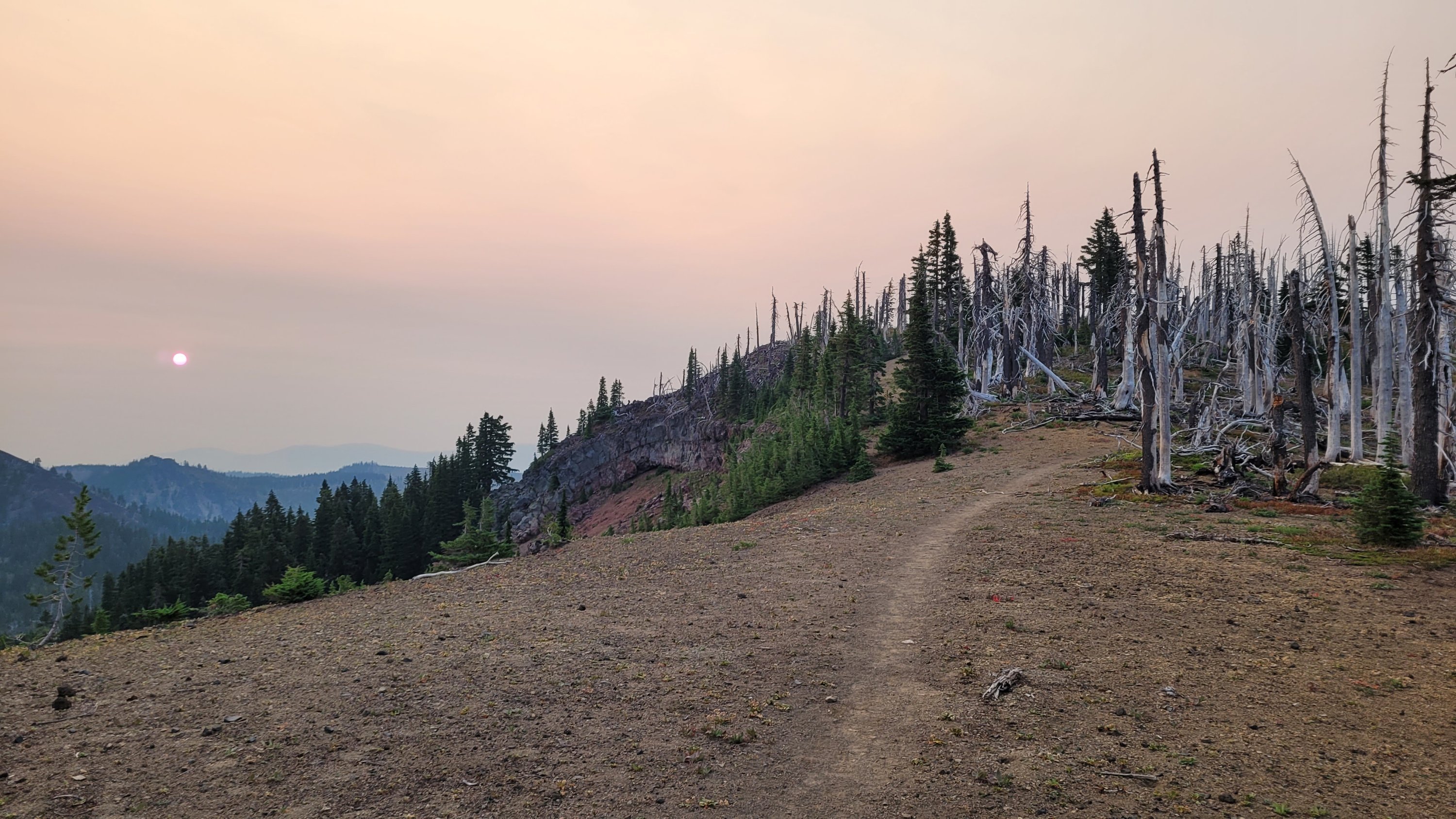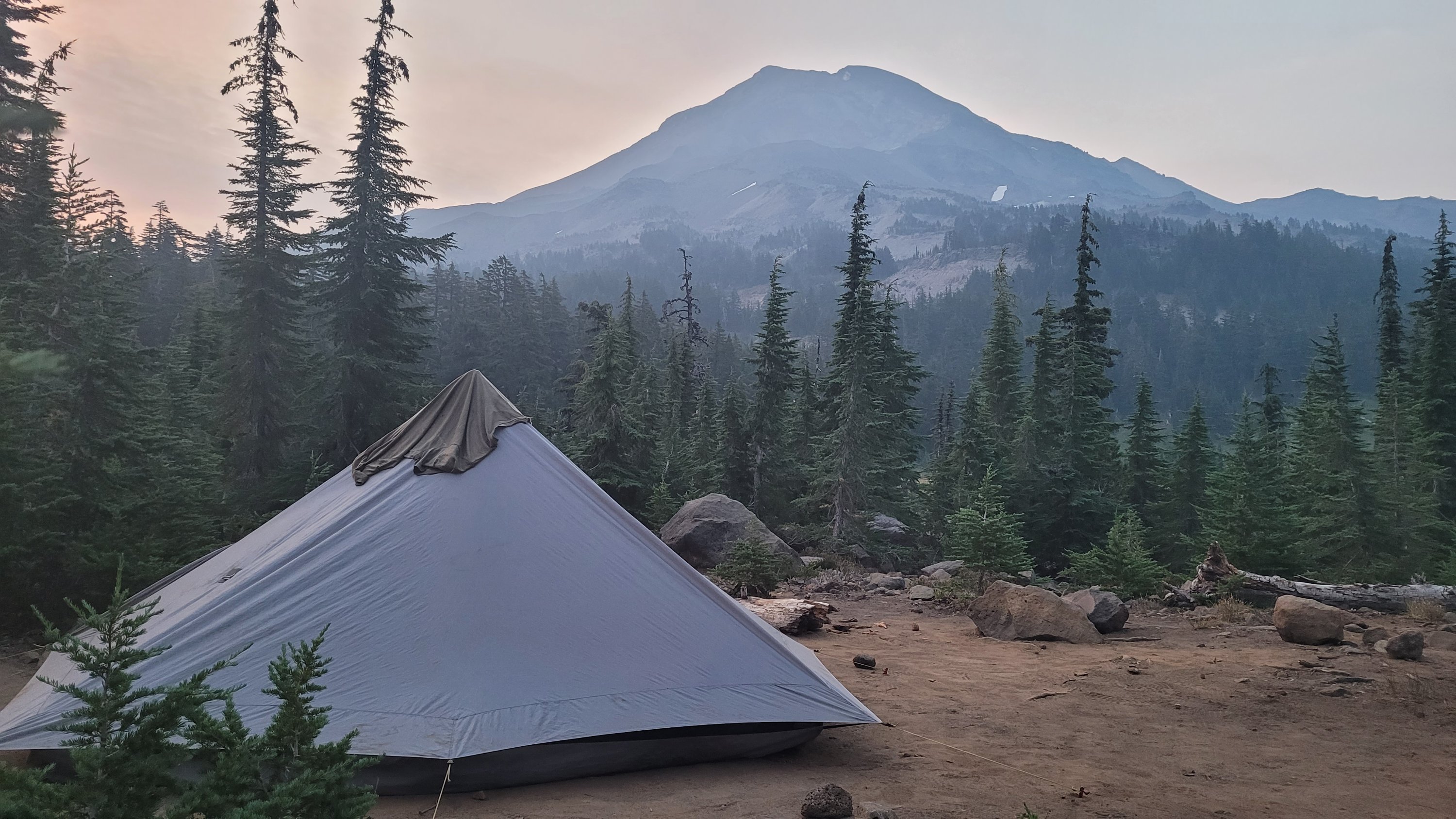 Nachdem ich kurzfristig noch umdisponiert habe Essen für reichlich 4 Tage zu nehmen und den umständlichen aber längeren Weg über Pamelia lake zurück zu nehmen ging es los. Per Anhalter dauert keine 5 min und ich sitze in einem Truck. Immer noch weit über 30 Grad und durch Feuer sehr rauchig . Durch die anhaltende Dürre sind die Seen auch deutlich kleiner, schlammiger und das Wasser warm und nicht ideal zum trinken. Nach einem langen Weg hoch bin ich am südlichen Ende des wegen Feuer gesperrten Gebiets, von hier an ist die Landschaft deutlich besser. Im Hintergrund sieht man Mt Jefferson.