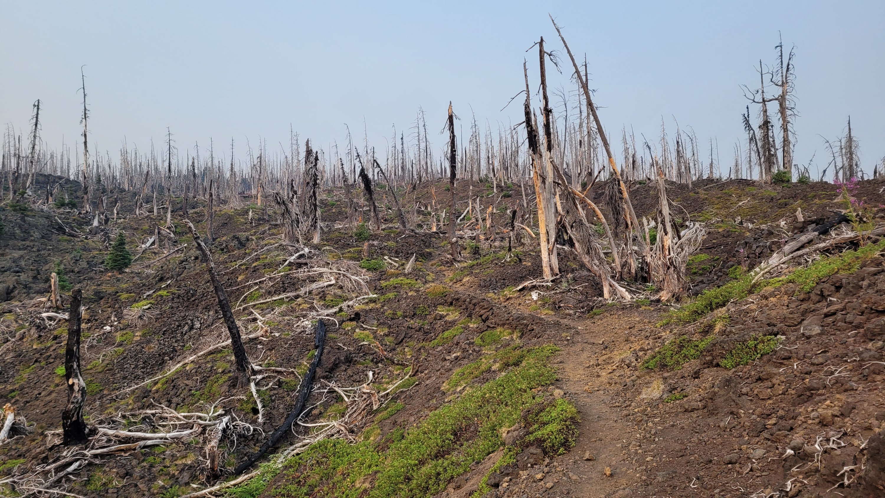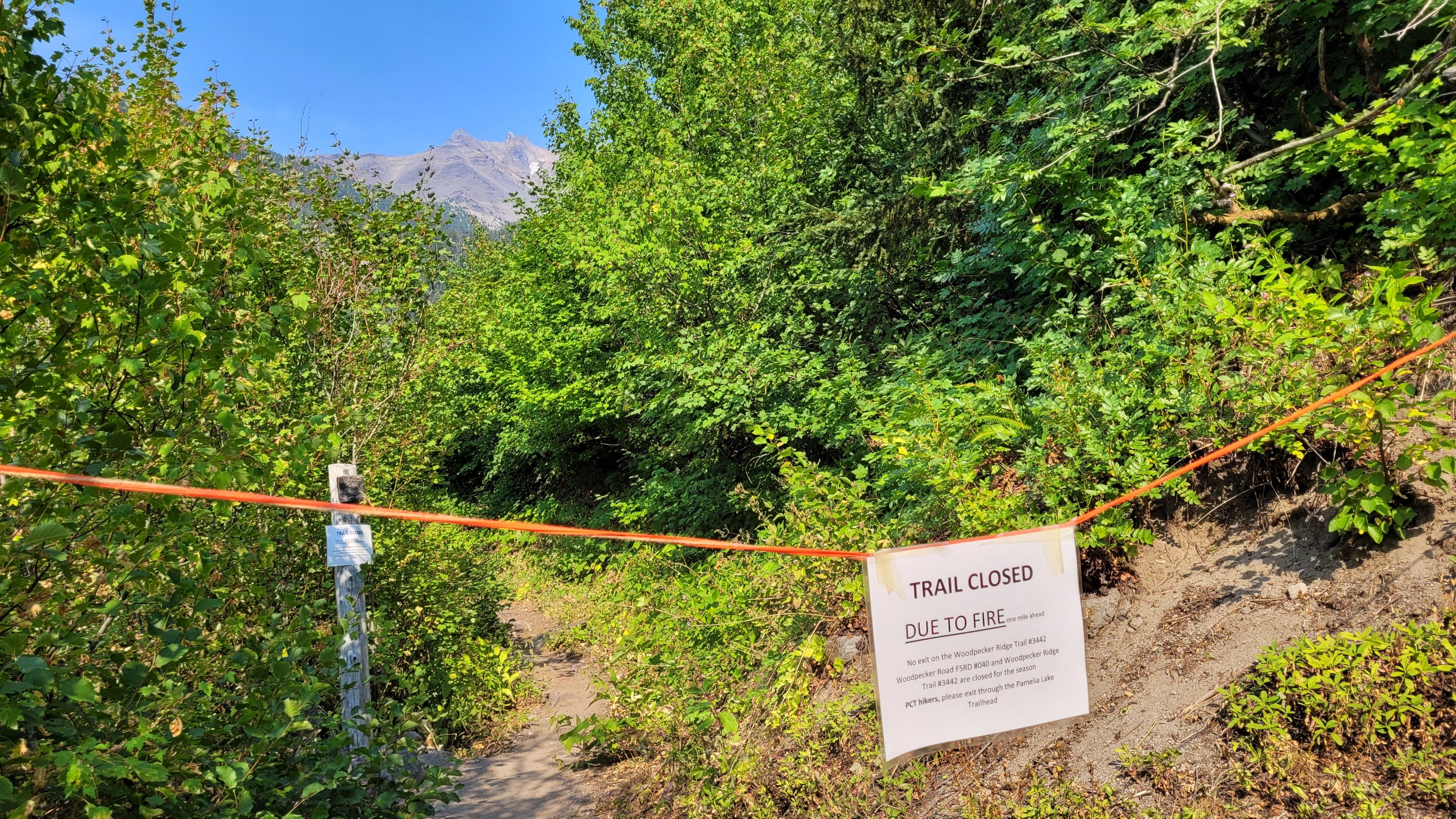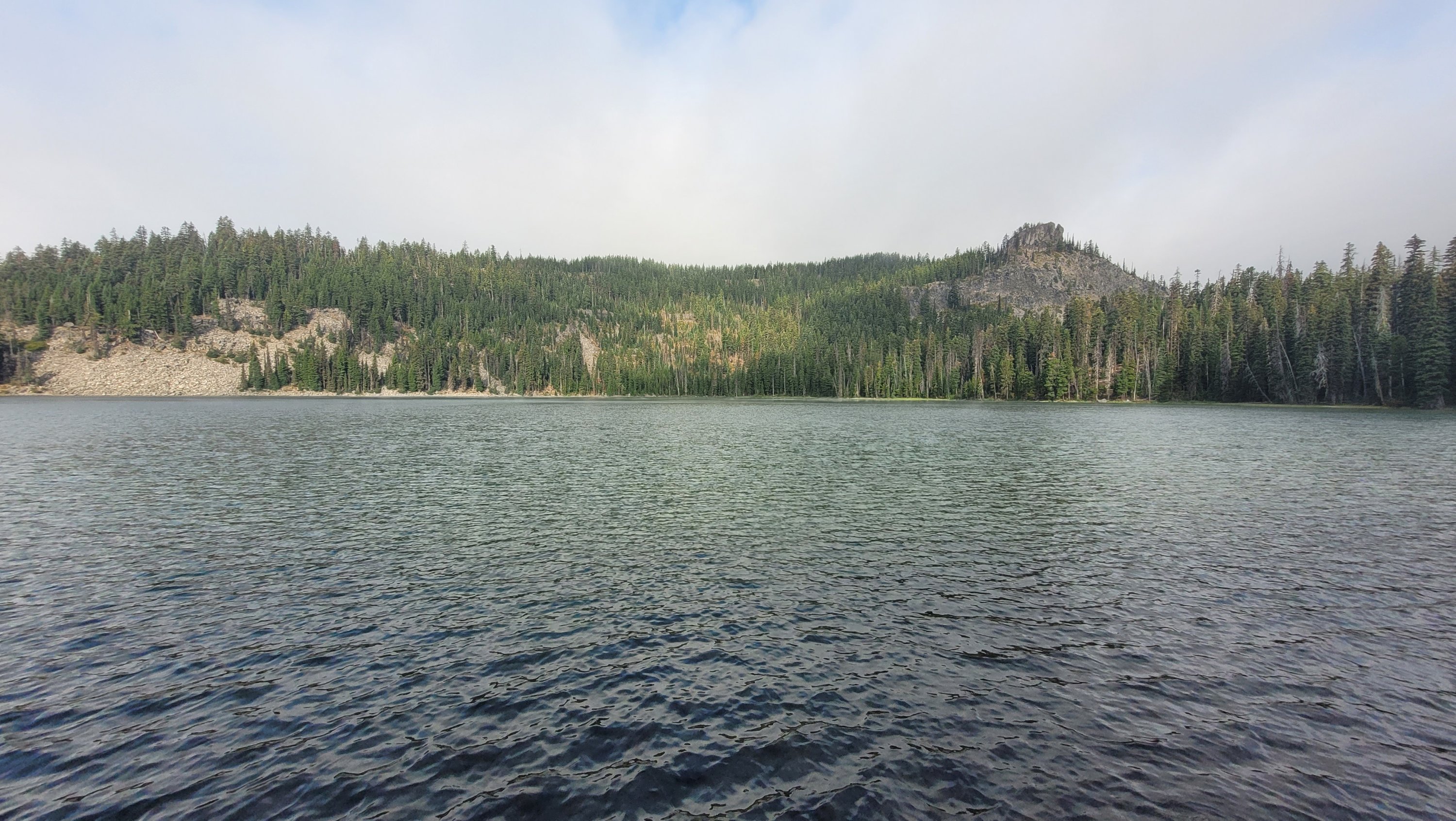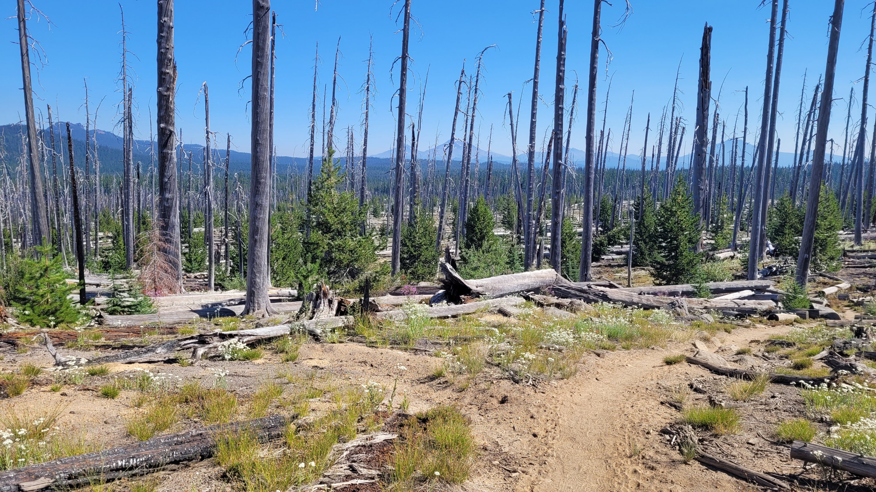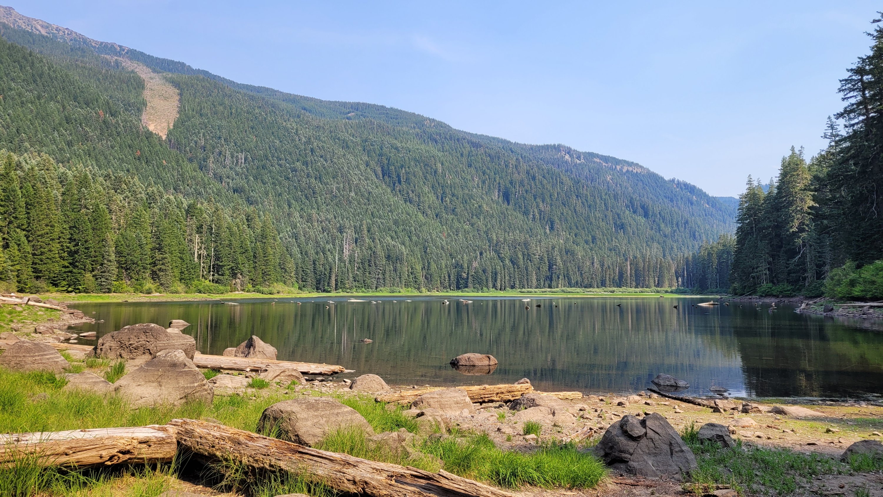 Nachdem ich kurzfristig noch umdisponiert habe Essen für reichlich 4 Tage zu nehmen und den umständlichen aber längeren Weg über Pamelia lake zurück zu nehmen ging es los. Per Anhalter dauert keine 5 min und ich sitze in einem Truck. Immer noch weit über 30 Grad und durch Feuer sehr rauchig . Durch die anhaltende Dürre sind die Seen auch deutlich kleiner, schlammiger und das Wasser warm und nicht ideal zum trinken. Nach einem langen Weg hoch bin ich am südlichen Ende des wegen Feuer gesperrten Gebiets, von hier an ist die Landschaft deutlich besser. Im Hintergrund sieht man Mt Jefferson.