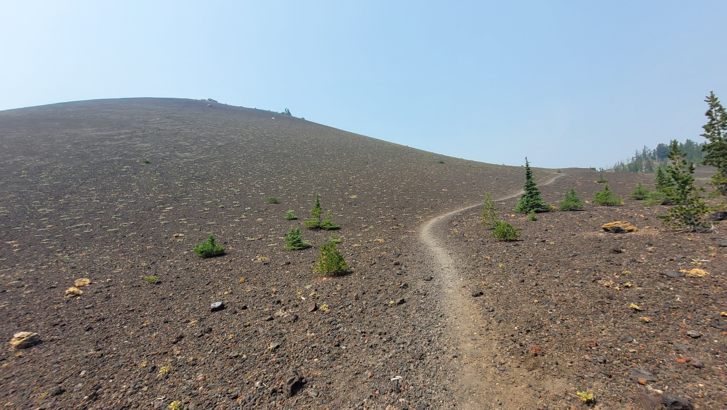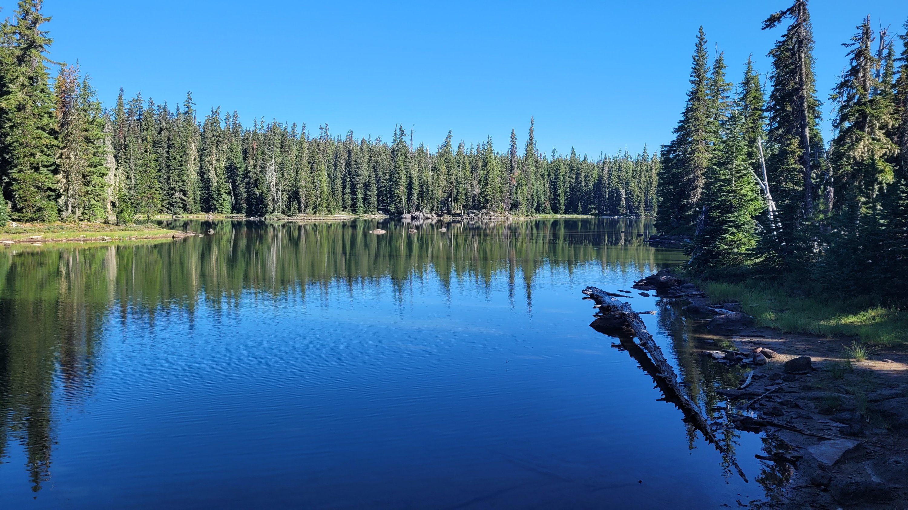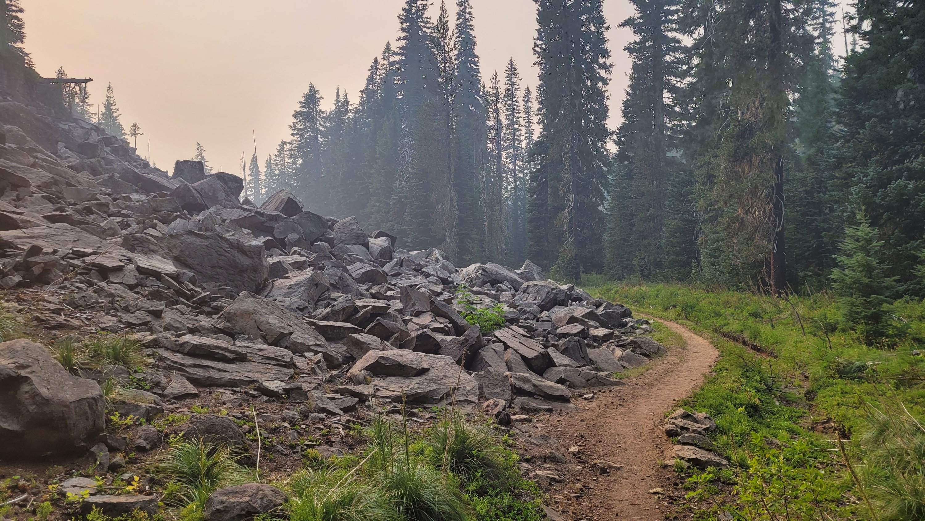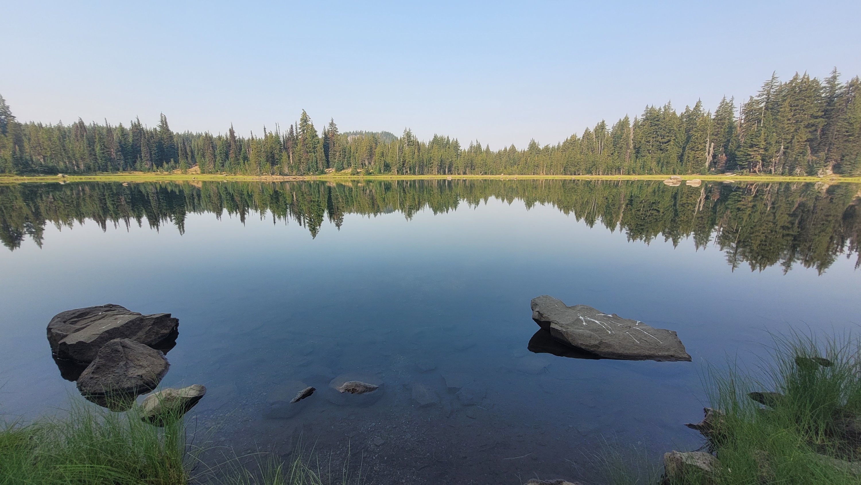 Nachdem ich kurzfristig noch umdisponiert habe Essen für reichlich 4 Tage zu nehmen und den umständlichen aber längeren Weg über Pamelia lake zurück zu nehmen ging es los. Per Anhalter dauert keine 5 min und ich sitze in einem Truck. Immer noch weit über 30 Grad und durch Feuer sehr rauchig . Durch die anhaltende Dürre sind die Seen auch deutlich kleiner, schlammiger und das Wasser warm und nicht ideal zum trinken. Nach einem langen Weg hoch bin ich am südlichen Ende des wegen Feuer gesperrten Gebiets, von hier an ist die Landschaft deutlich besser. Im Hintergrund sieht man Mt Jefferson.