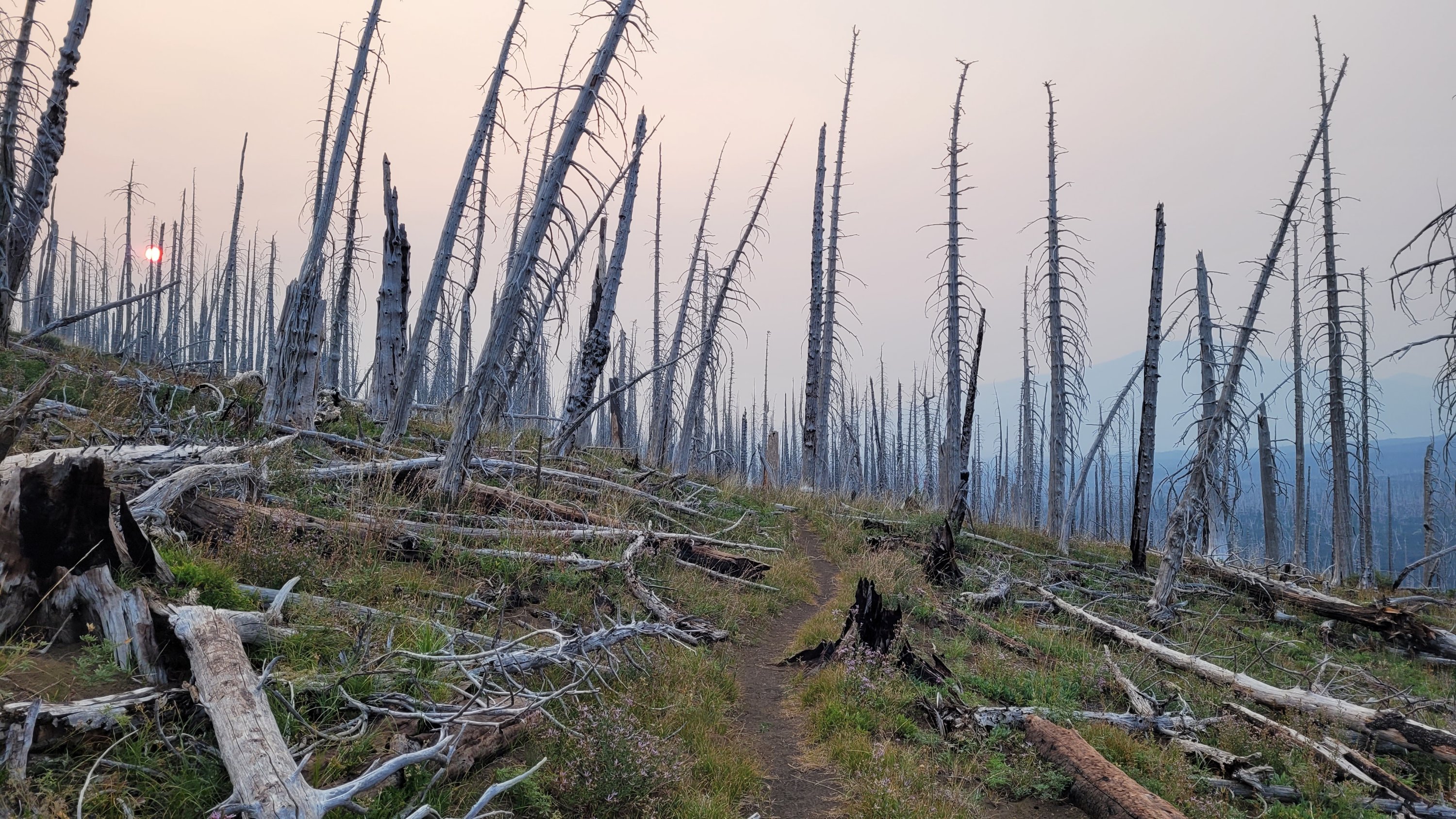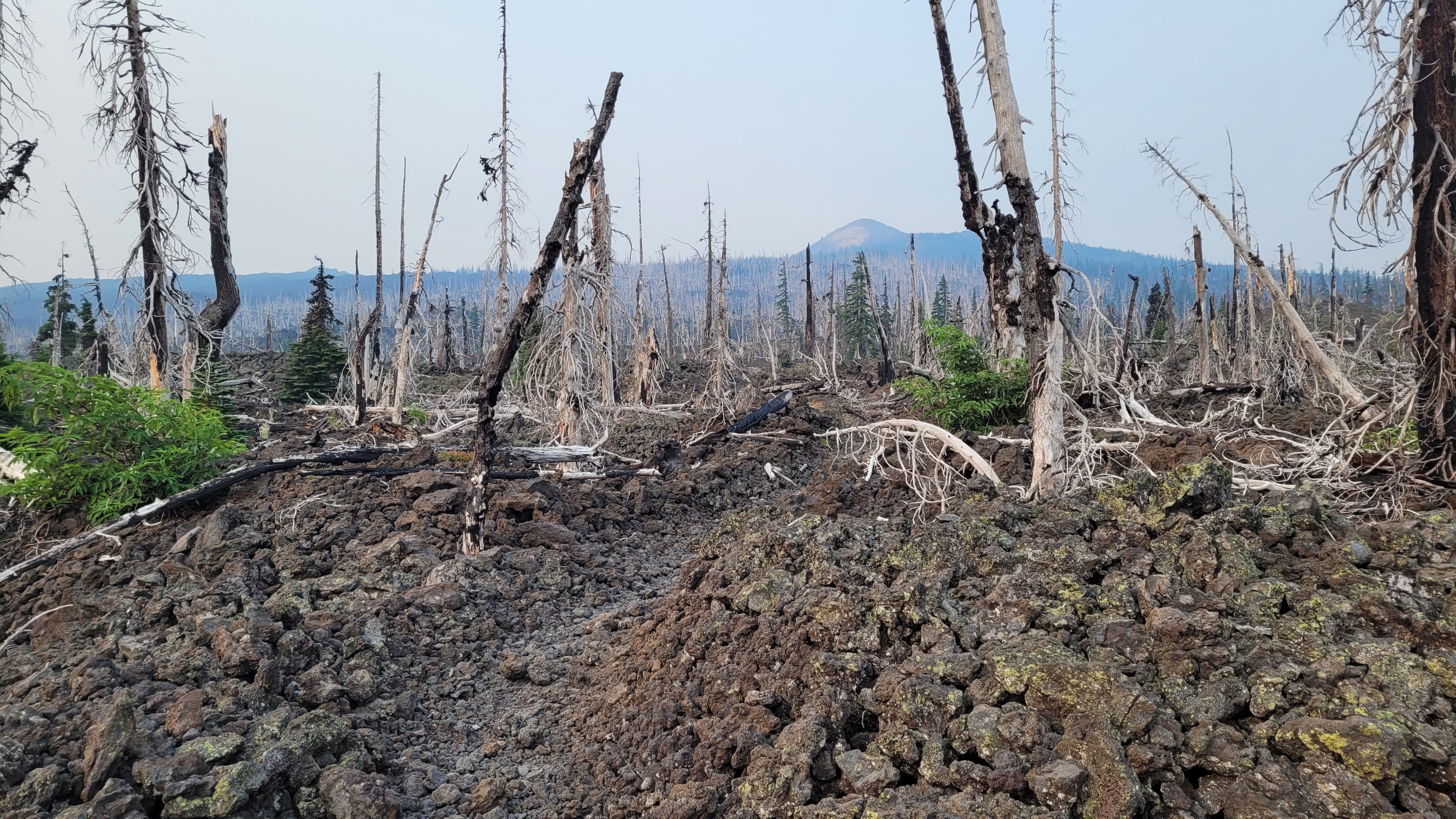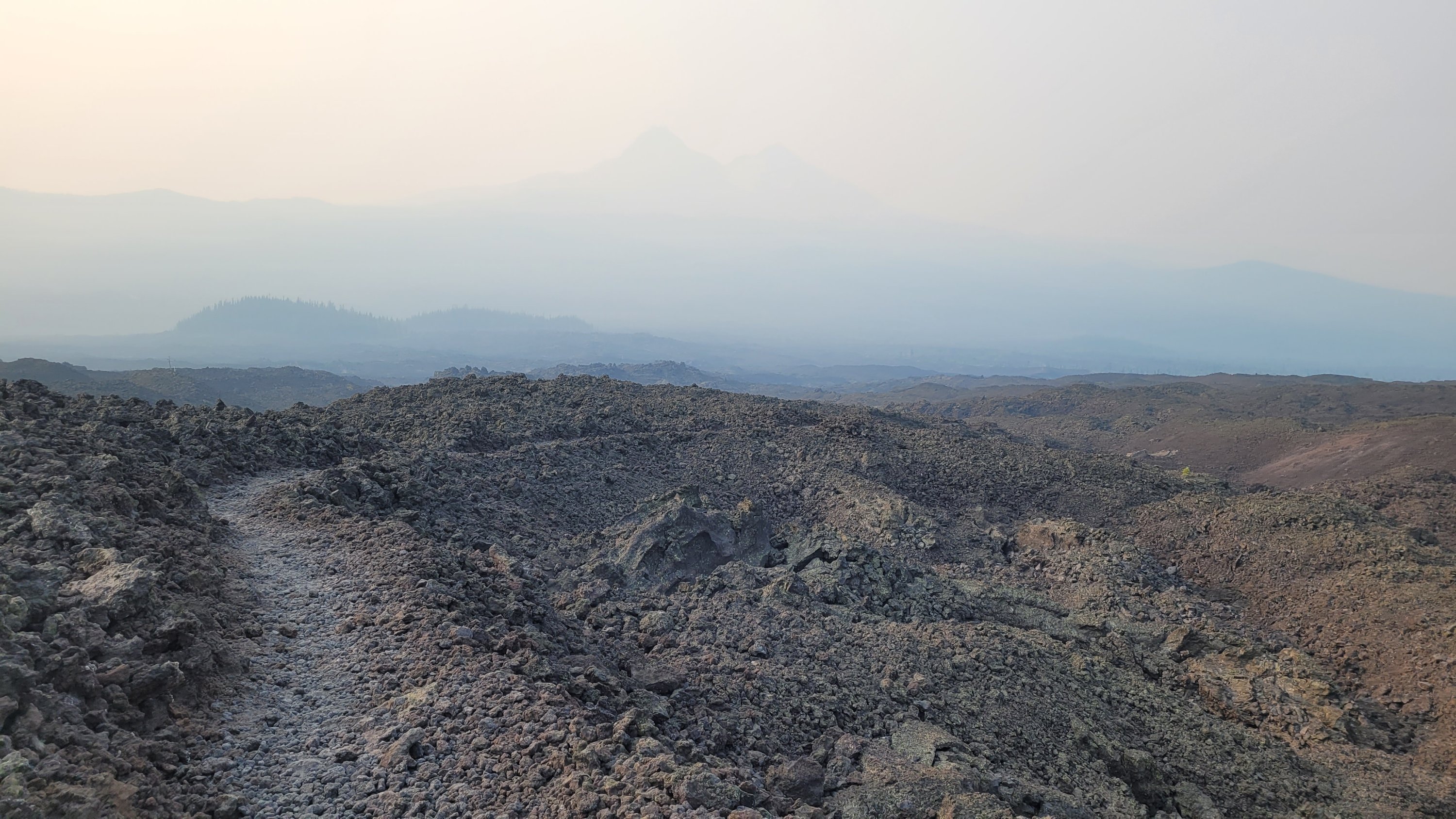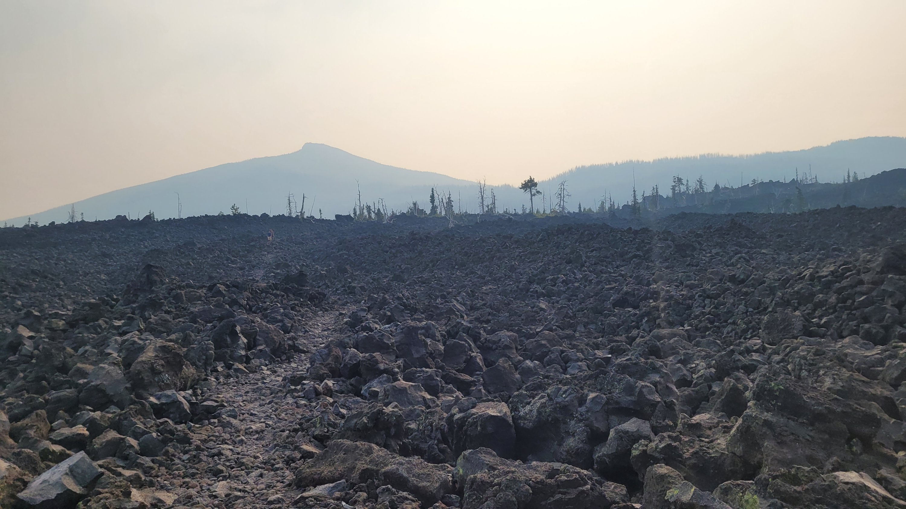Durch den Rauch ist die Sonne blutrot und es wird gar nicht richtig hell. Es sieht aus wie auf einem anderen Planeten. Zudem gibt es heute nur 1x Wasser aus einem Tümpel und dann 24km nichts. Das wird lustig mit 35 Grad. Am Ende des Tages kommt man bei einem Jugend Camp vorbei das wegen dem Feuer zurzeit geschlossen hat. Ich nutze das Wasser um mich zu duschen und bekomme von einem Mitarbeiter eine eingepackte Mahlzeit wie sie sonst die Armee benutzt. Nachdem ich 3L Wasser getrunken habe muss ich wieder Wasser bis morgen Nachmittag schleppen. Diesmal über ein Lavafeld…