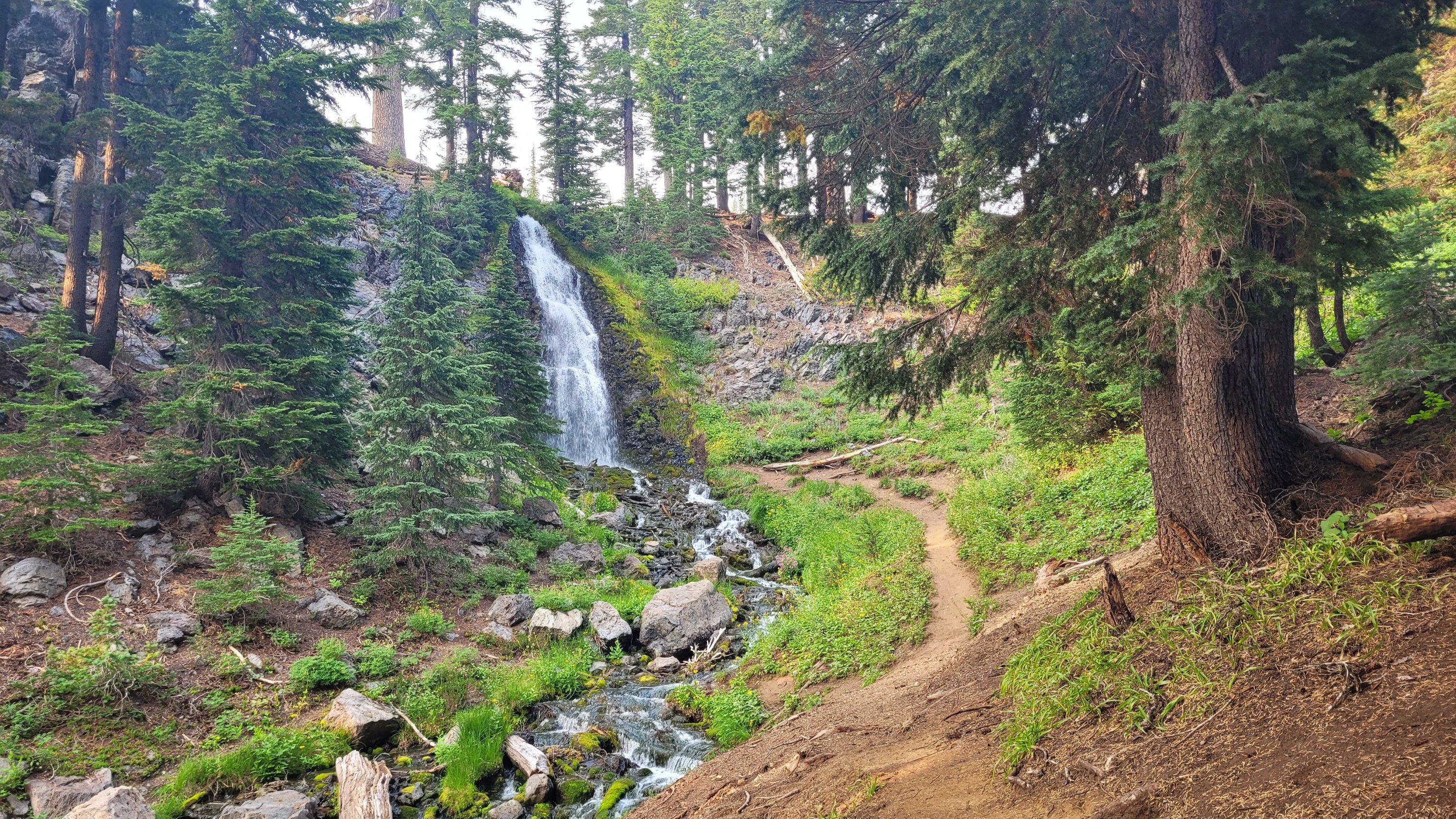 Es geht also früh durch verbrannten Wald und irgendwann lava. Surreal mit dem Rauch und der Dunkelheit. Nach endloser Trockenheit und viel Sonne kommt endlich eine eiskalte Quelle im Nirgendwo. Es ist so heiß ich muss mich mehrere Stunden in den Schatten legen und durchweg an meine Flasche nuckeln um halbwegs runter zu kommen. Abends kommt dann noch eine Quelle die den Wasserfall mit Wasser versorgt. Dort esse ich genüsslich mein Abendessen um danach noch ein paar Meilen vorwärts zu kommen. Durch die Hitze komme ich nicht mal annähernd an die 30 Meilen/48km. Im Hintergrund sieht man den ganzen Tag die 3 Sister’s Vulkane.