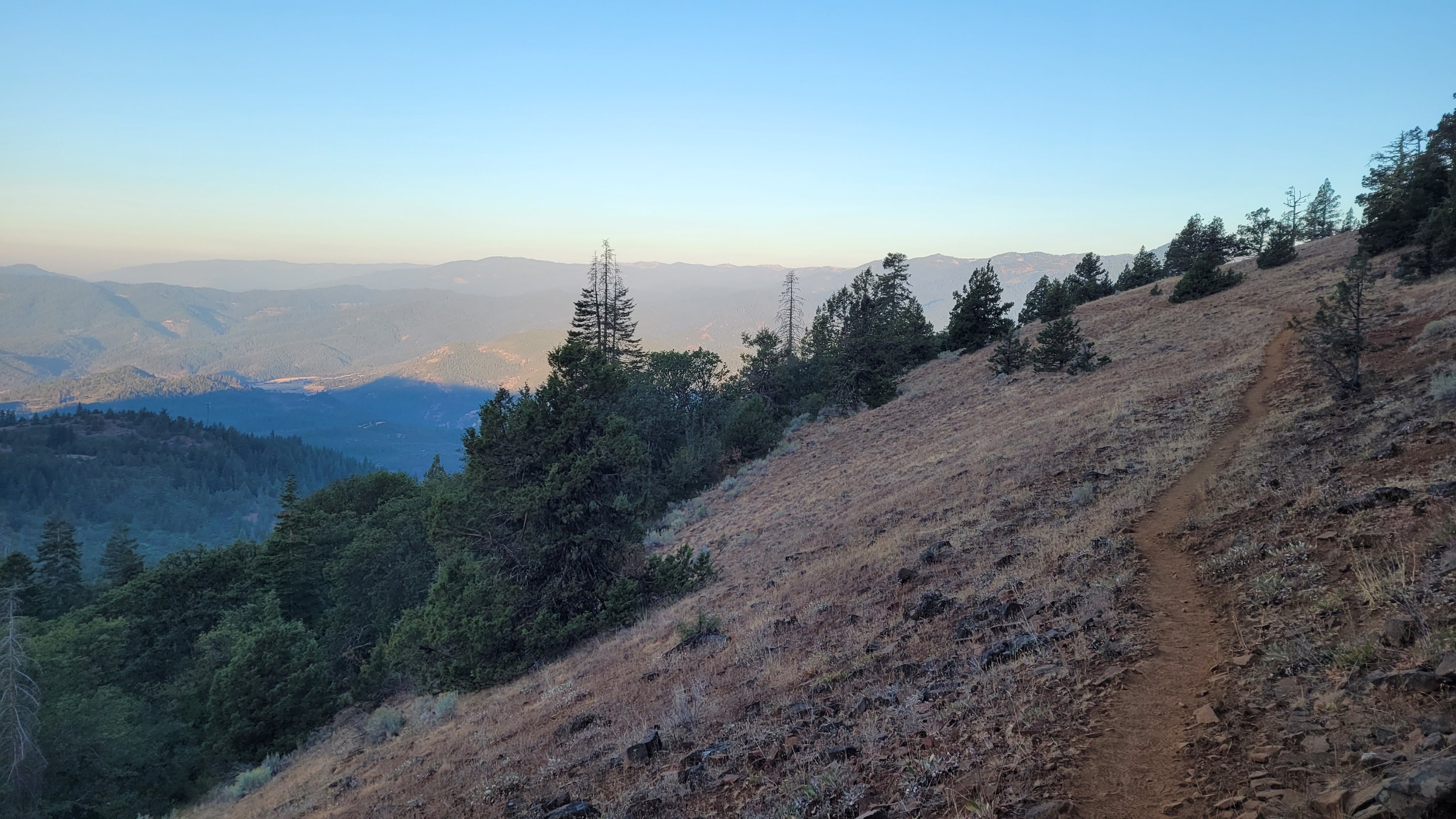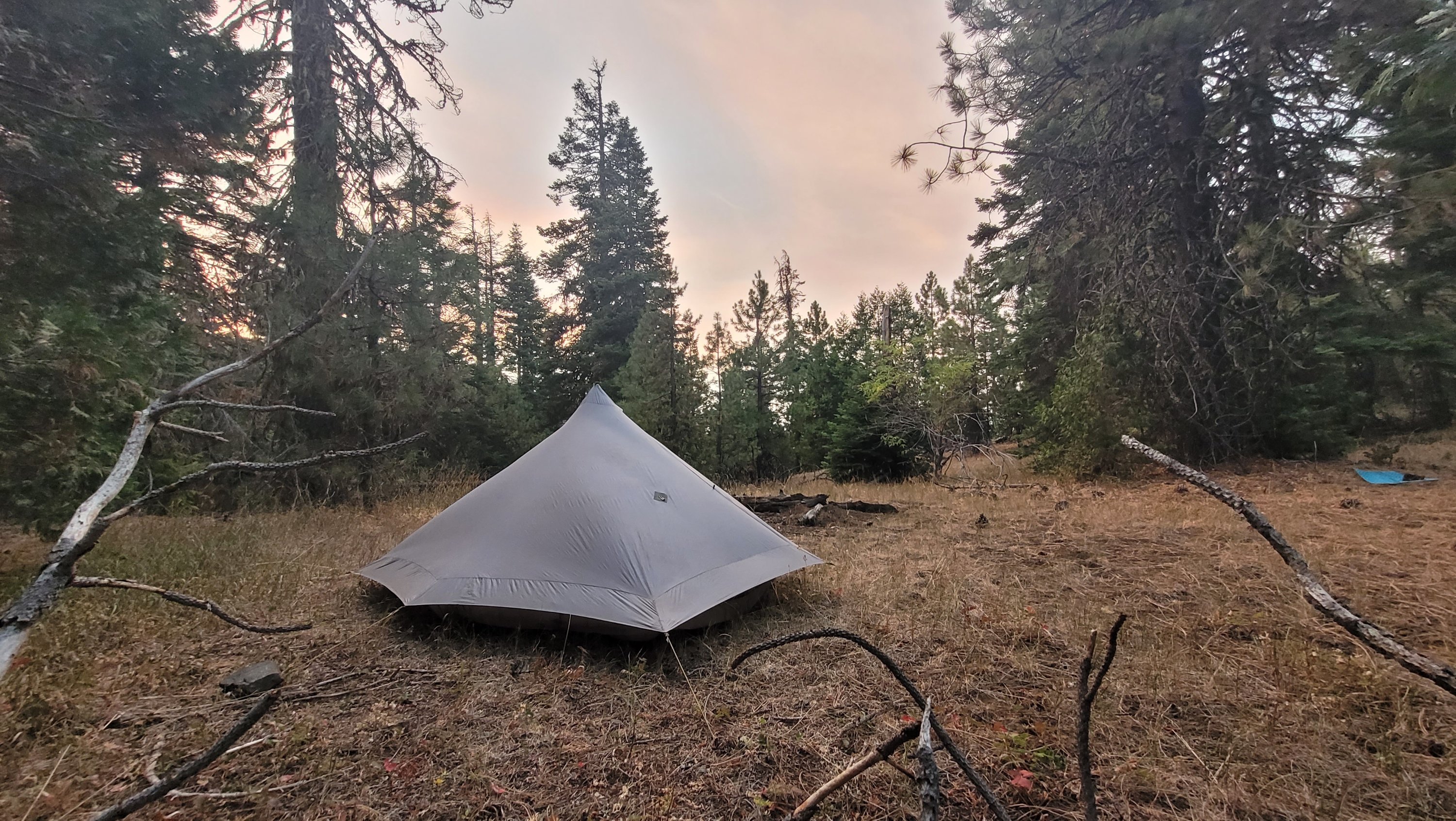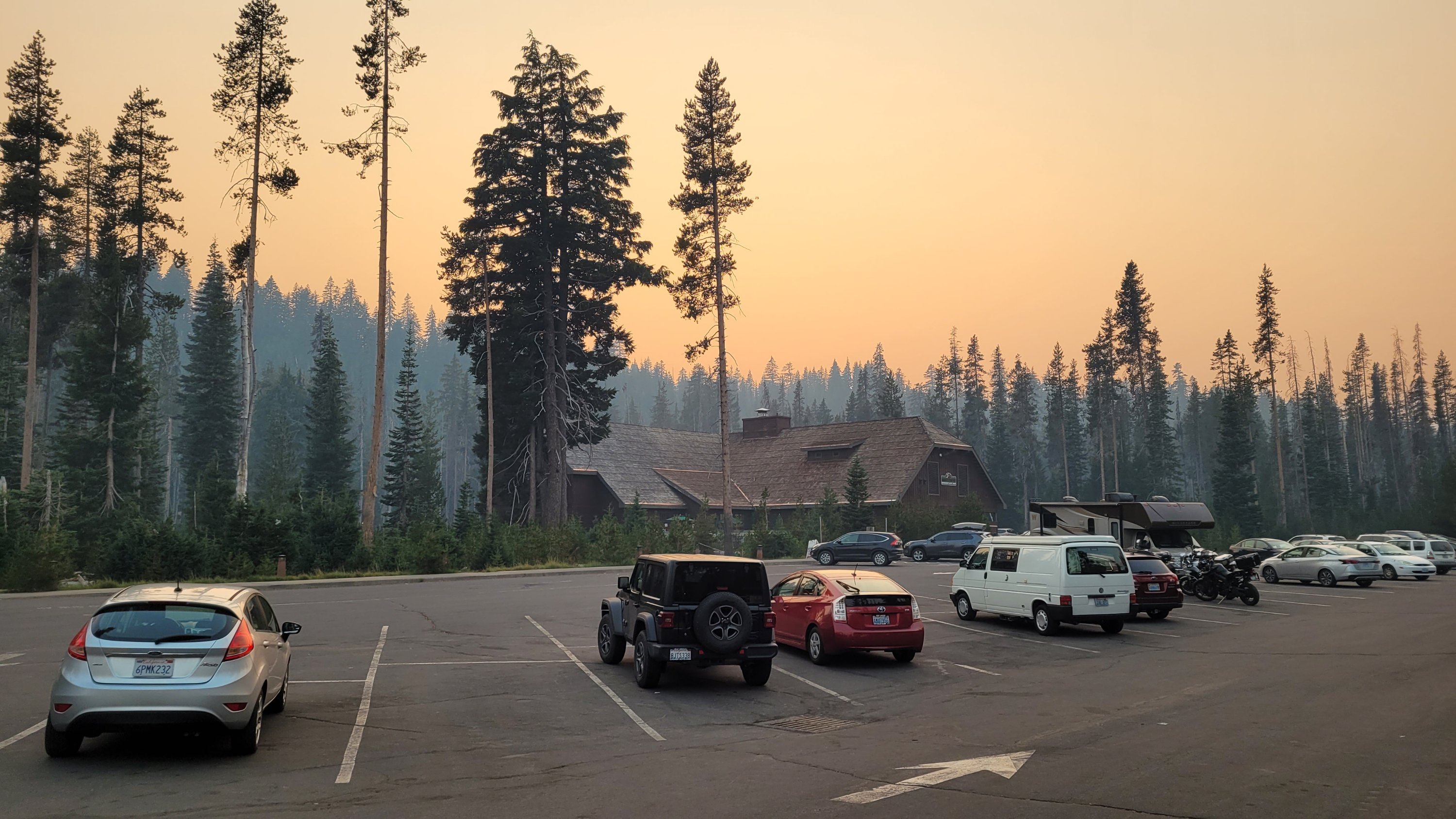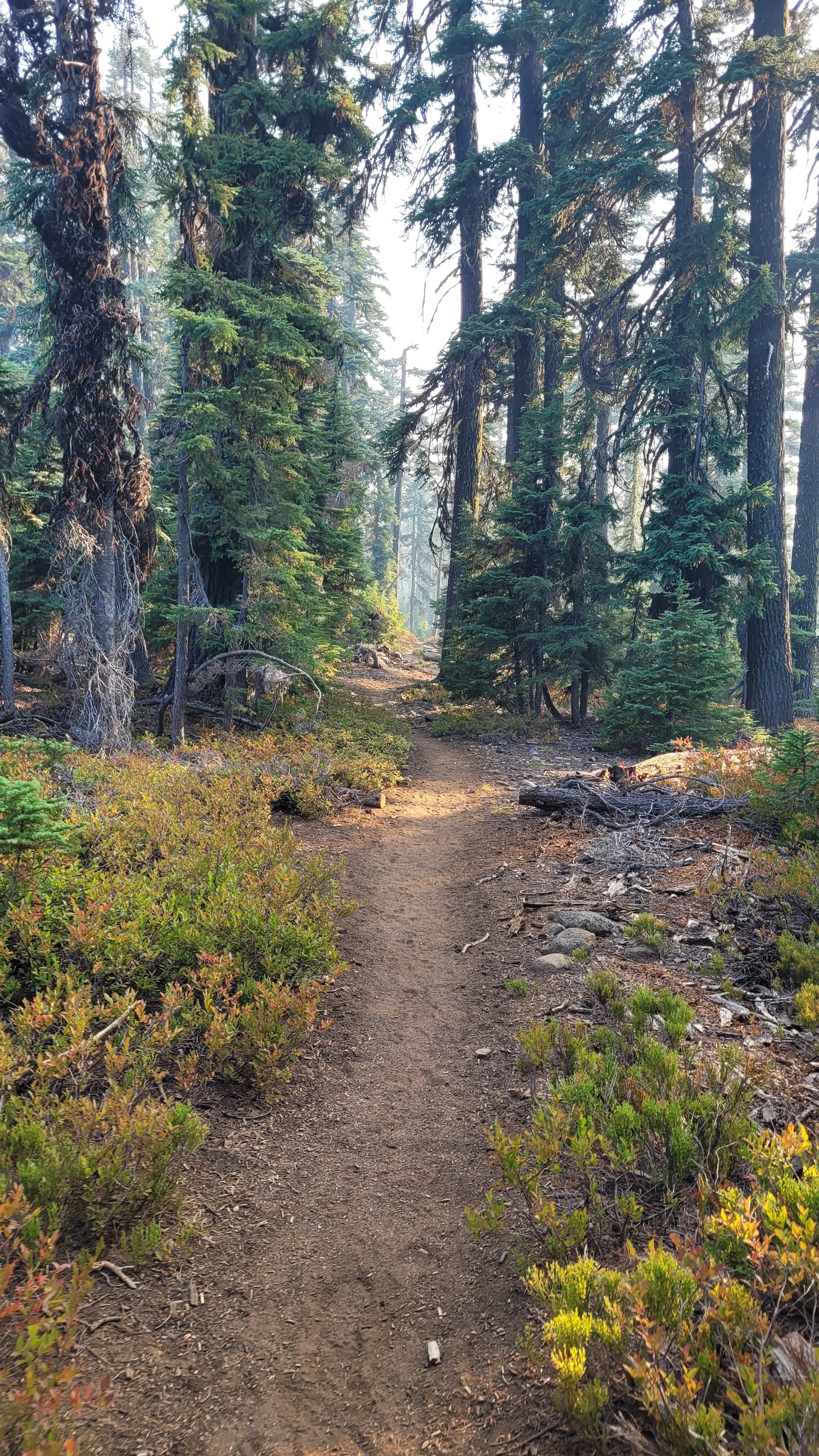 Abends sieht es wieder rauchig aus. Es ist den ganzen Tag über kühl und auch nachts ist es nur knapp über dem Gefrierpunkt. Nachdem alles aufgeladen ist und ich mir wieder Essen von anderen und dem kleinen Laden zusammenstellen musste ging es weiter. Es gab den kompletten Tag kein Wasser und viel verbrannten Wald. Ich hab mir vorher gut 2l Wasser reingekippt aber das hilft leider auch nur bedingt. Es gab nicht mal Frühstück in Crater Lake wodurch ich früh schon süßes Essen musste. Abends gab es dann komplett kostenloses Essen aus der Hiker box das andere nicht wollten.