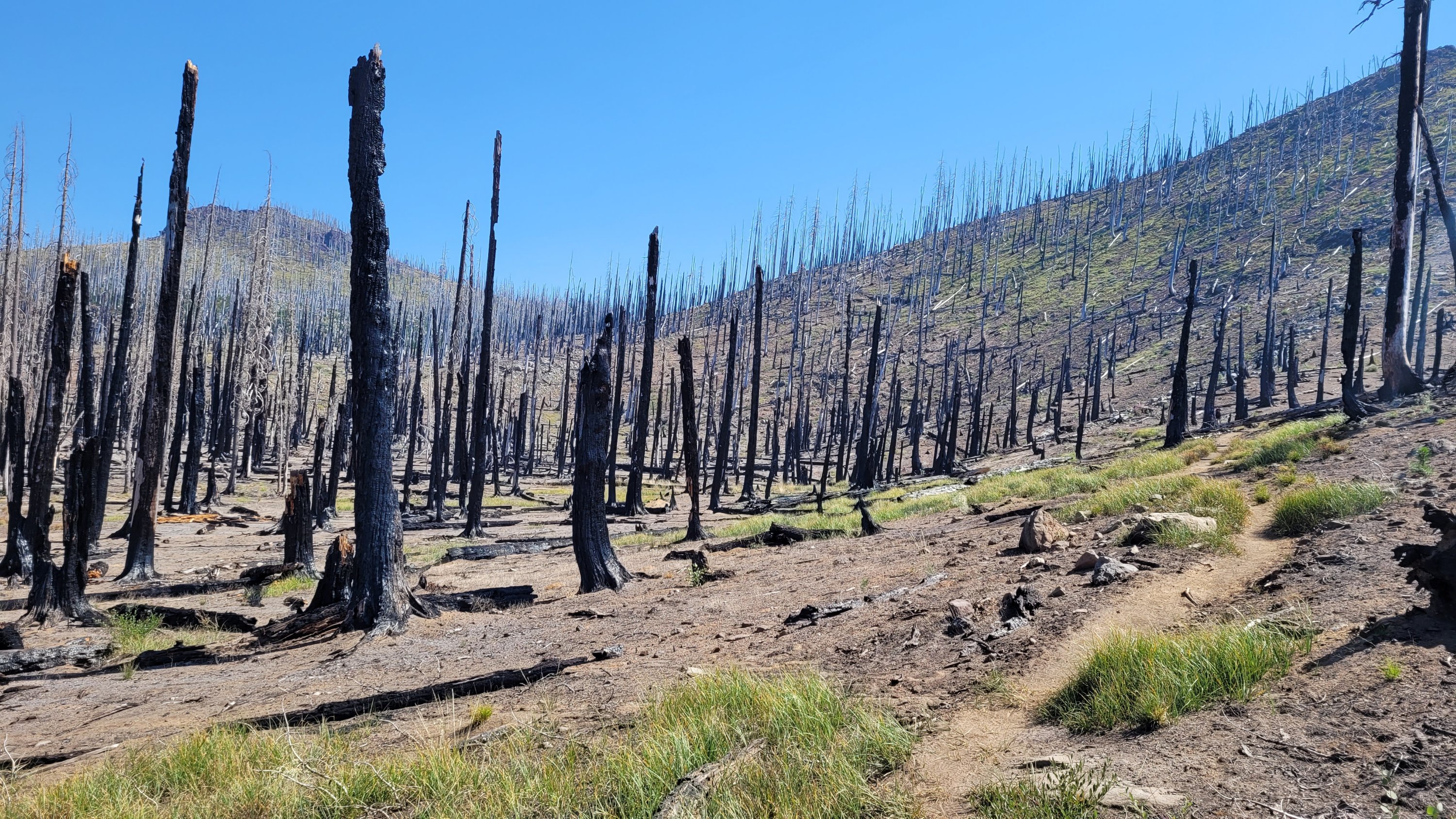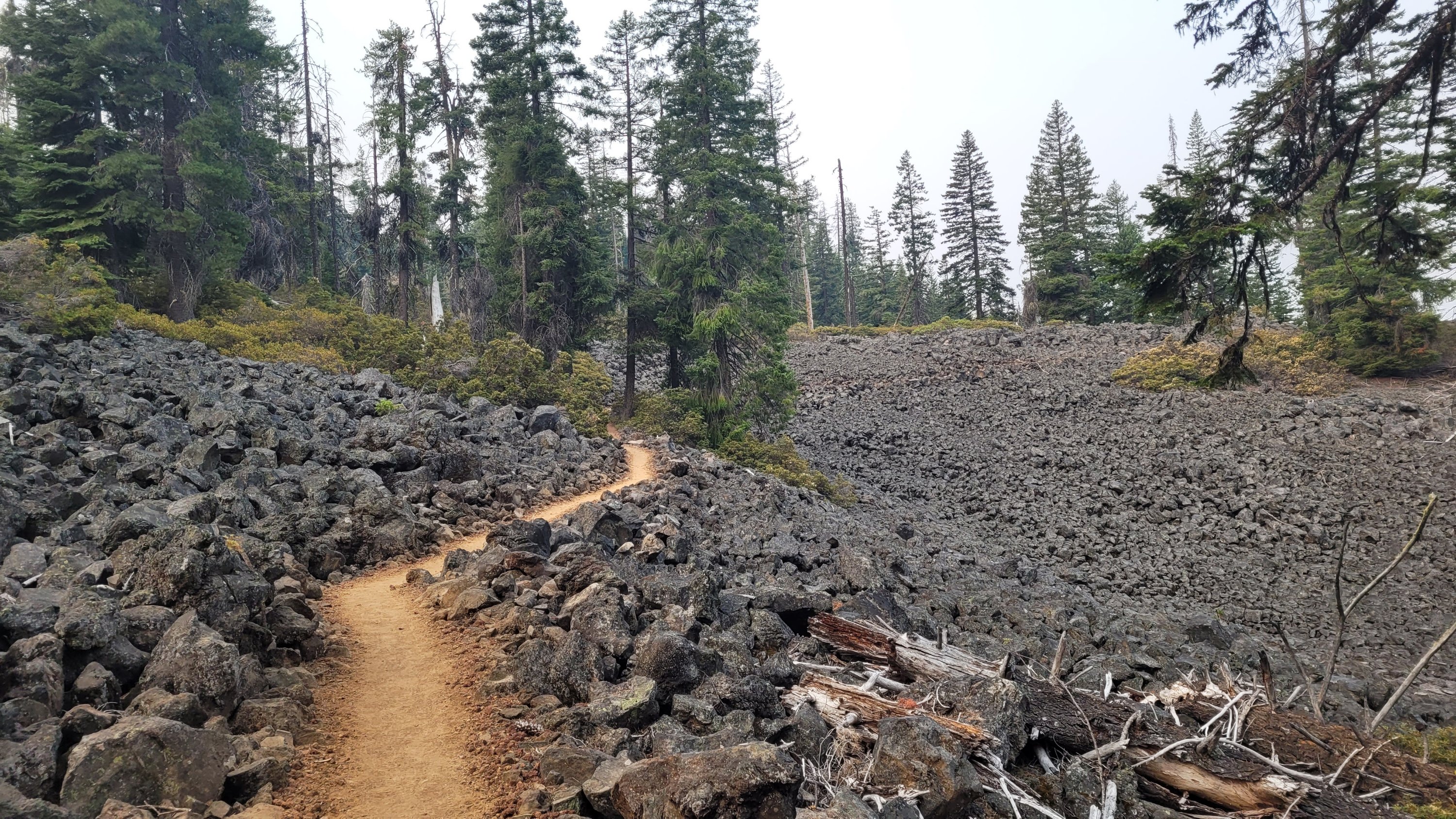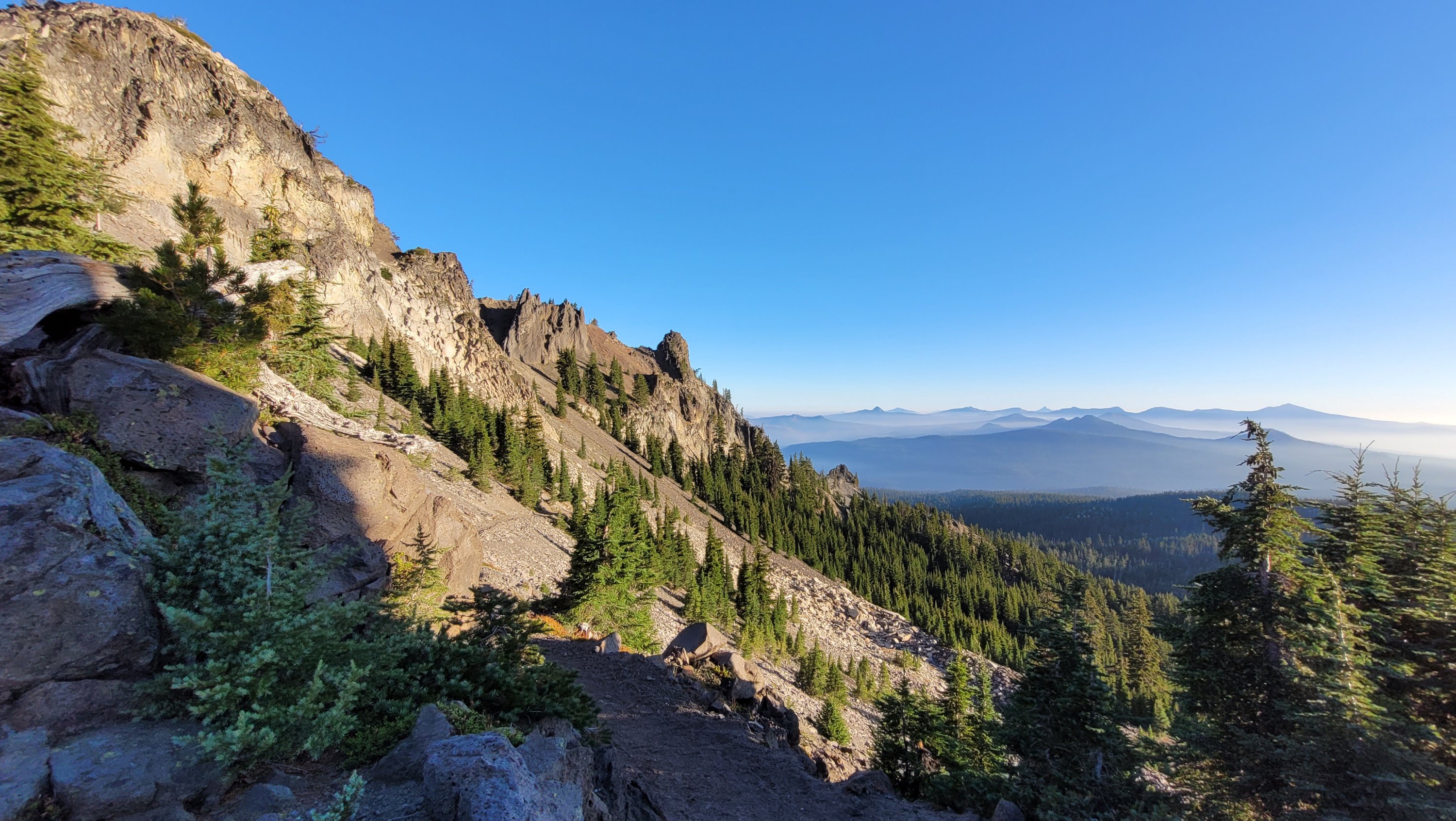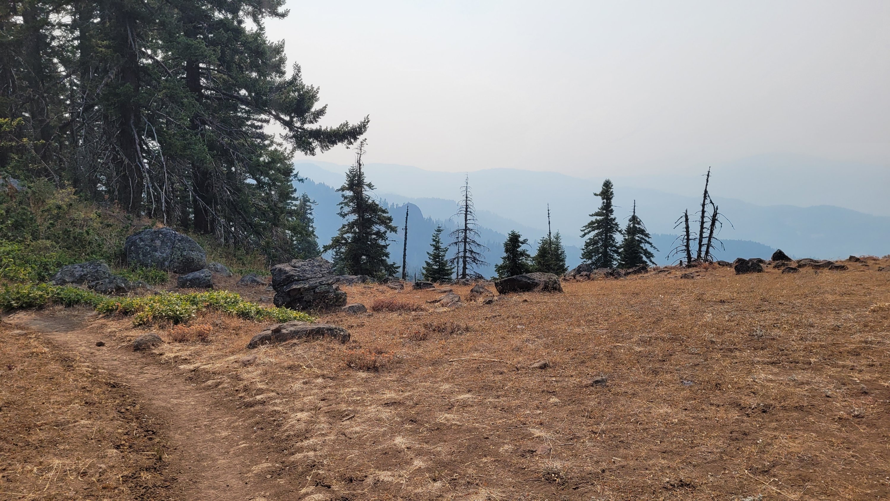 Abends sieht es wieder rauchig aus. Es ist den ganzen Tag über kühl und auch nachts ist es nur knapp über dem Gefrierpunkt. Nachdem alles aufgeladen ist und ich mir wieder Essen von anderen und dem kleinen Laden zusammenstellen musste ging es weiter. Es gab den kompletten Tag kein Wasser und viel verbrannten Wald. Ich hab mir vorher gut 2l Wasser reingekippt aber das hilft leider auch nur bedingt. Es gab nicht mal Frühstück in Crater Lake wodurch ich früh schon süßes Essen musste. Abends gab es dann komplett kostenloses Essen aus der Hiker box das andere nicht wollten.