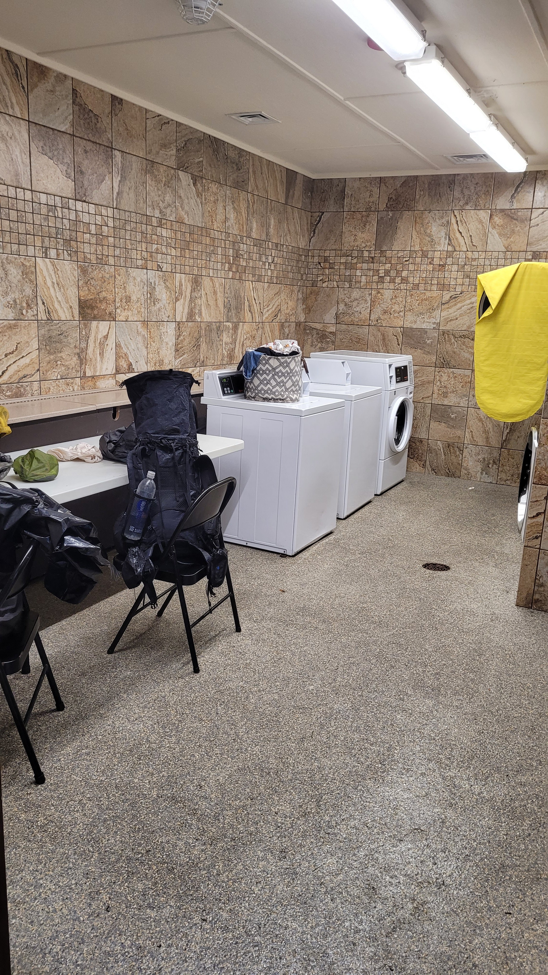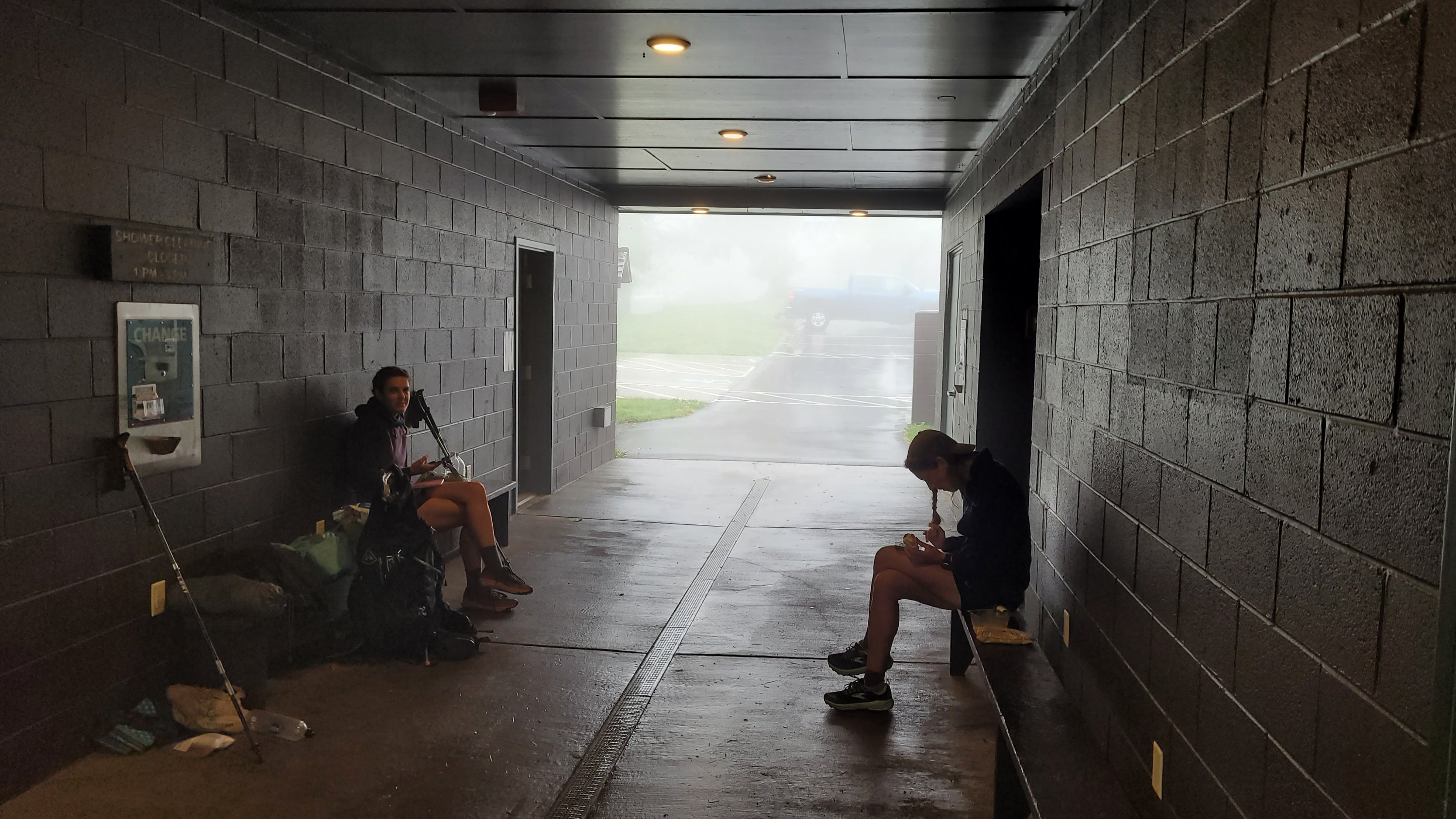 Es hat dann auch die ganze Nacht geregnet. Alles fühlt sich früh komplett nass an. Zum. Glück ist ein Campingplatz mit Wäscheraum in der Nähe wo man alles in den Trockner schmeißen kann. Ohne das wäre das Tag miserabel geworden. Nach mehreren Stunden herumsitzen sind wir dann noch ein Stück gelaufen und in der Dunkelheit in einer Hütte angekommen. Diese ist heute echt ein Lebensretter da es auch diese Nacht komplett durch regnet…