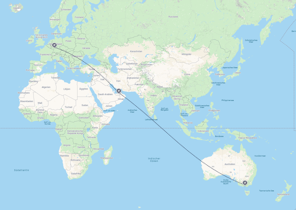 Ich werde am 18.02.2025 nach Australien fliegen. Der Reiseplan ist 7h Flug nach Oman und von dort nochmal gemütliche 13h nach Melbourne. Von dort werde ich mich direkt auf den Weg in einen Ort namens Walhalla machen um von dort den Australian Alps Walking Trak zu starten.